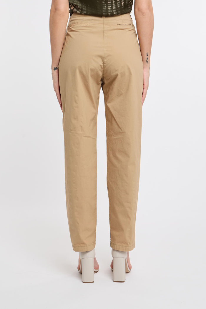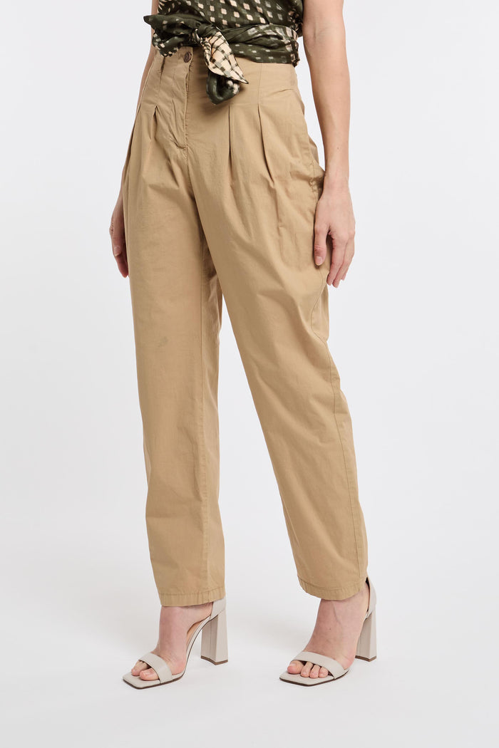 Pantalone in cotone con alamari e chiusura frontale con bottone e zip. Due tasche america laterali e due tasche a filo sul retro. La modella è alta 178 cm e indossa la taglia 40.