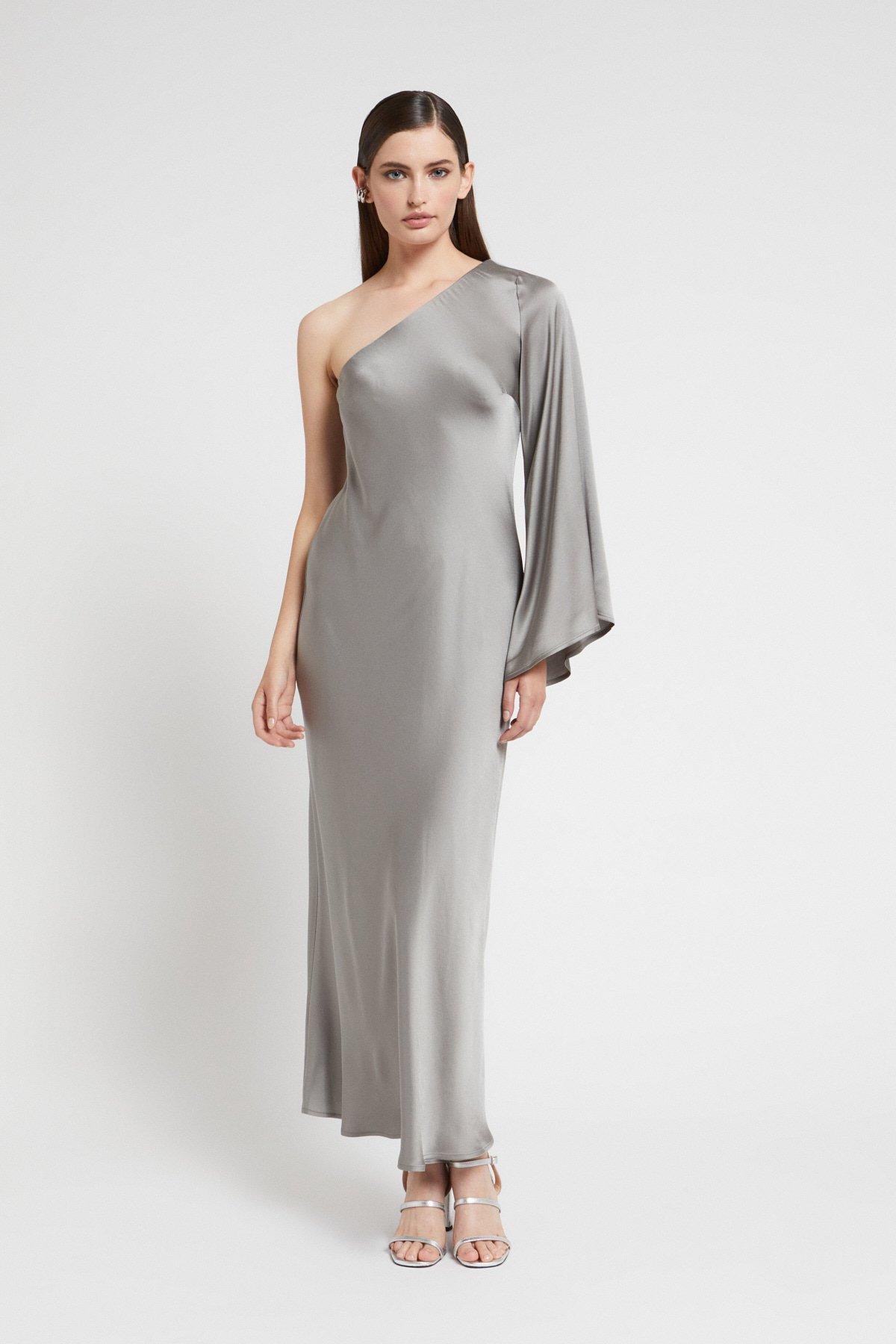 Abito lungo e fluido in 100% viscosa, monospalla, con manica ampia. La modella è alta 178 cm e indossa la taglia 40.