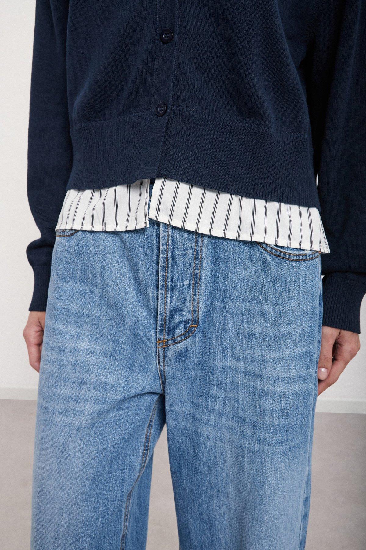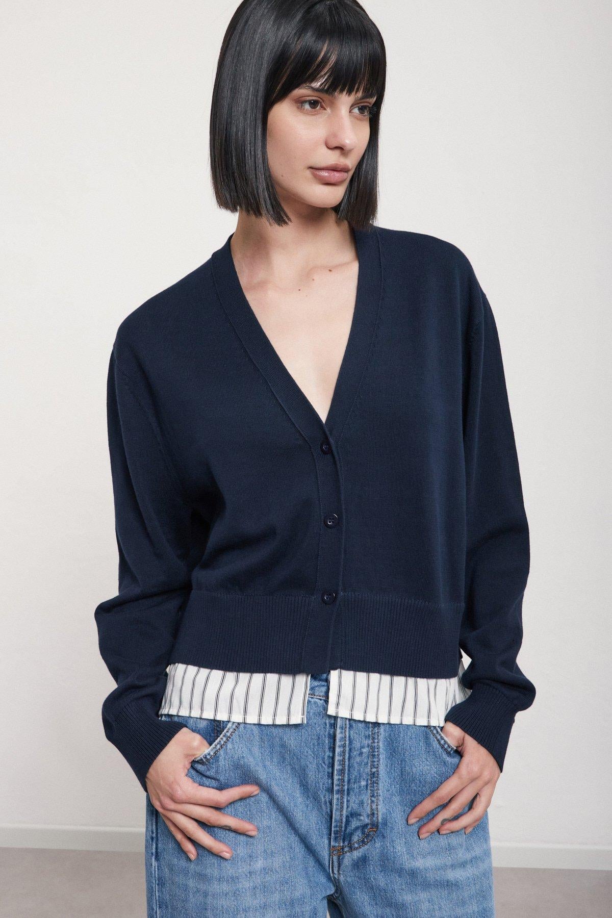 Cardigan in viscosa con balza in cotone e bottoni. La modella è alta 178 cm e indossa la taglia S.