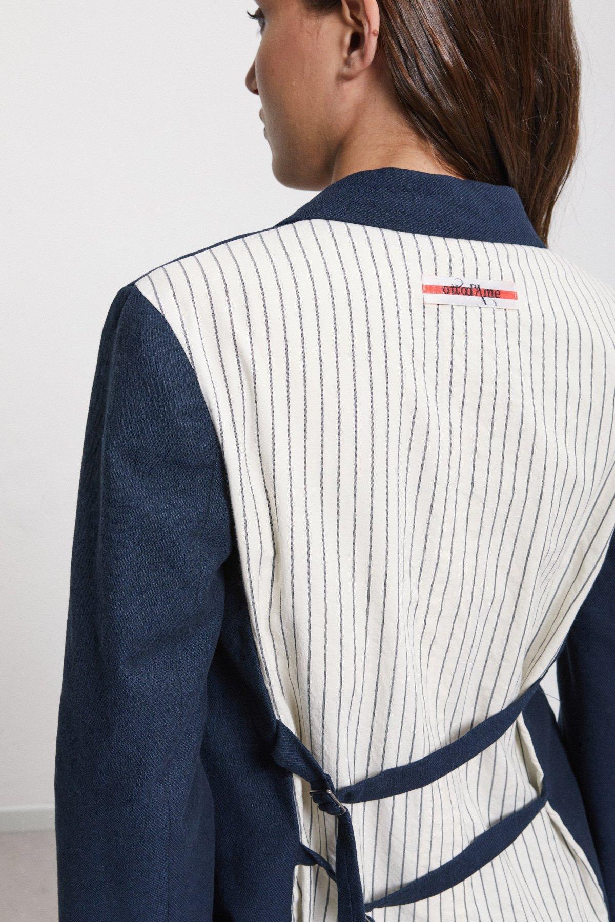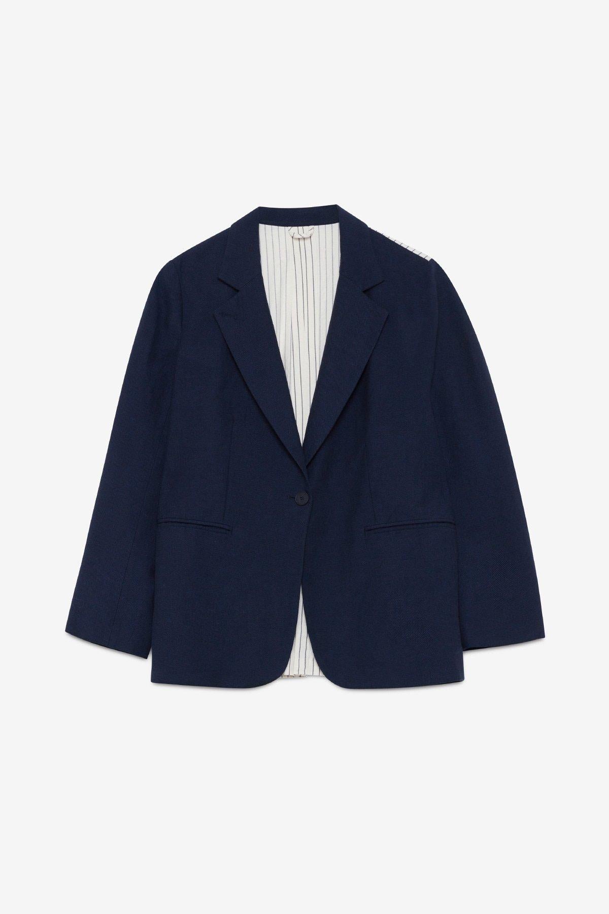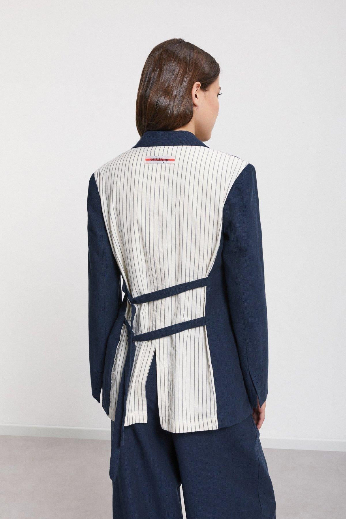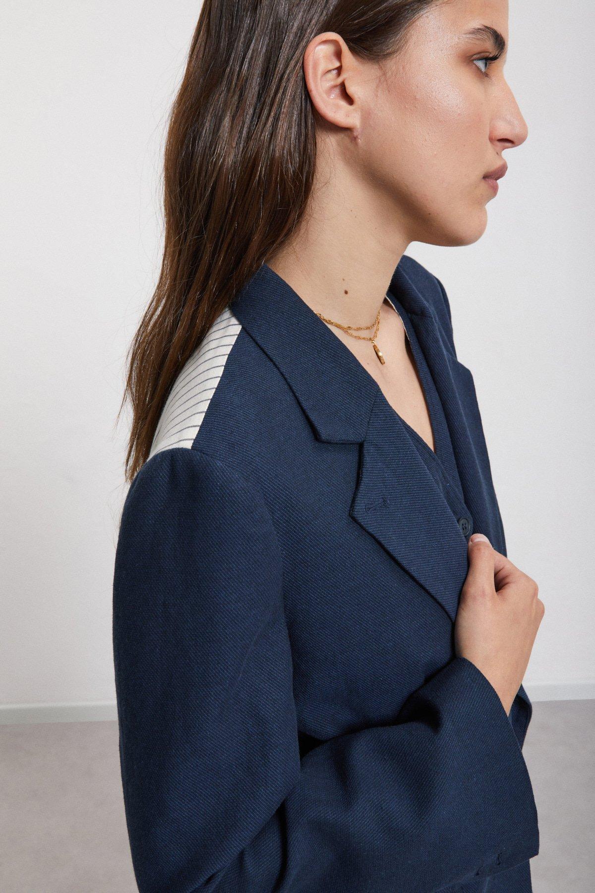 Giacca in lino realizzata con tessuto tinta unita e tessuto gessato. La modella è alta 178 cm e indossa la taglia 40.