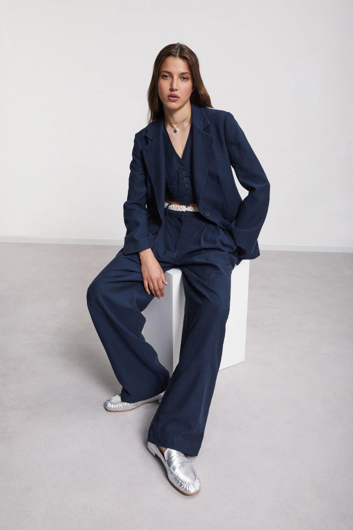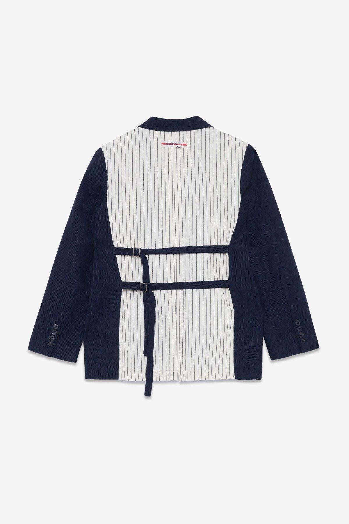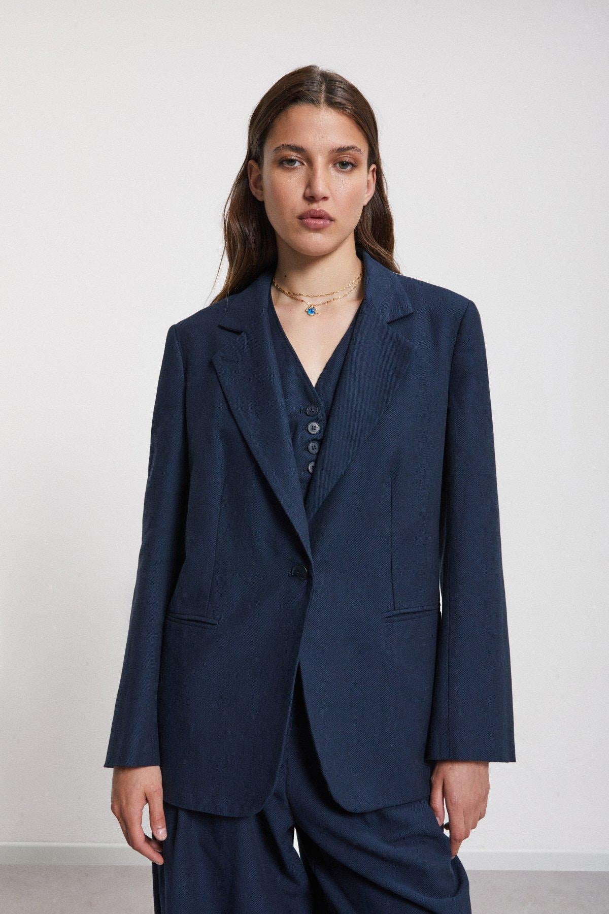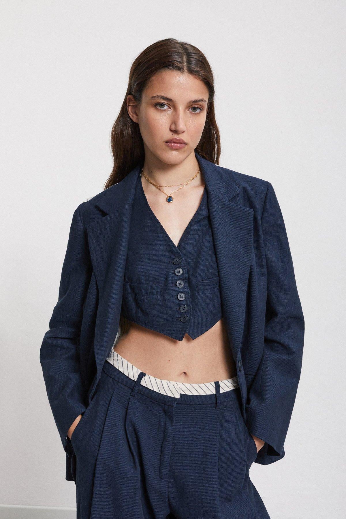 Giacca in lino realizzata con tessuto tinta unita e tessuto gessato. La modella è alta 178 cm e indossa la taglia 40.