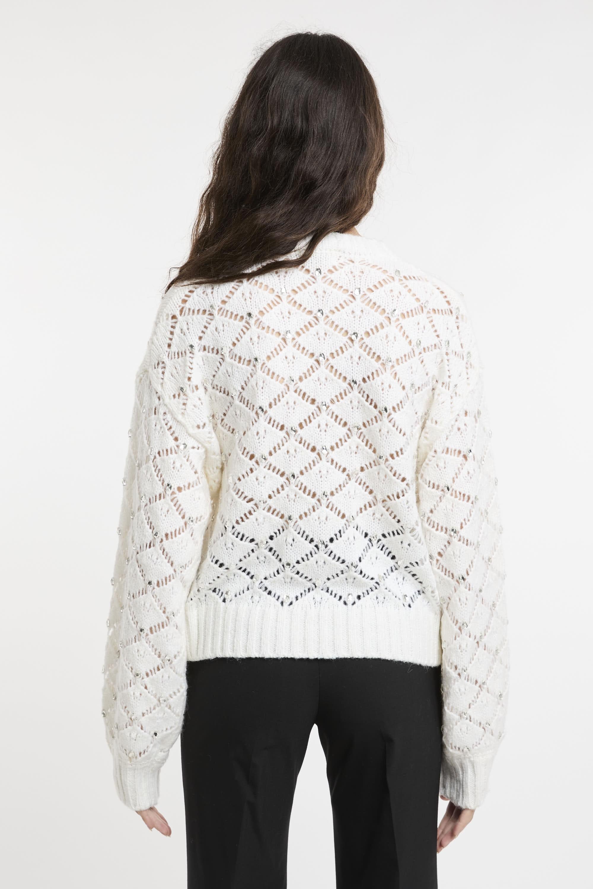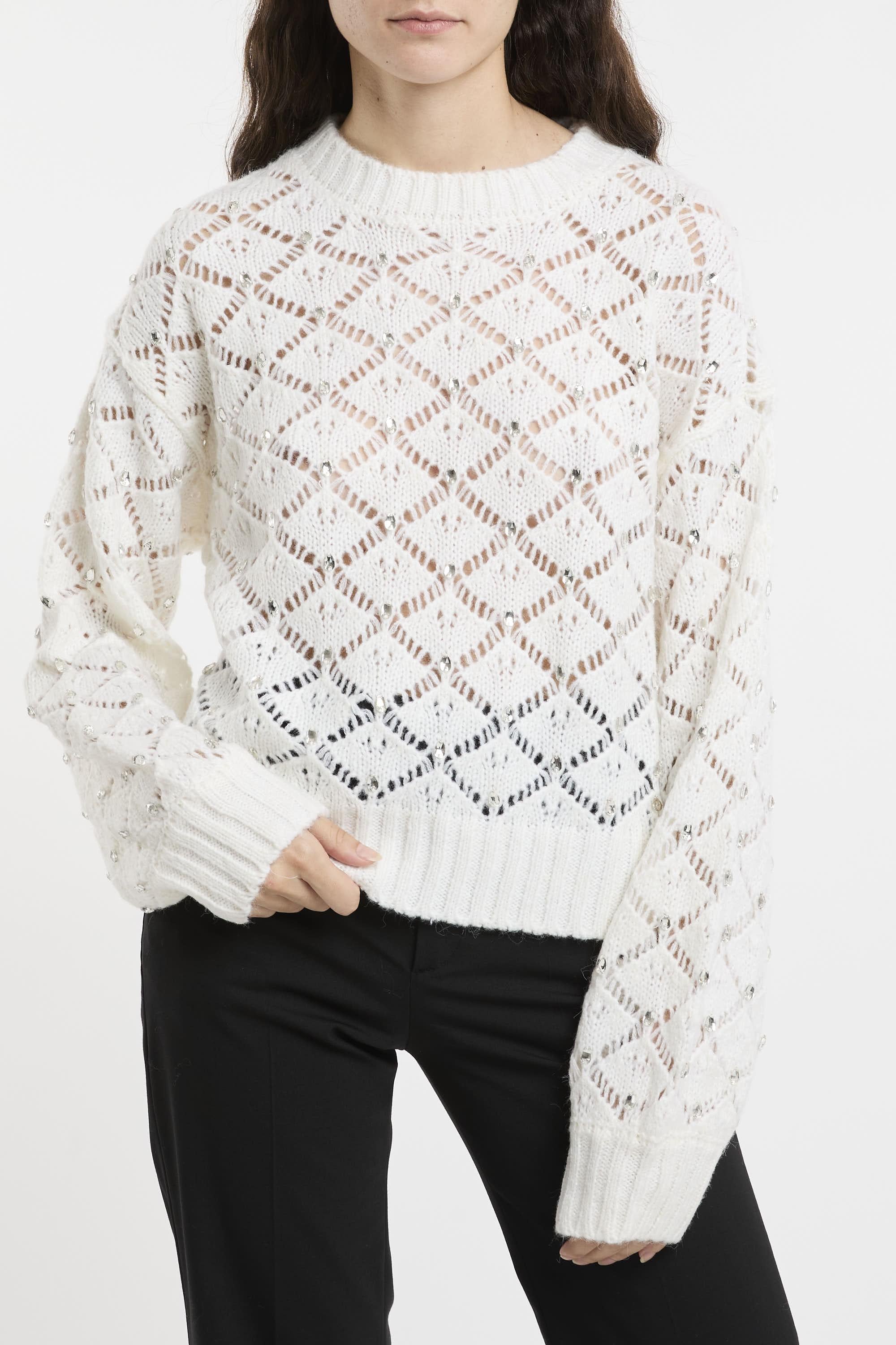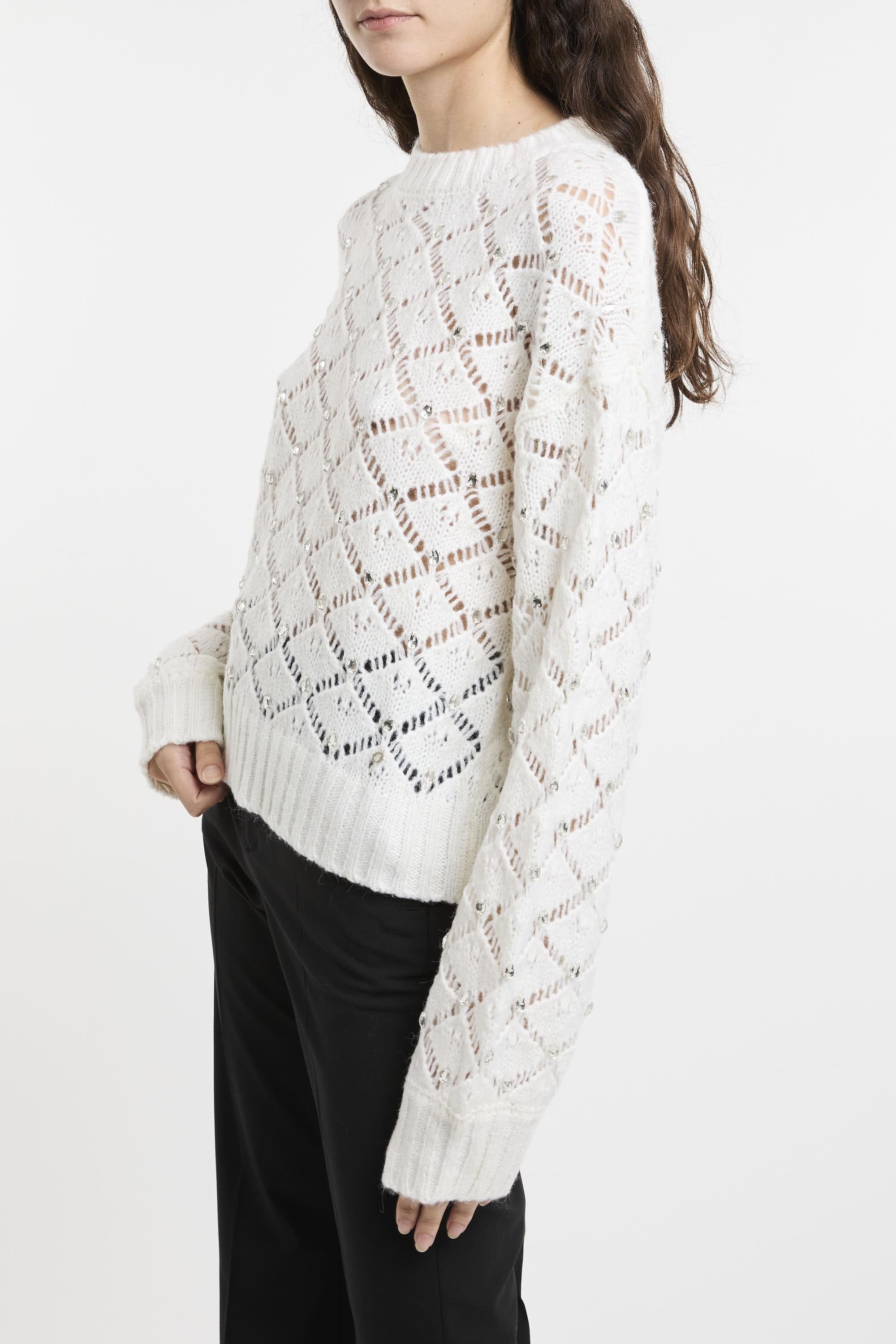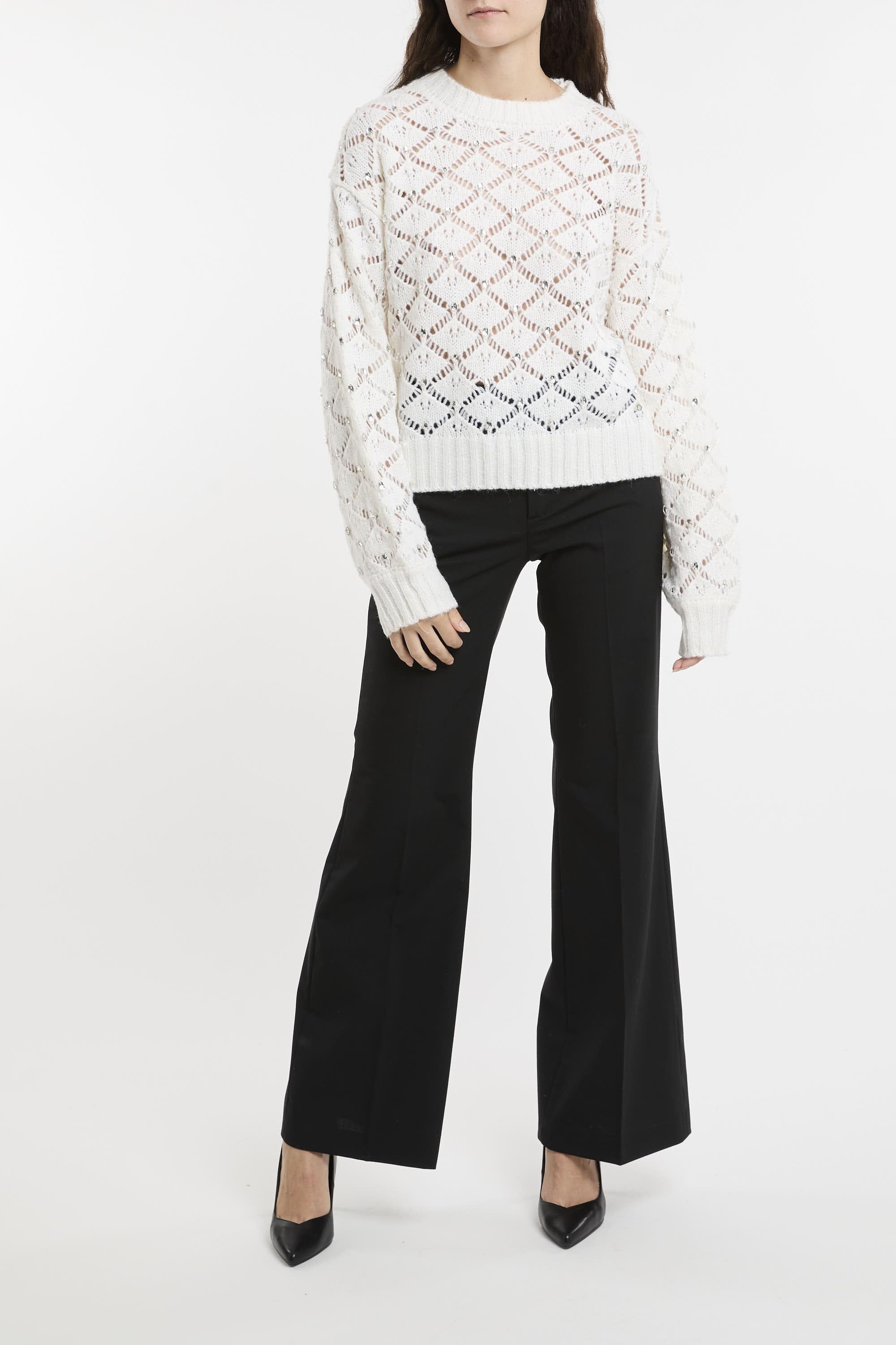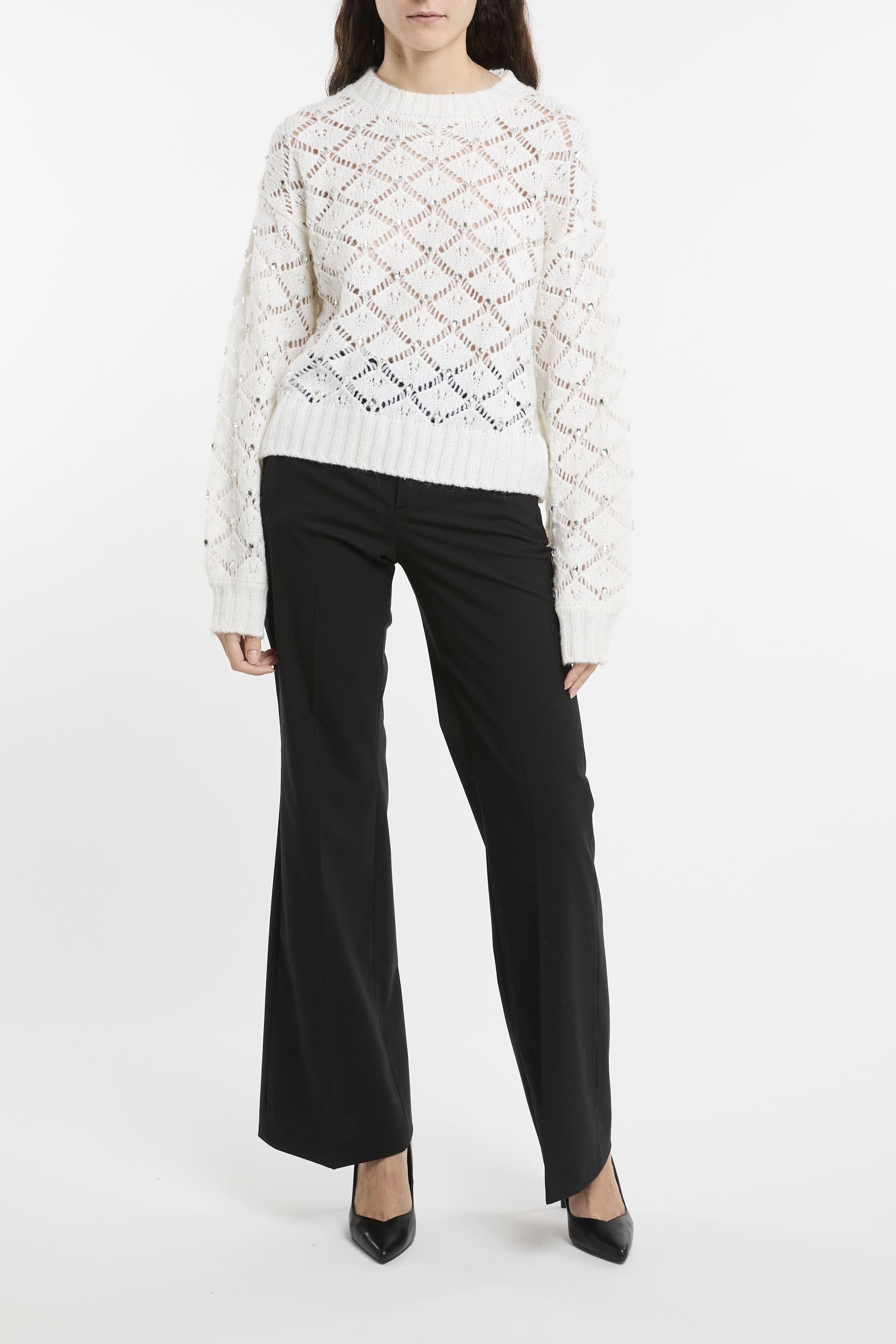 Maglione traforato con scollo tondo. La modella è alta 178 cm e indossa la taglia S.