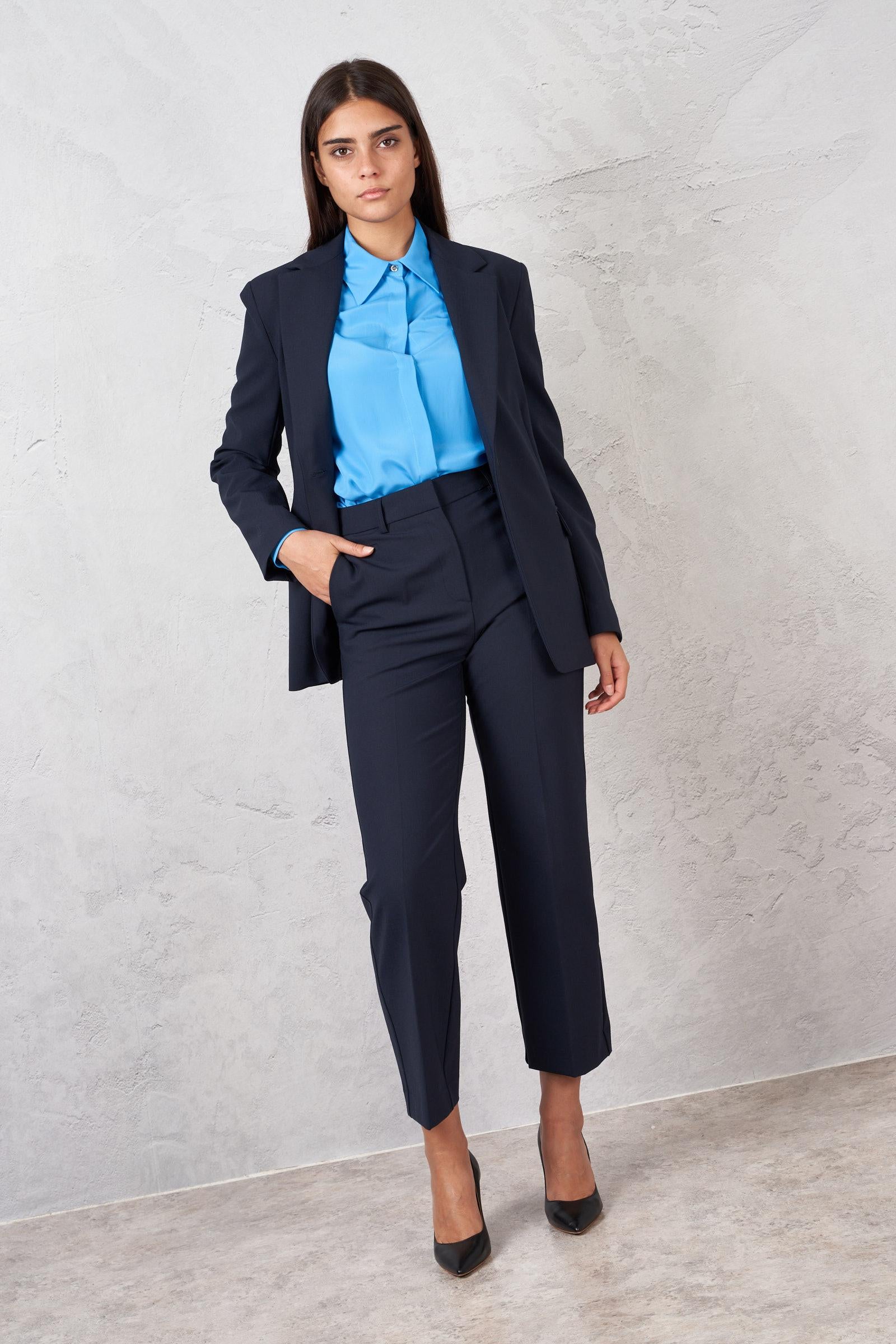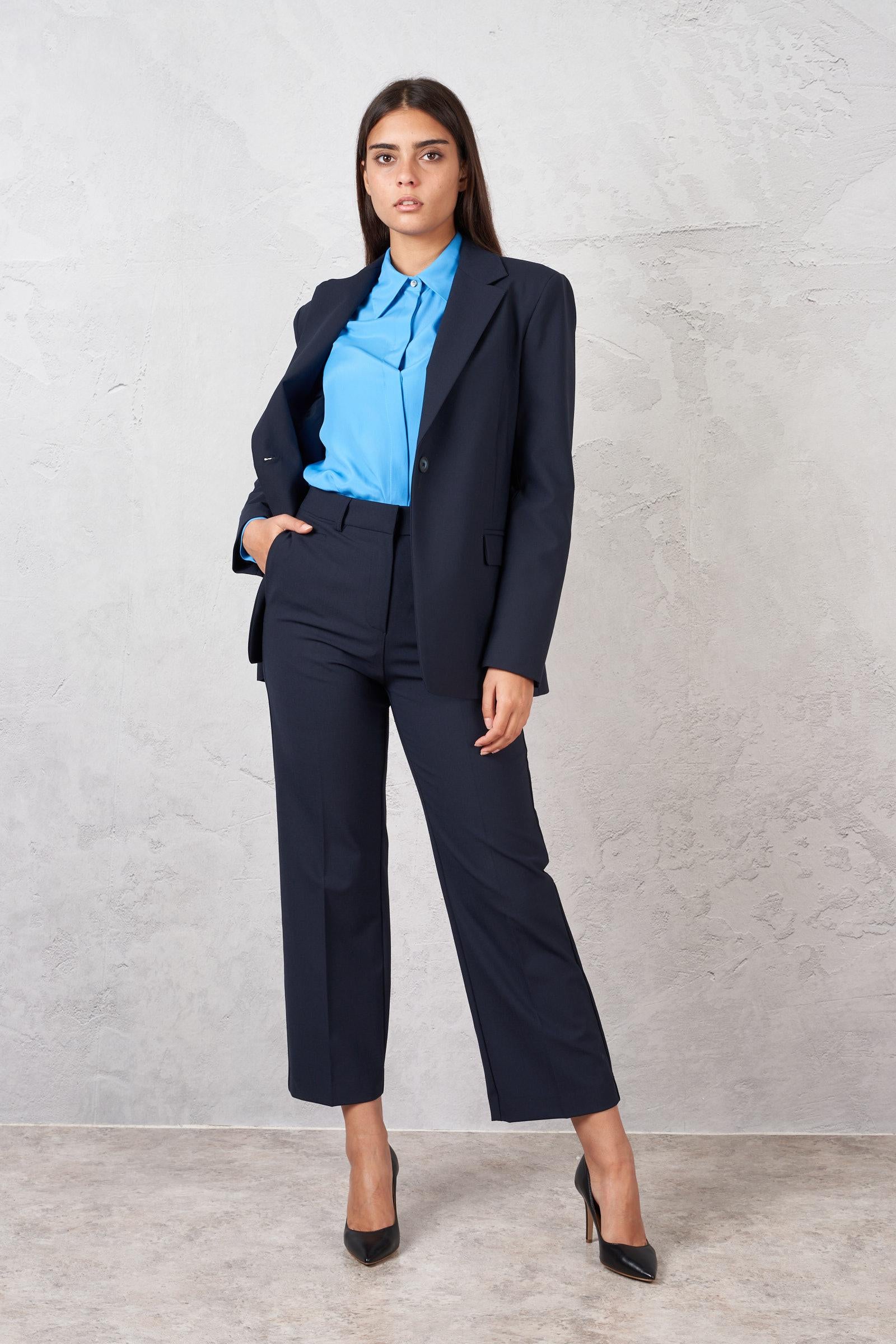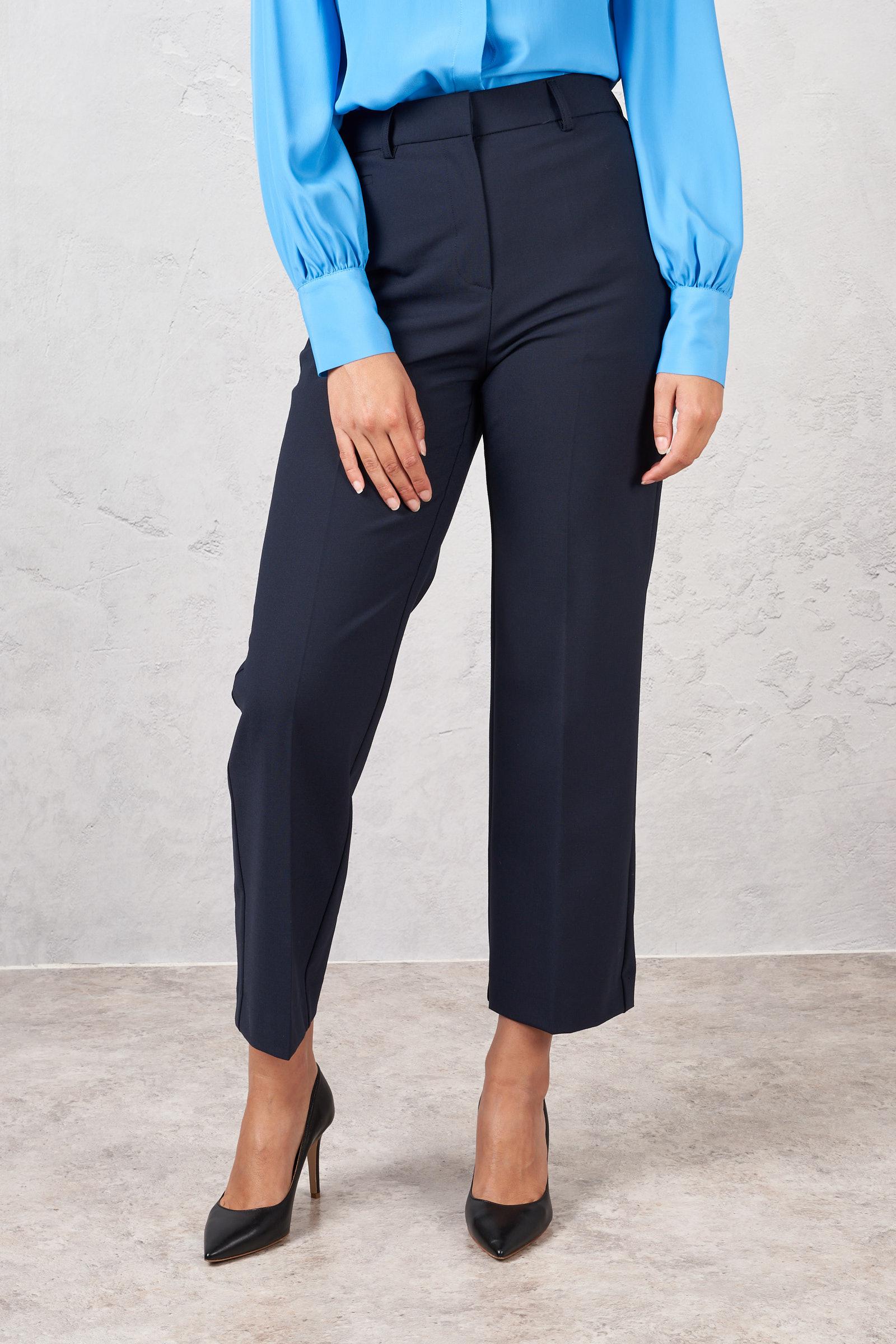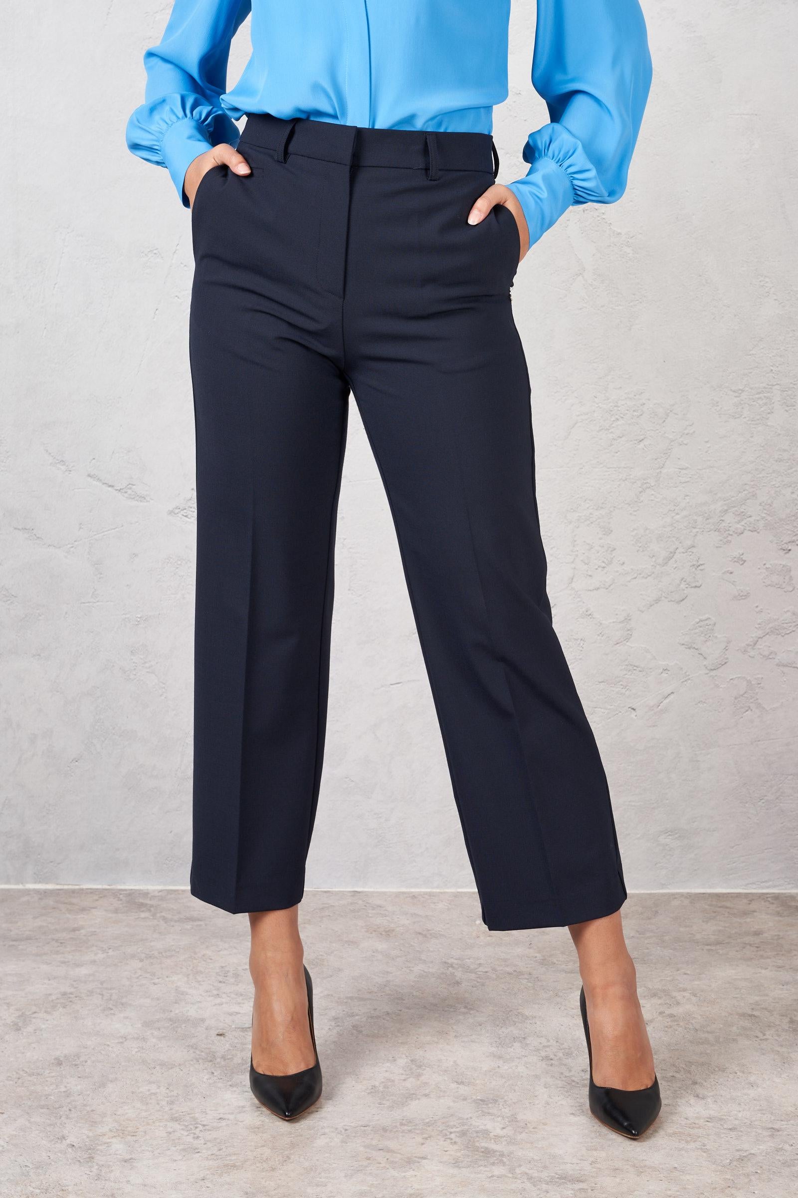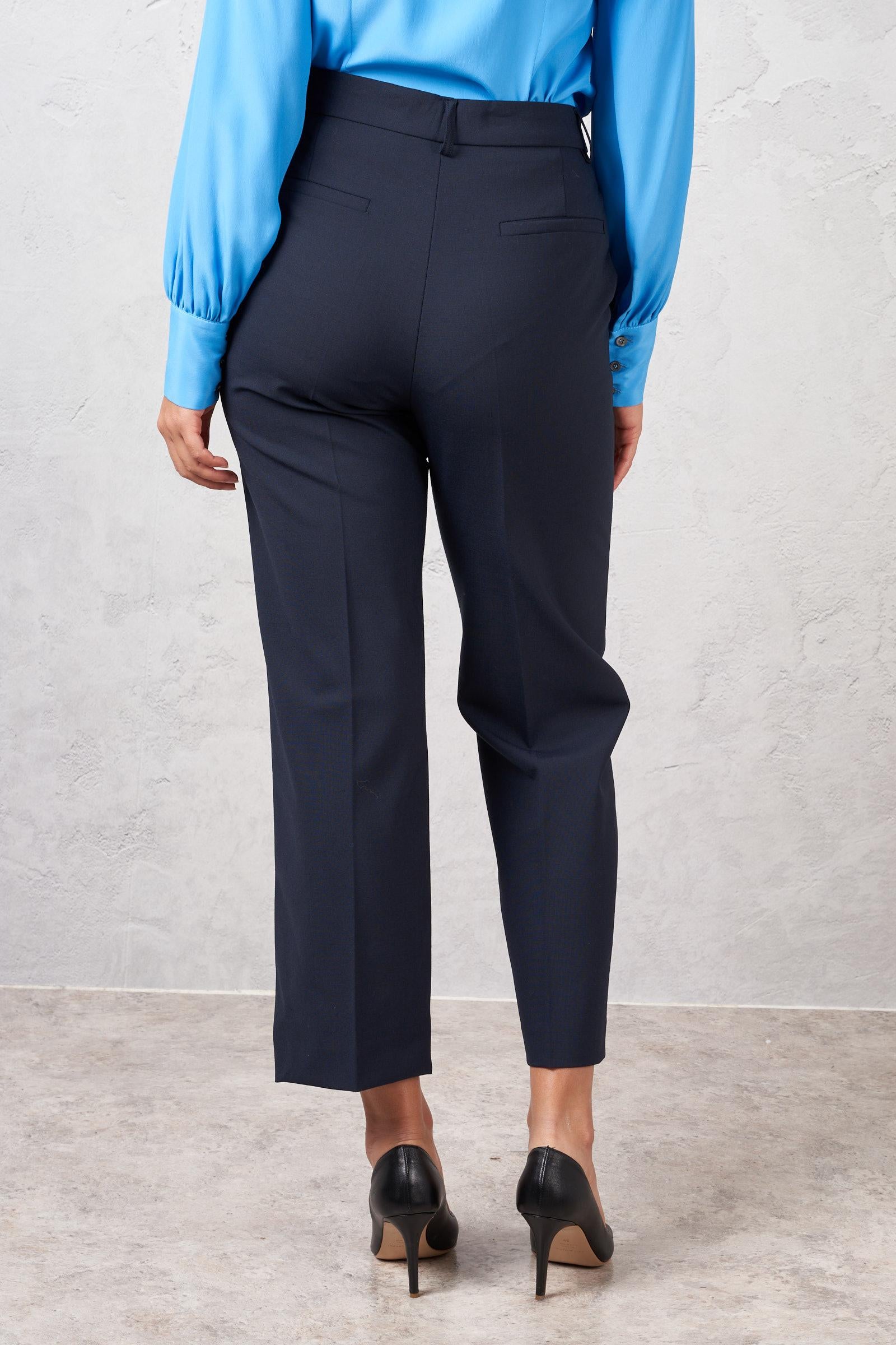 Pantalone alla caviglia in misto lana. Due tasche laterale e due tasche a filetto sul retro. La modella è alta 178 cm e indossa la taglia 40. Made in Italy.