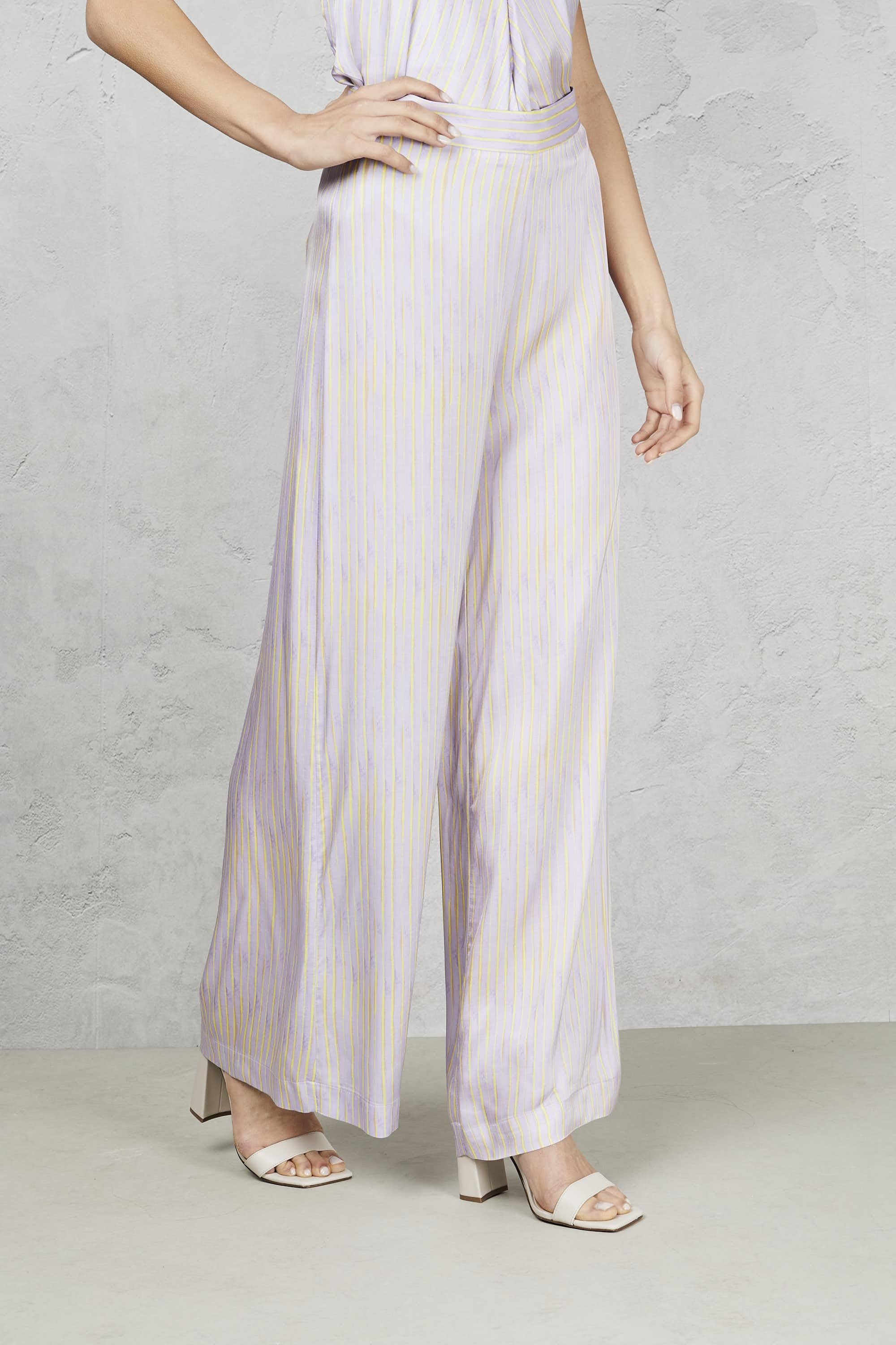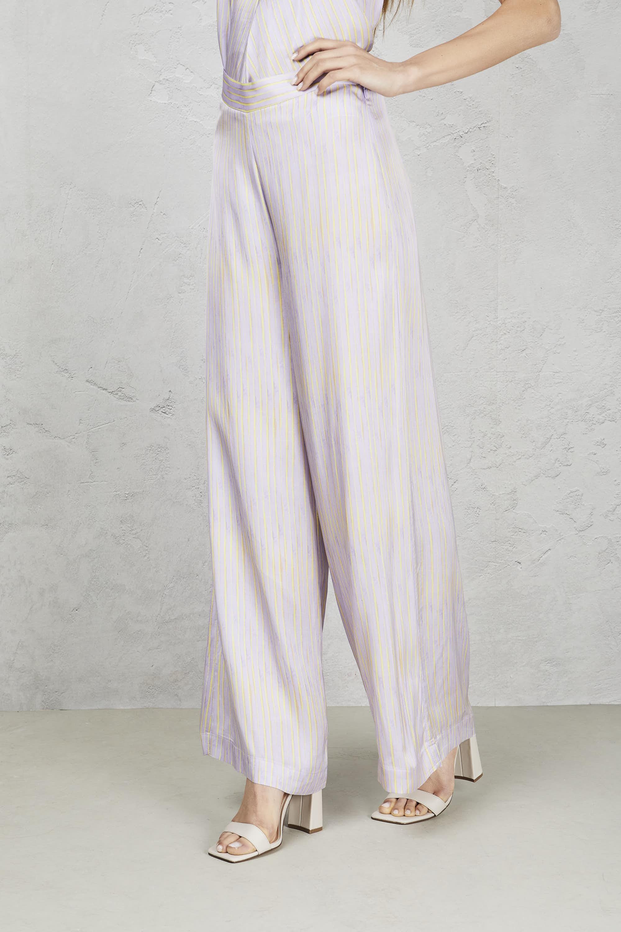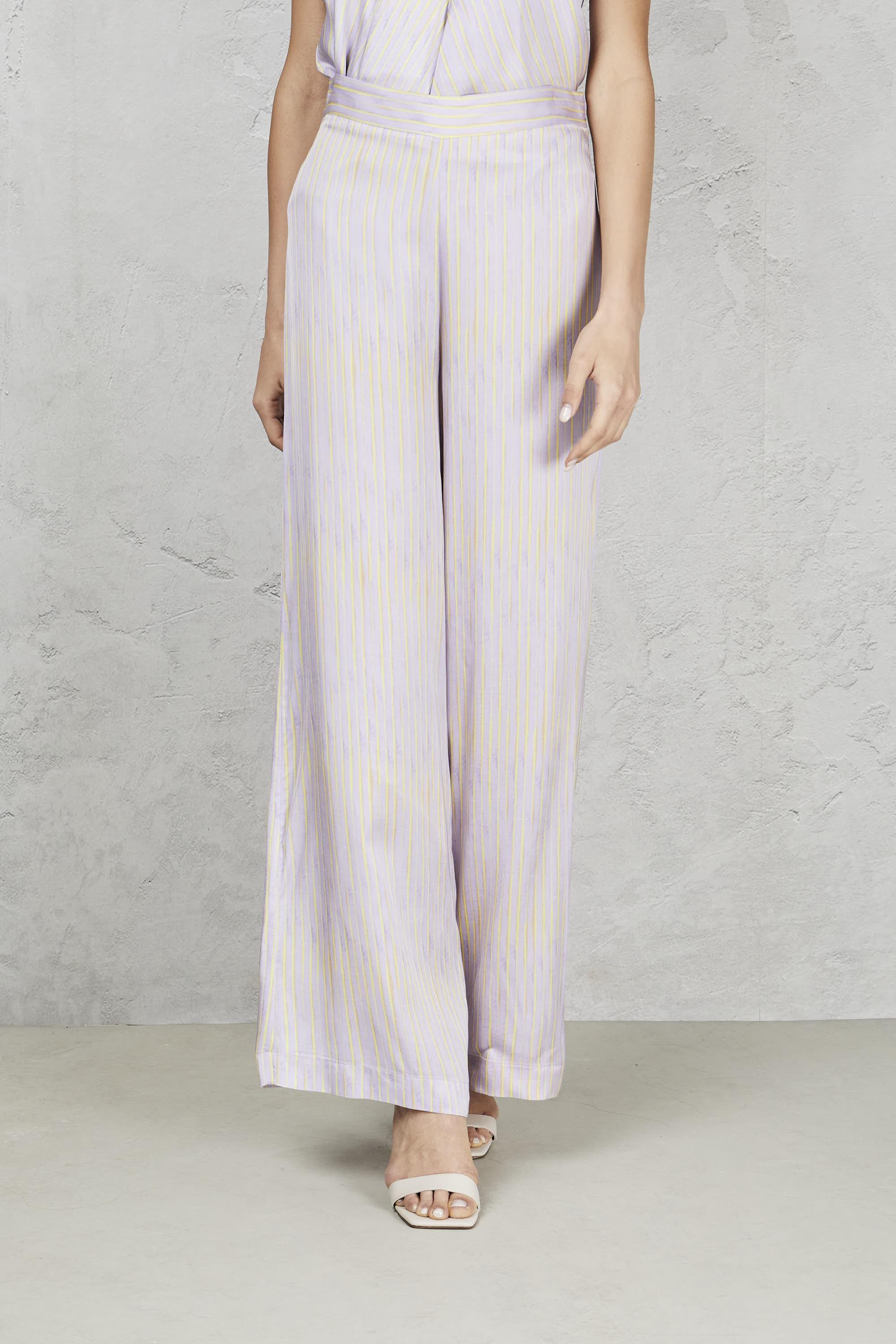 Pantalone dritto largo in pura viscosa stampata. La modella è alta 178 cm e indossa la taglia 40. Made in Italy.