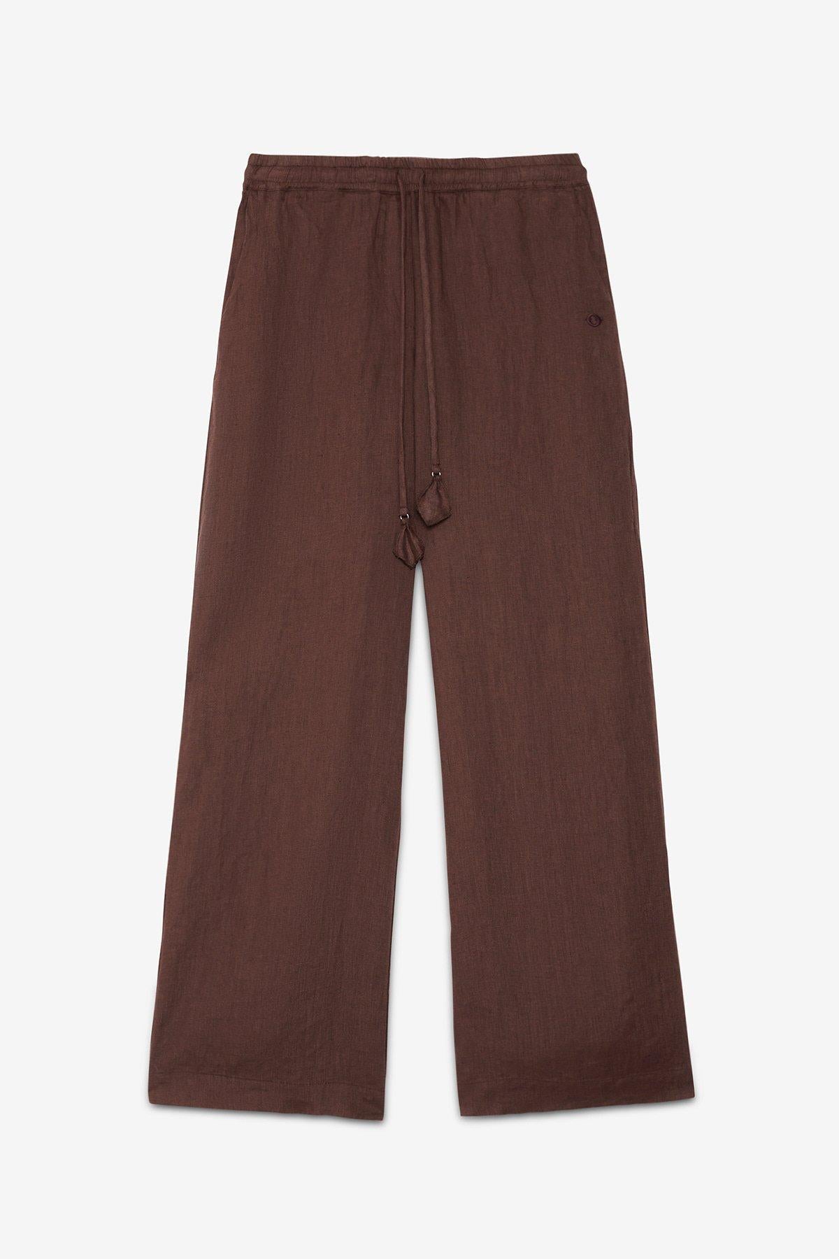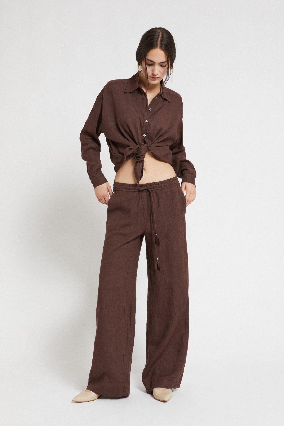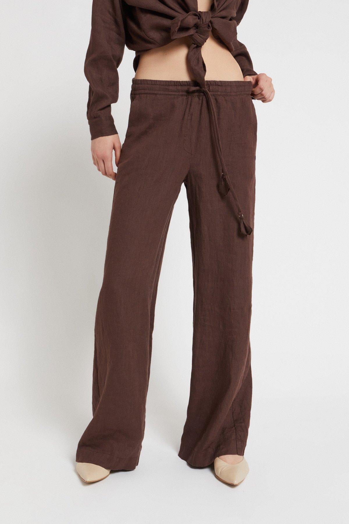 Pantalone palazzo in 100% lino con coulisse e laccio con nappine. La modella è alta 178 cm e indossa la taglia 40.