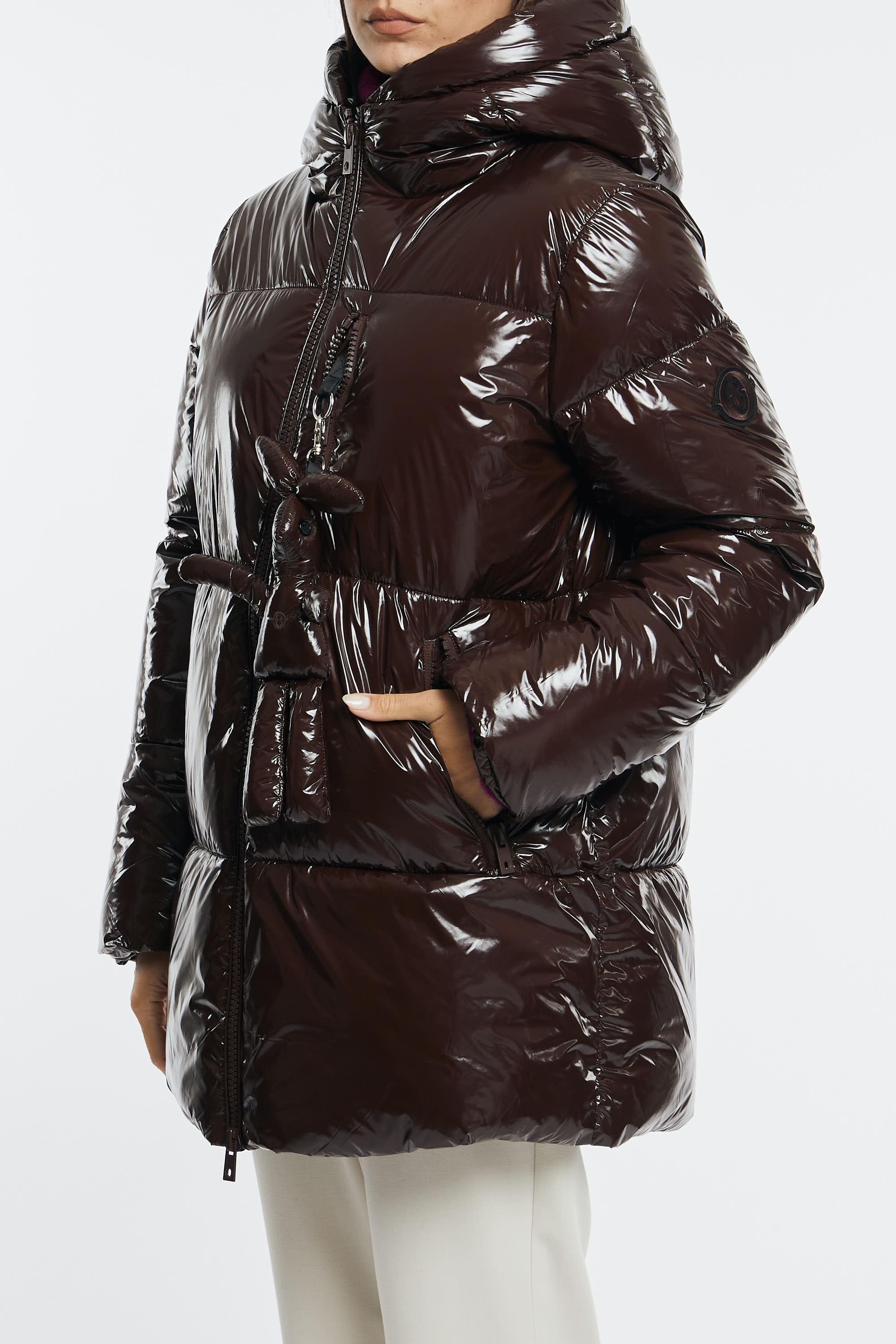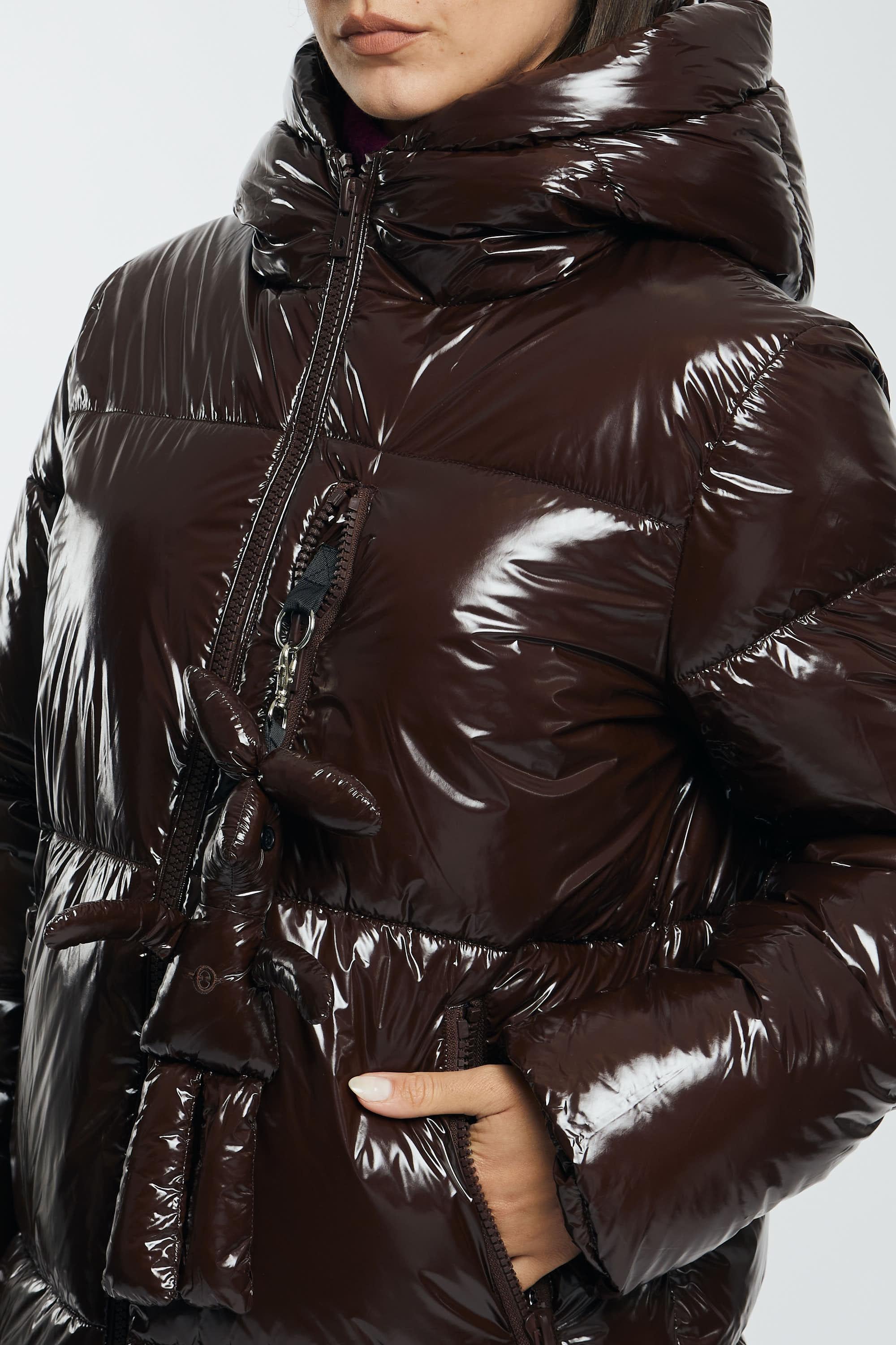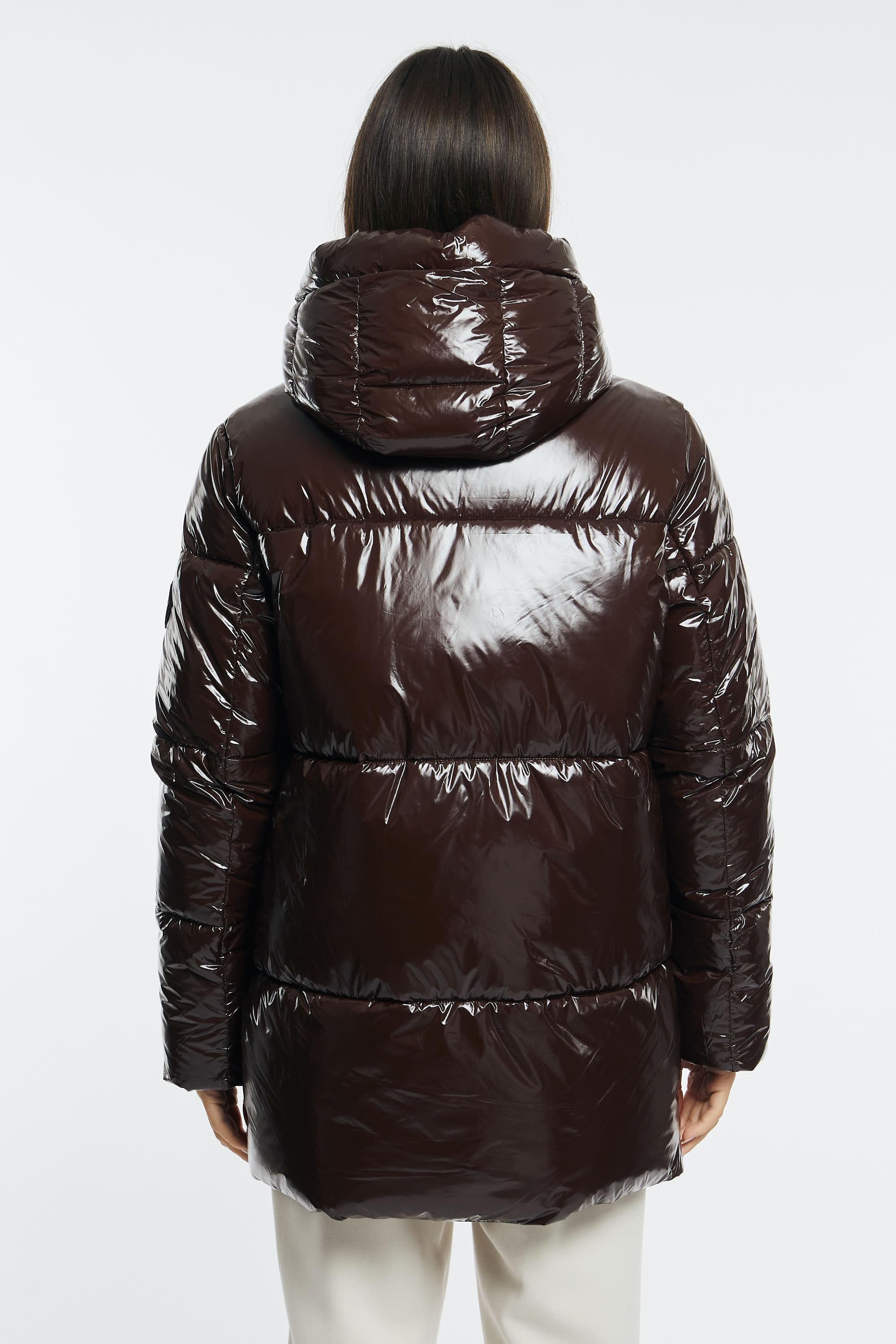 Piumino midi effetto lucido con impunture, collo ampio, zip e tasche con zip. La modella è alta 178 cm e indossa la taglia S.