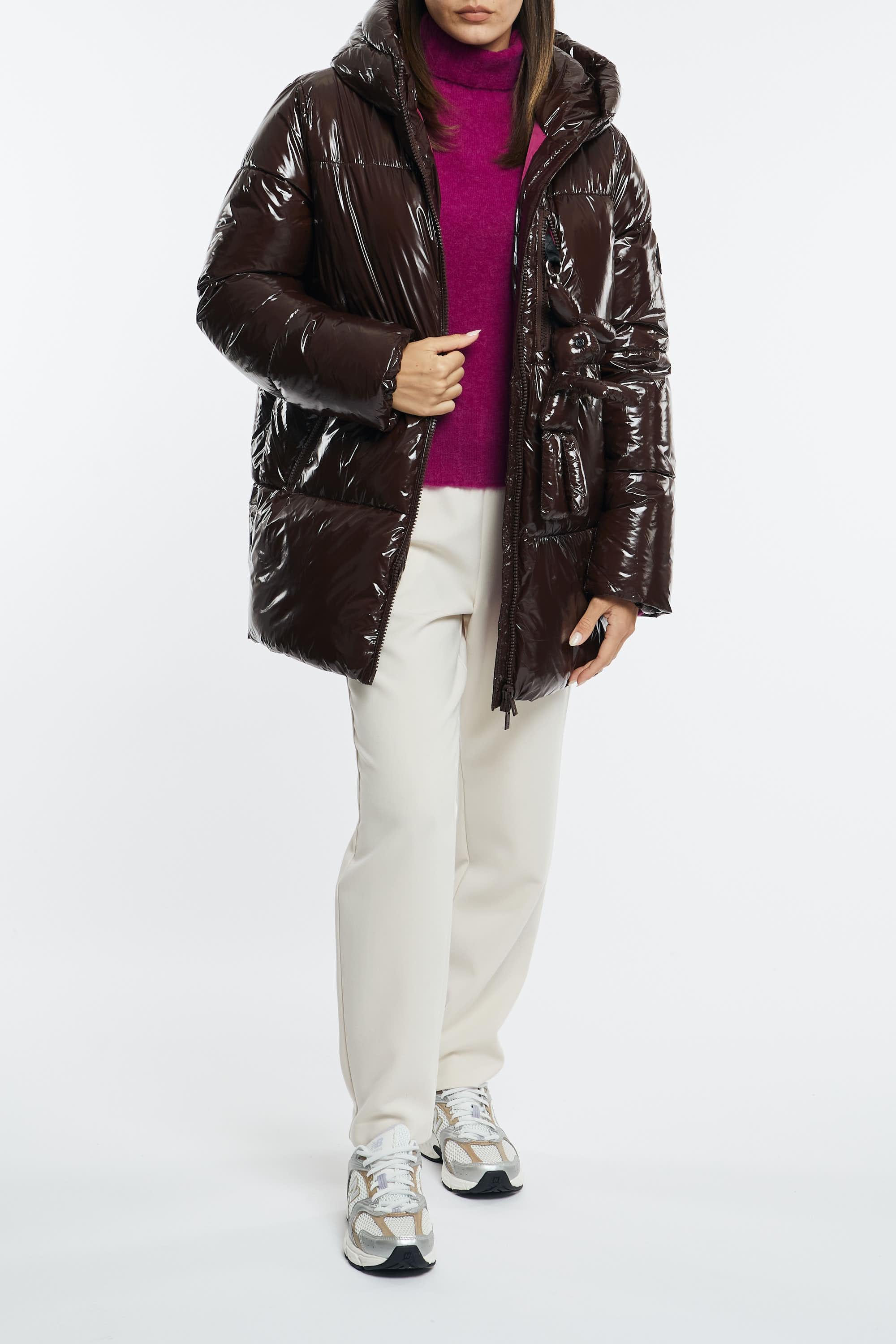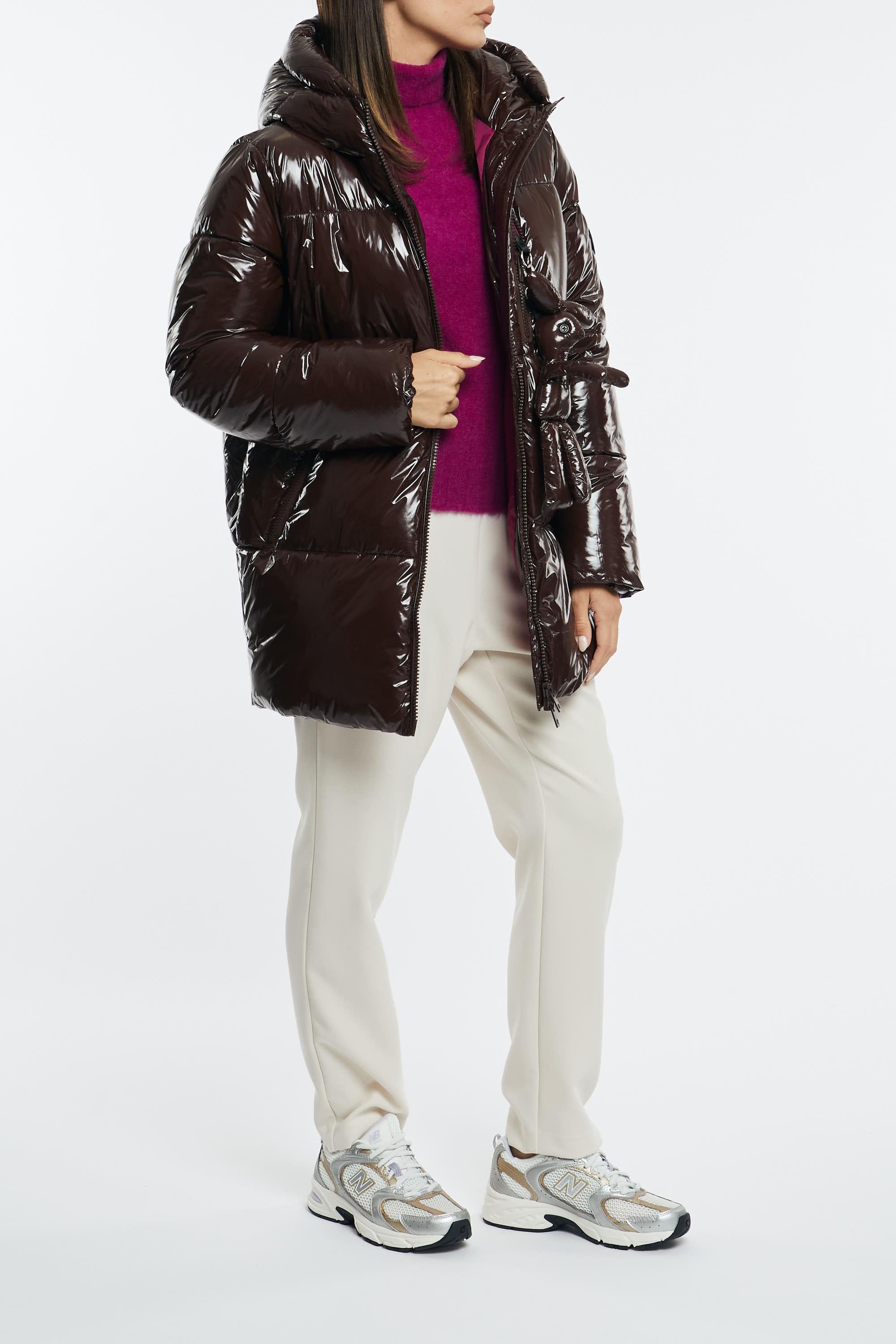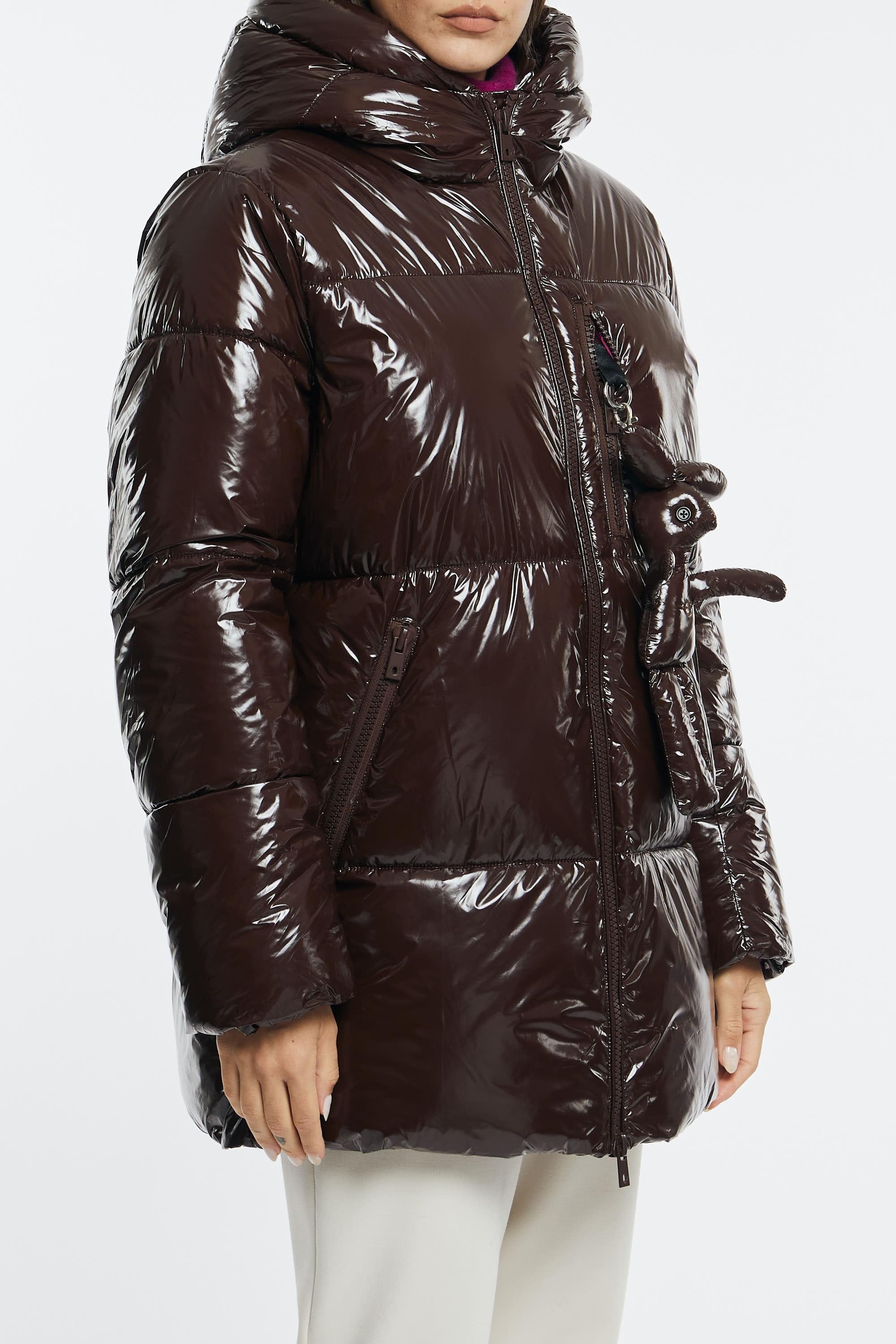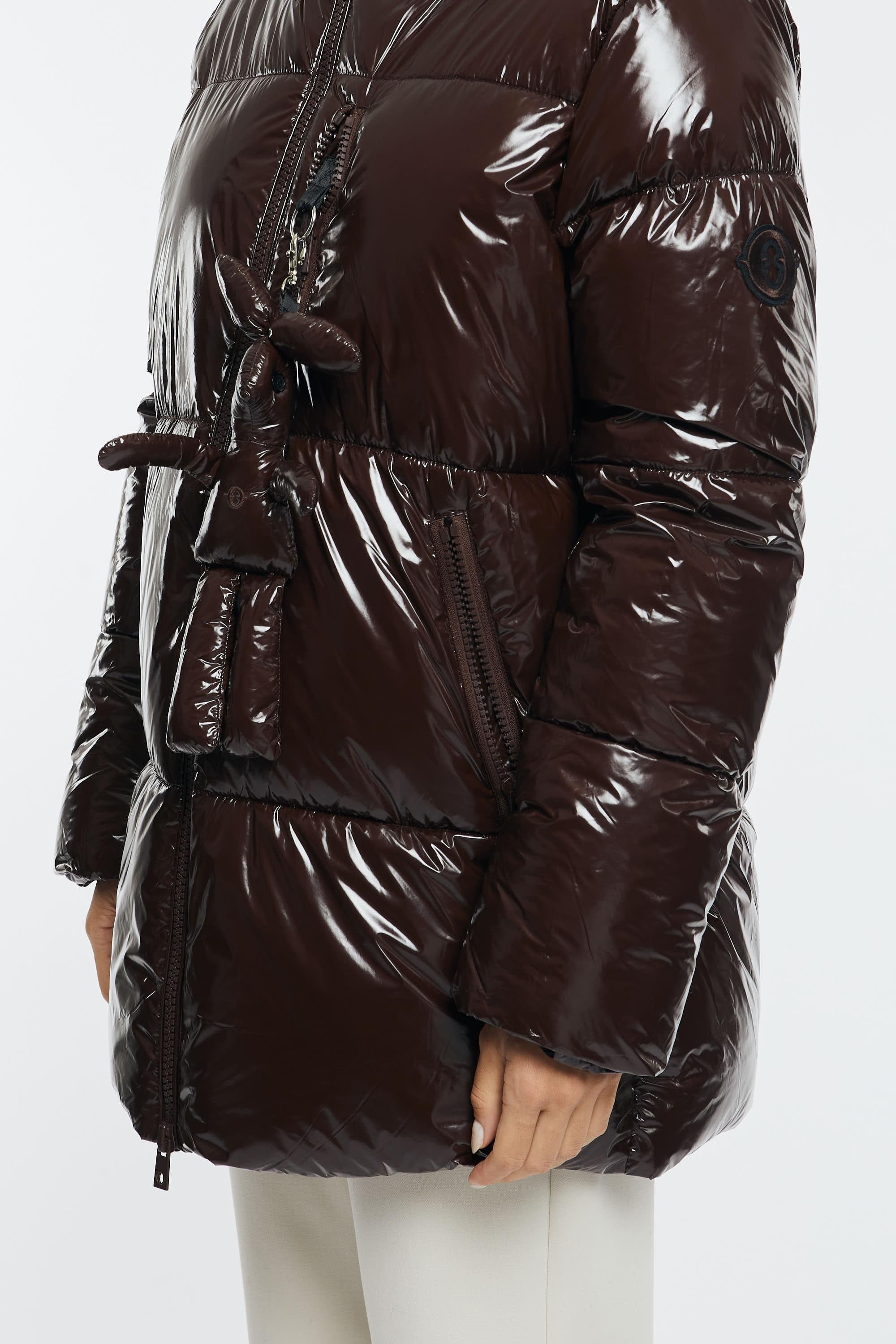 Piumino midi effetto lucido con impunture, collo ampio, zip e tasche con zip. La modella è alta 178 cm e indossa la taglia S.