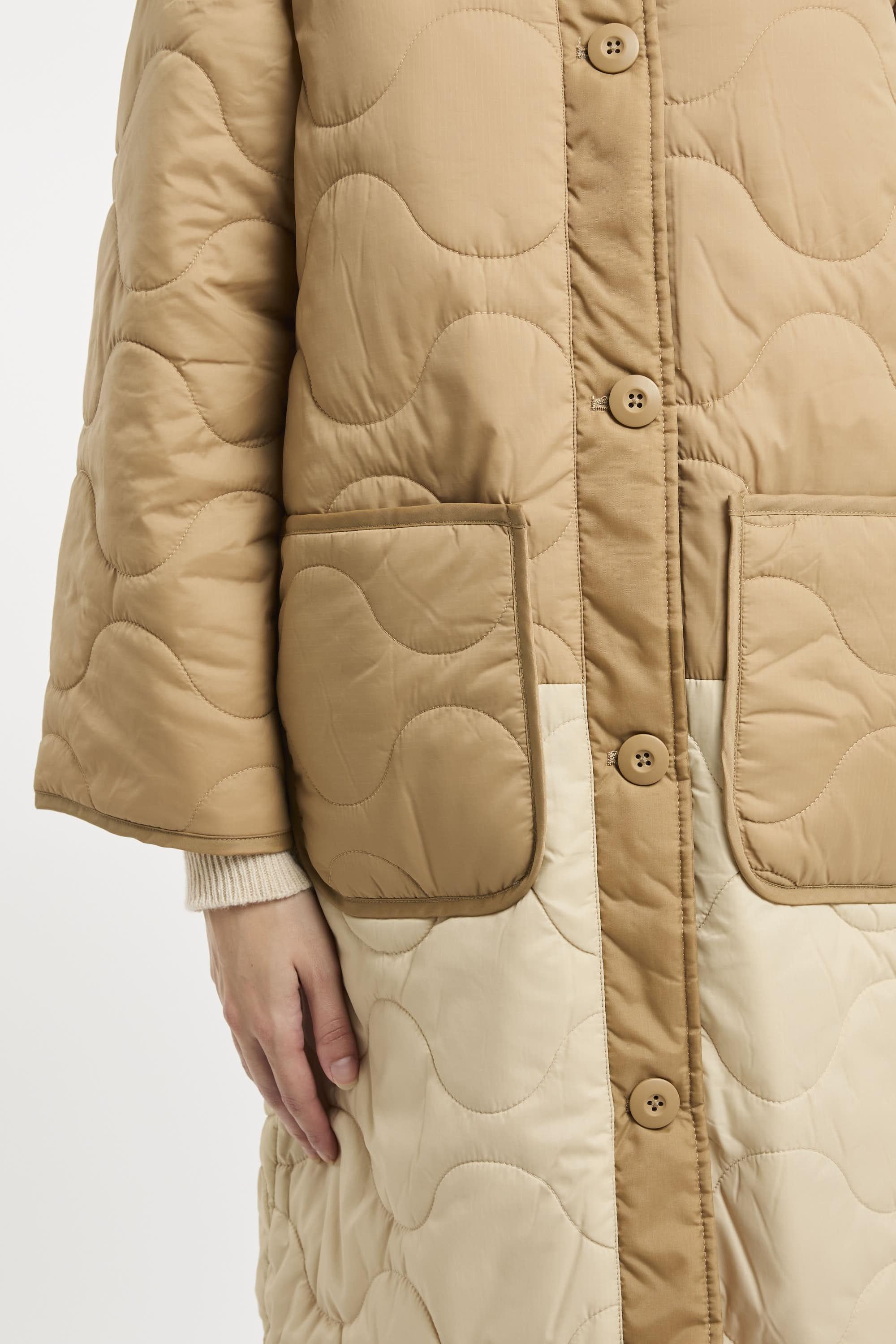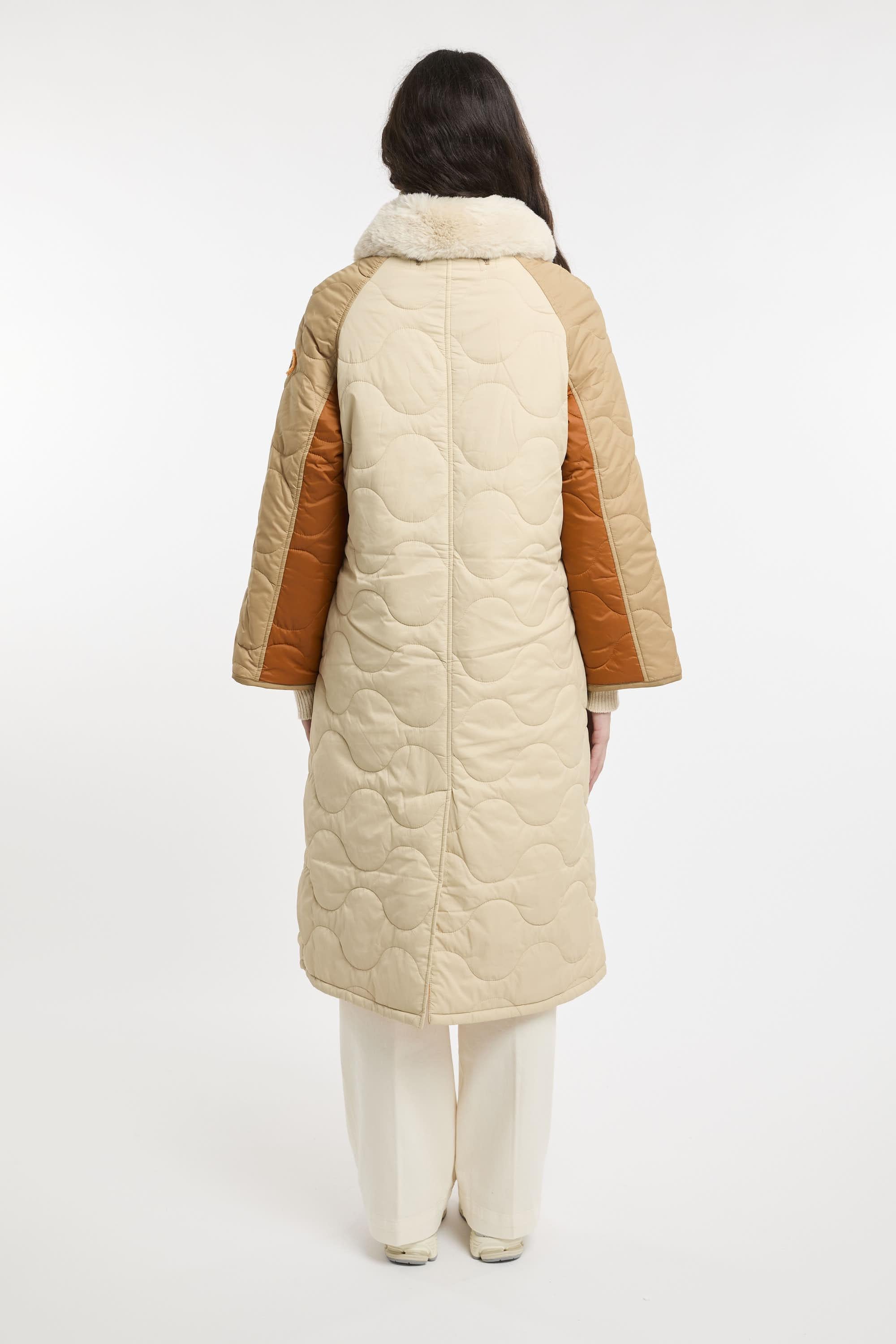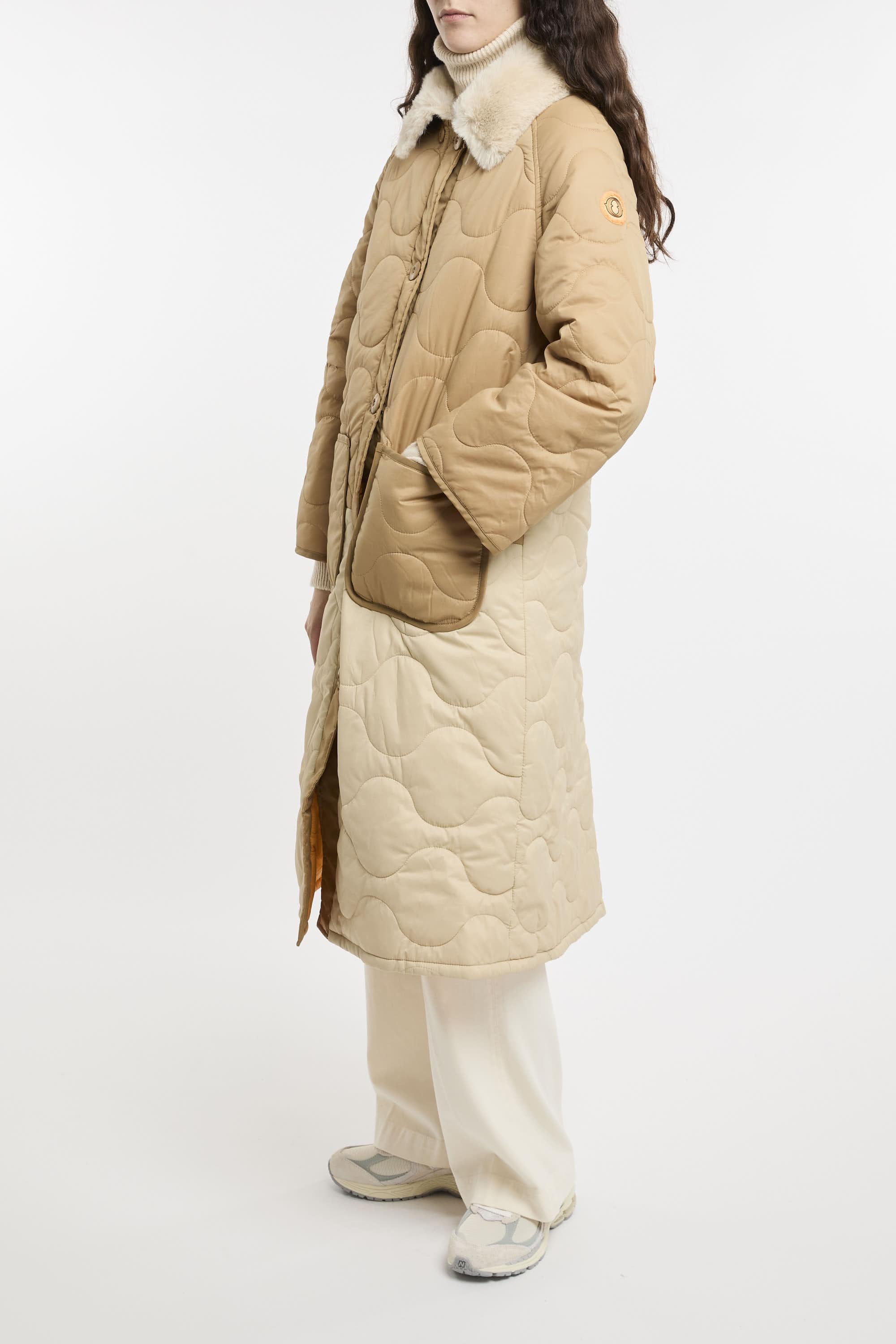 Piumino lungo imbottito e trapuntato con collo staccabile e tasche applicate. La modella è alta 178 cm e indossa la taglia S.