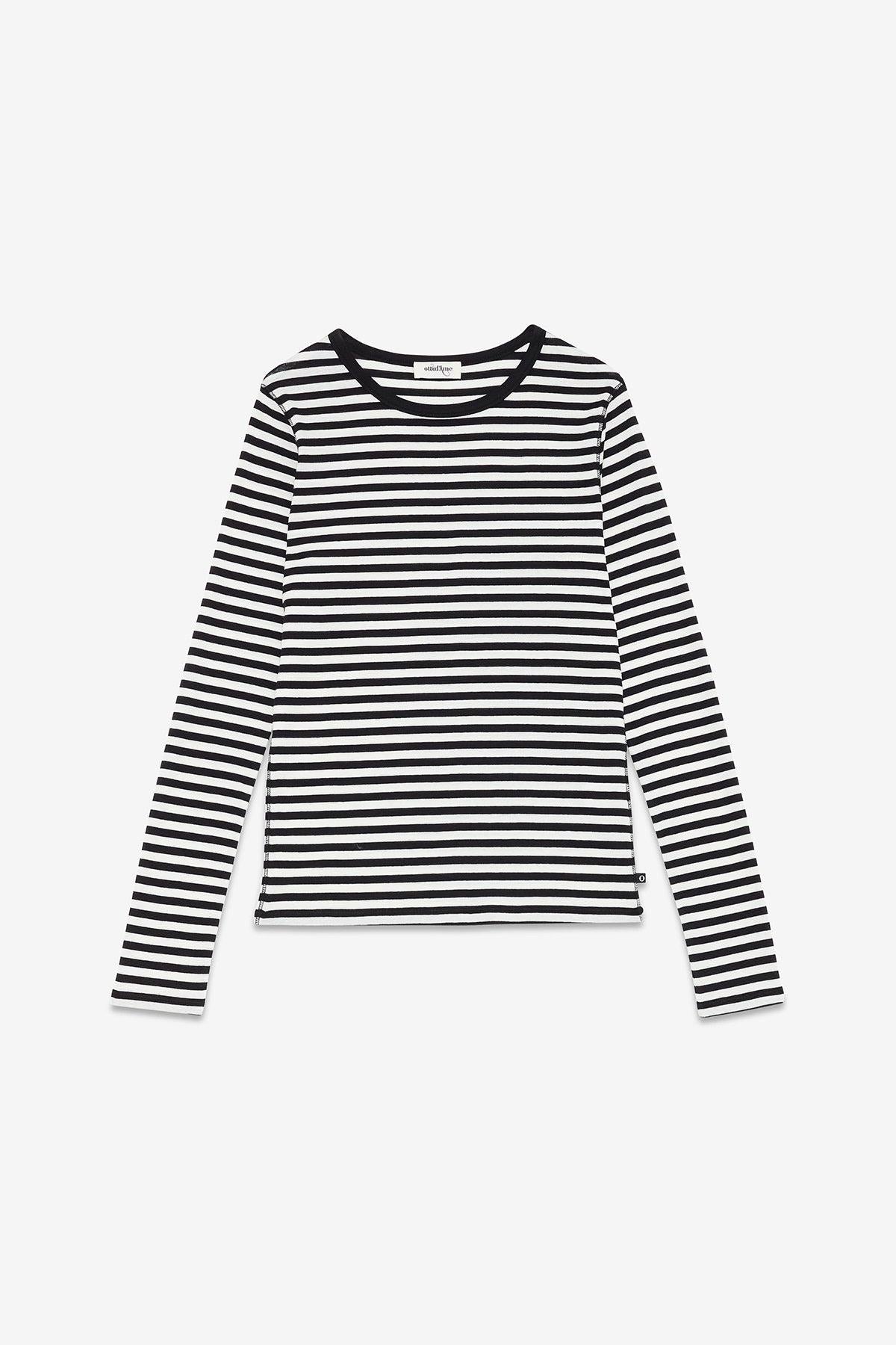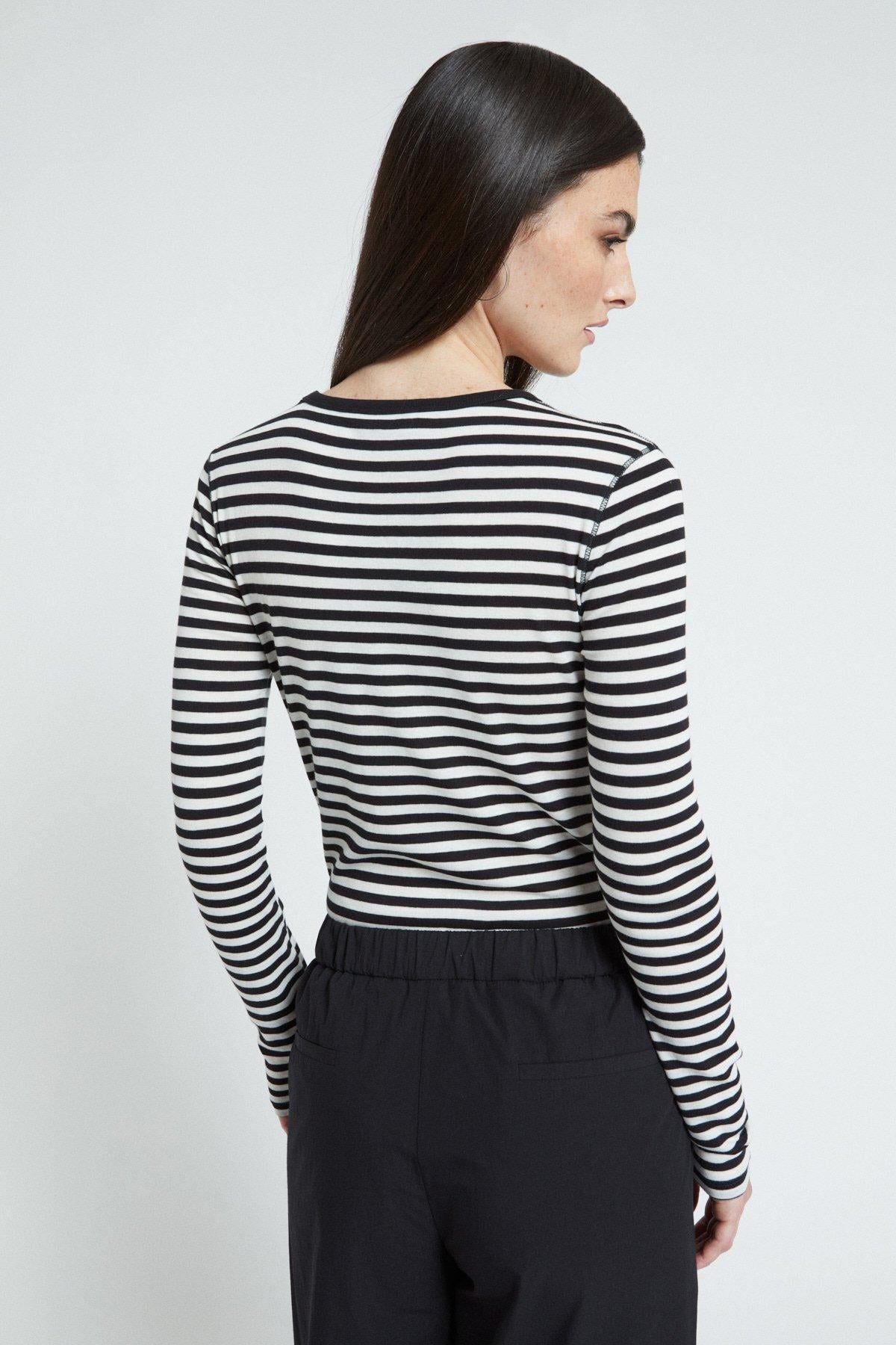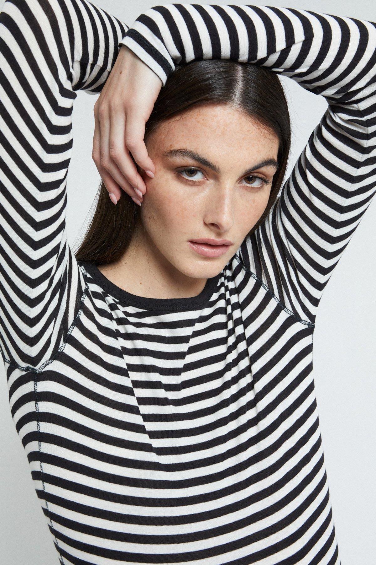 Maglia a righe in 100% cotone con manica lunga. La modella è alta 178 cm e indossa la taglia S.