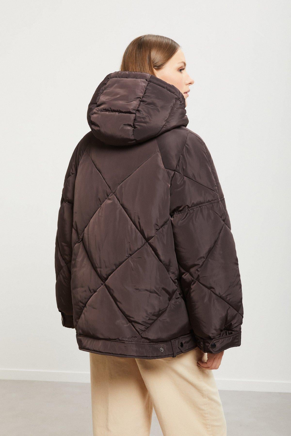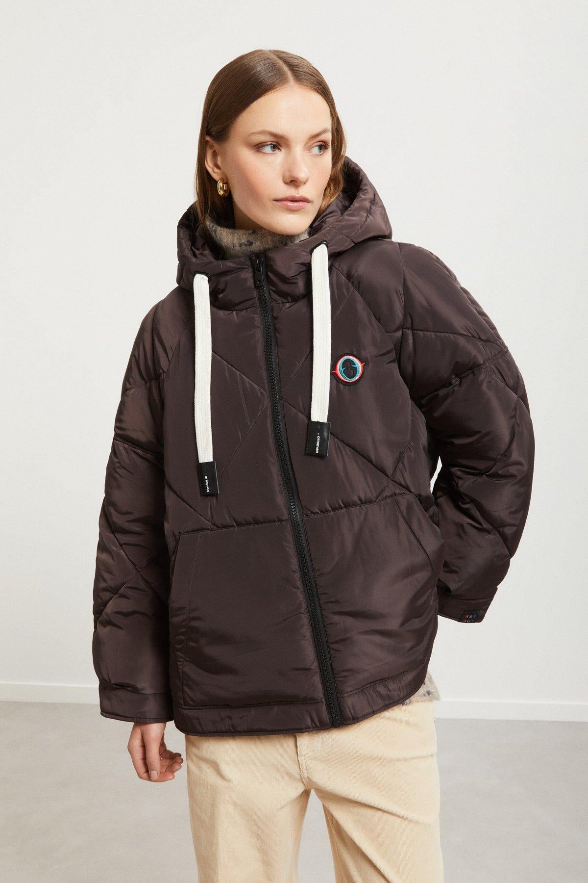 Piumino corto imbottito con impunture, zip e cappuccio con coulisse a contrasto. La modella è alta 178 cm e indossa la taglia S.
