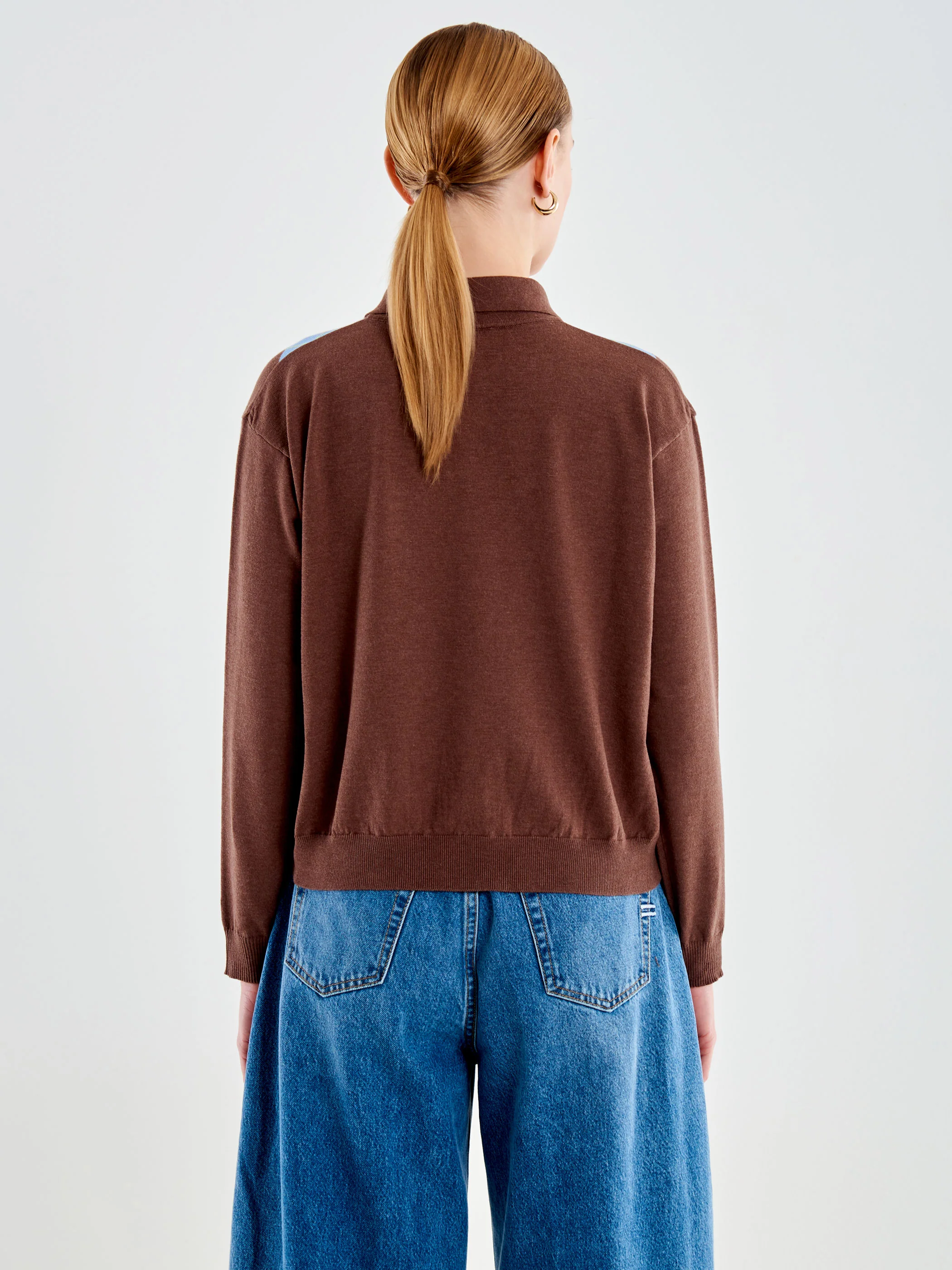 Polo in maglia, maniche lunghe. Con colletto e chiusura con due bottoncini. Finiture in maglia a coste. Dettaglio fantasia Rombi laterale. La modella è alta 178 cm e indossa la taglia S.