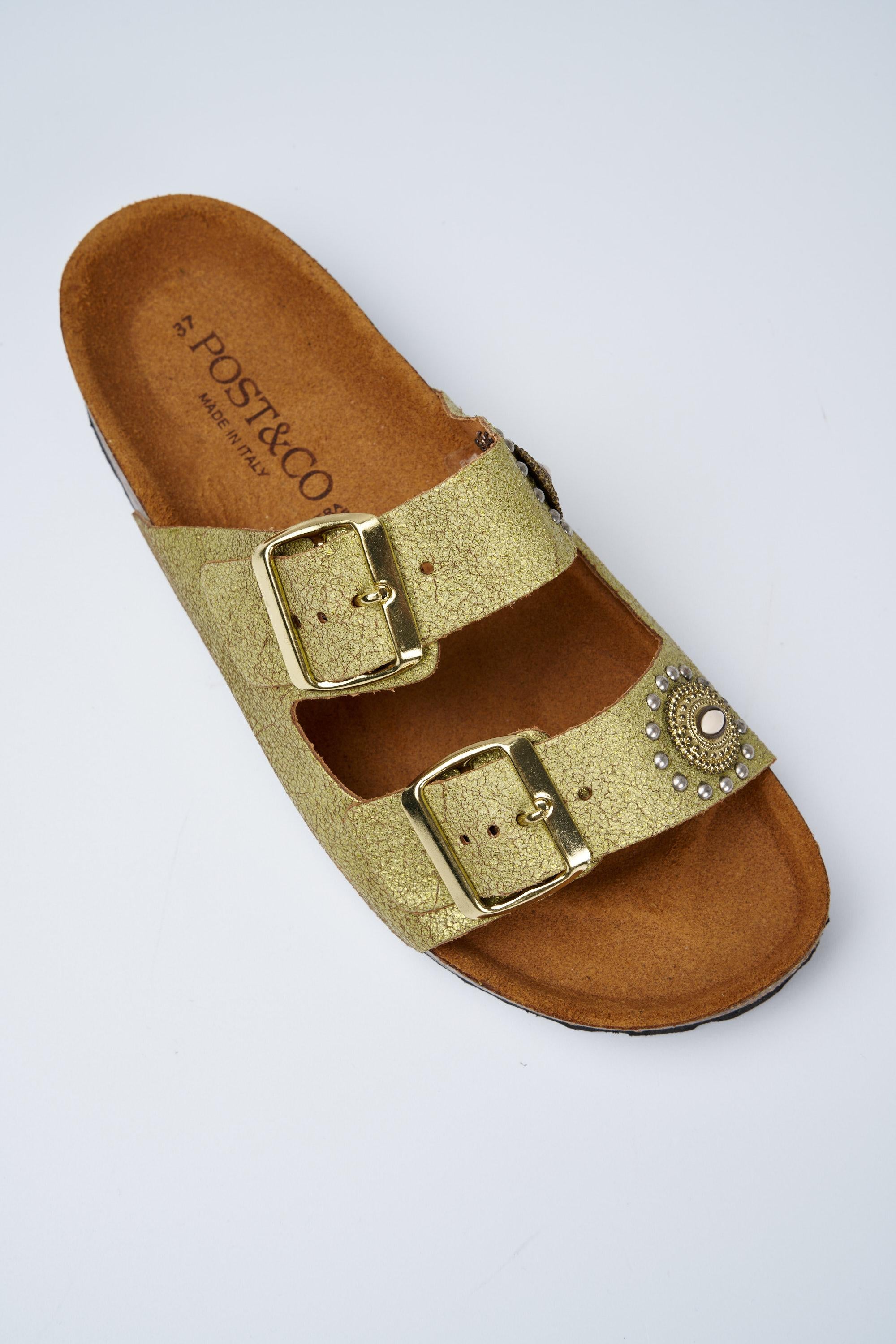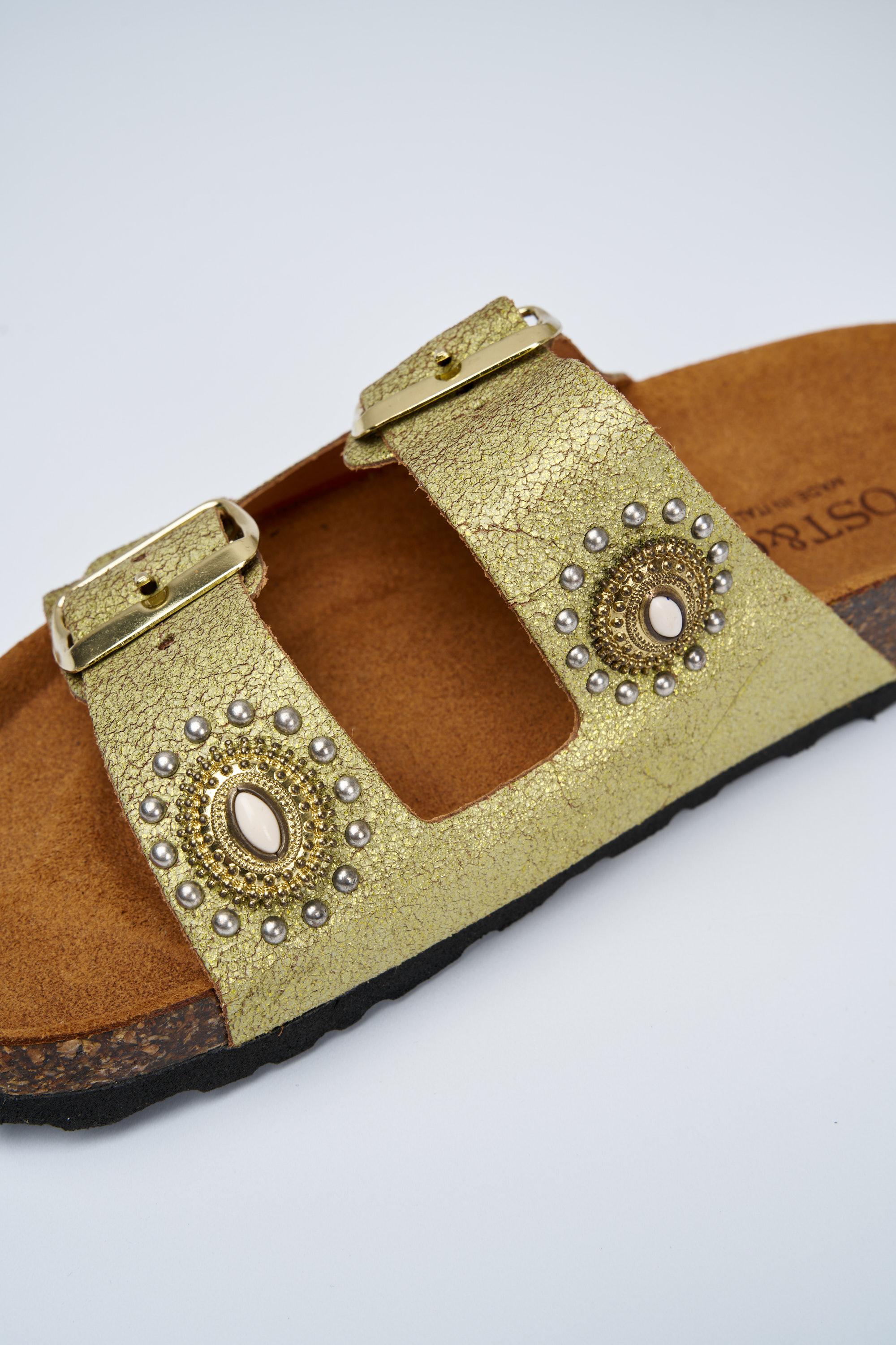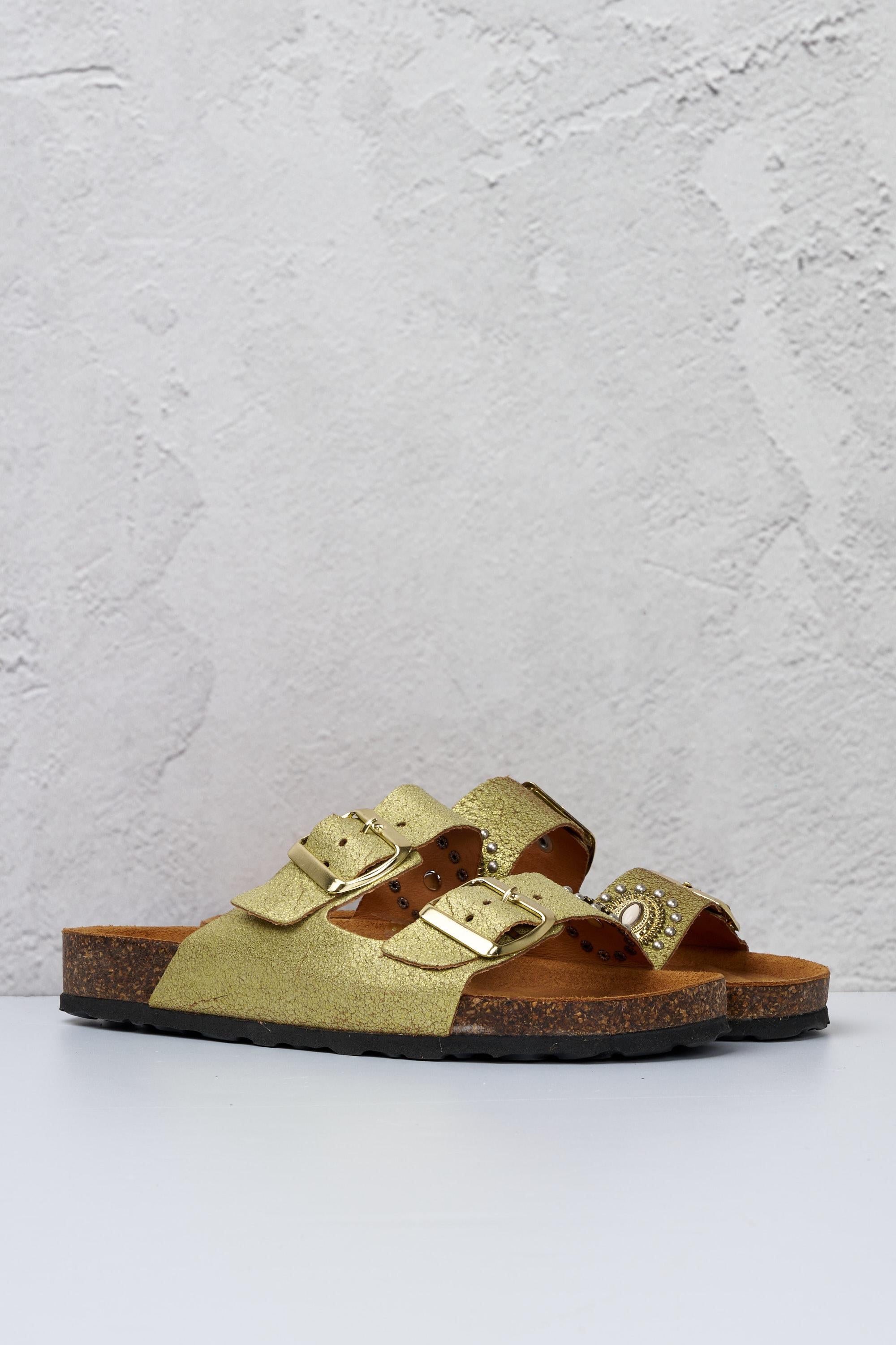 Sandalo in pelle con due cinturini dall'effetto metallizato con borchie. Fibbie in metallo regolabili.