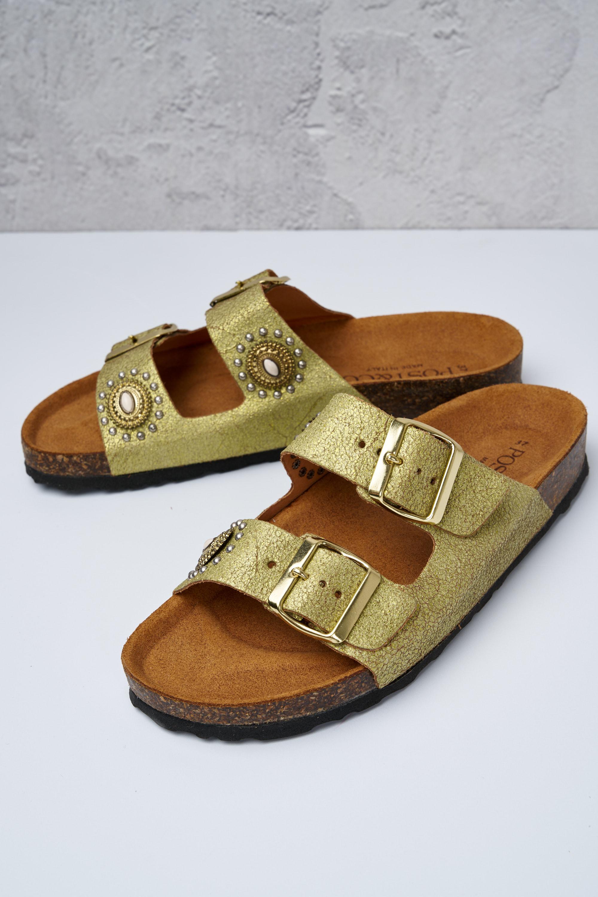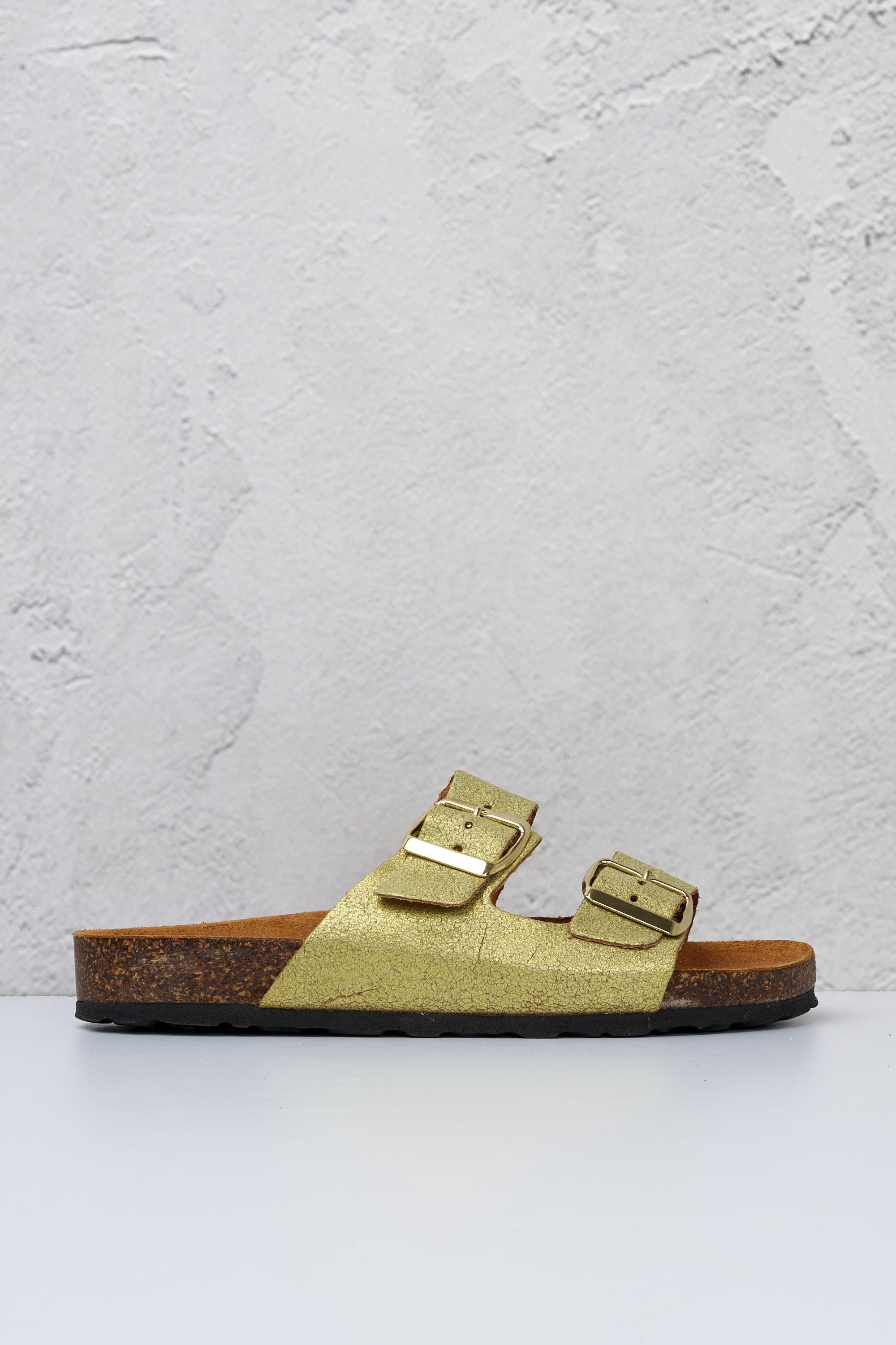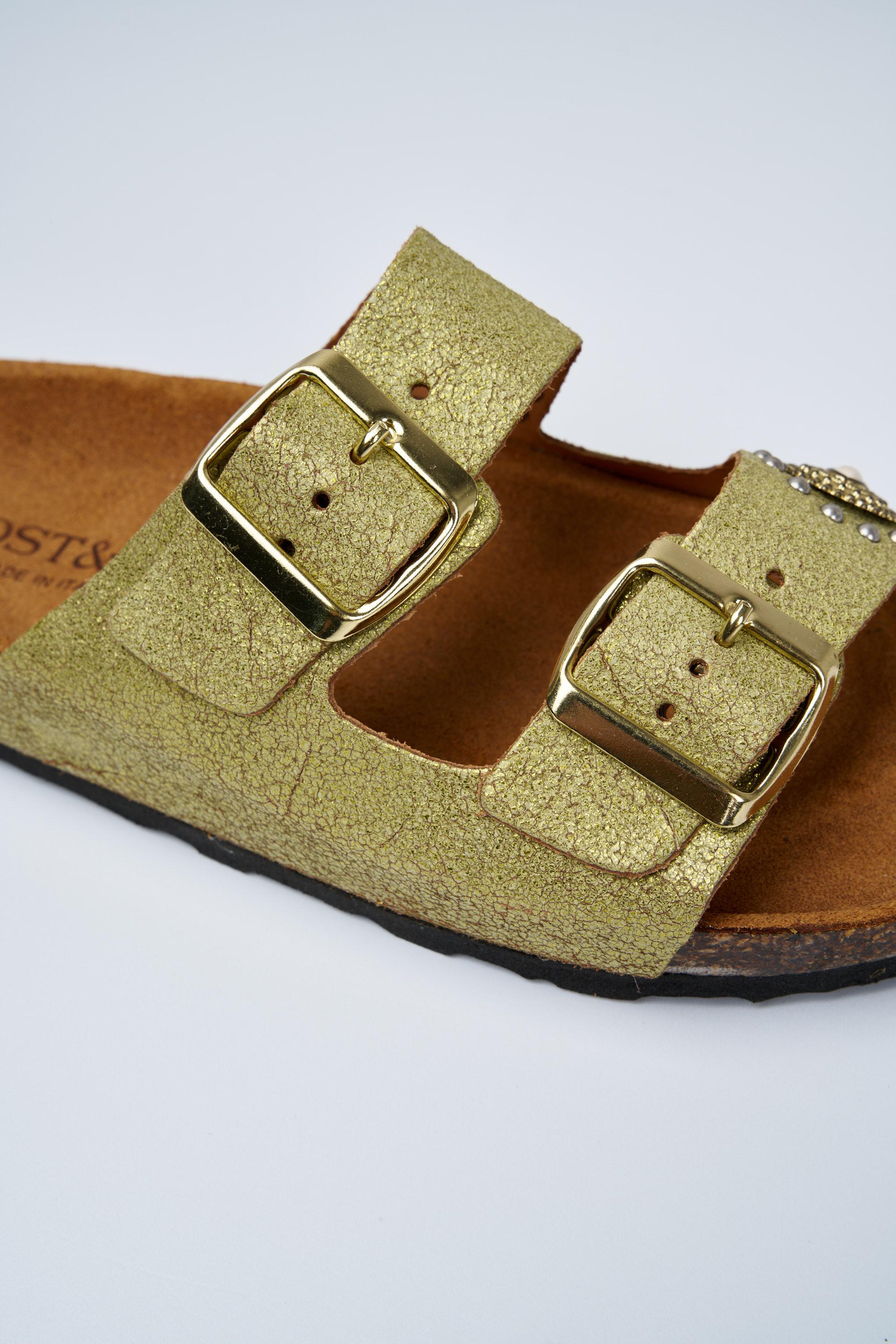 Sandalo in pelle con due cinturini dall'effetto metallizato con borchie. Fibbie in metallo regolabili.