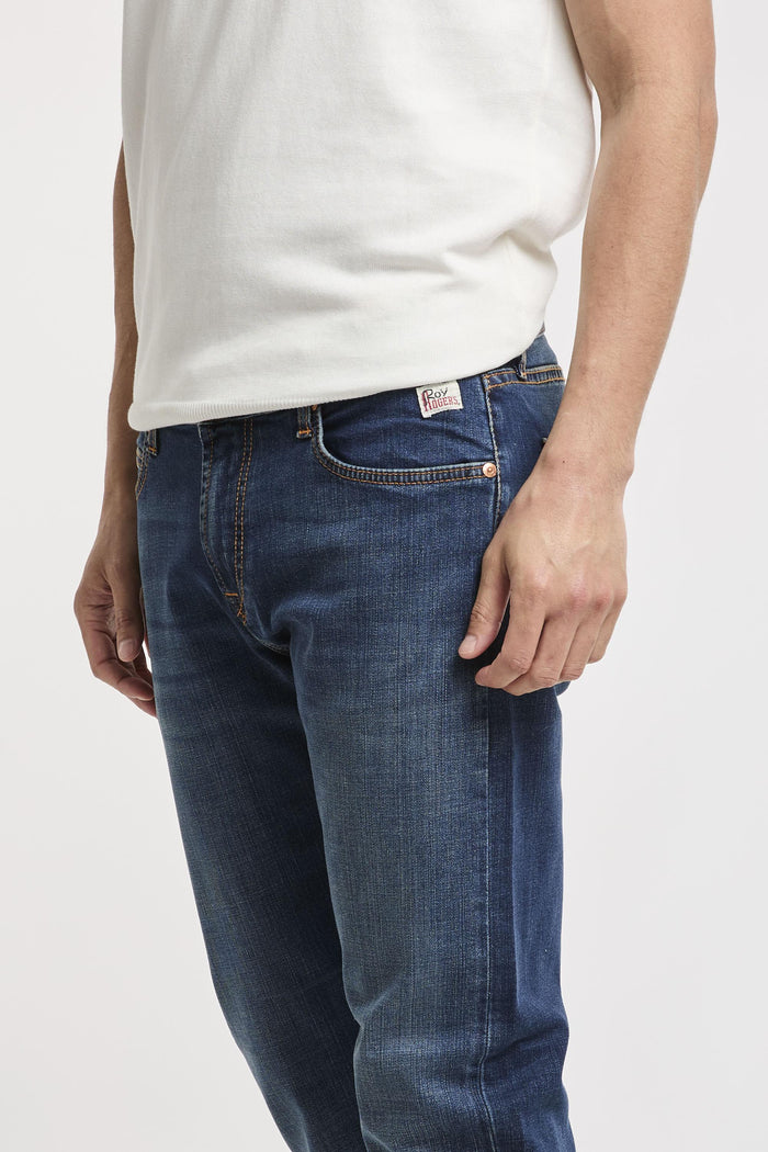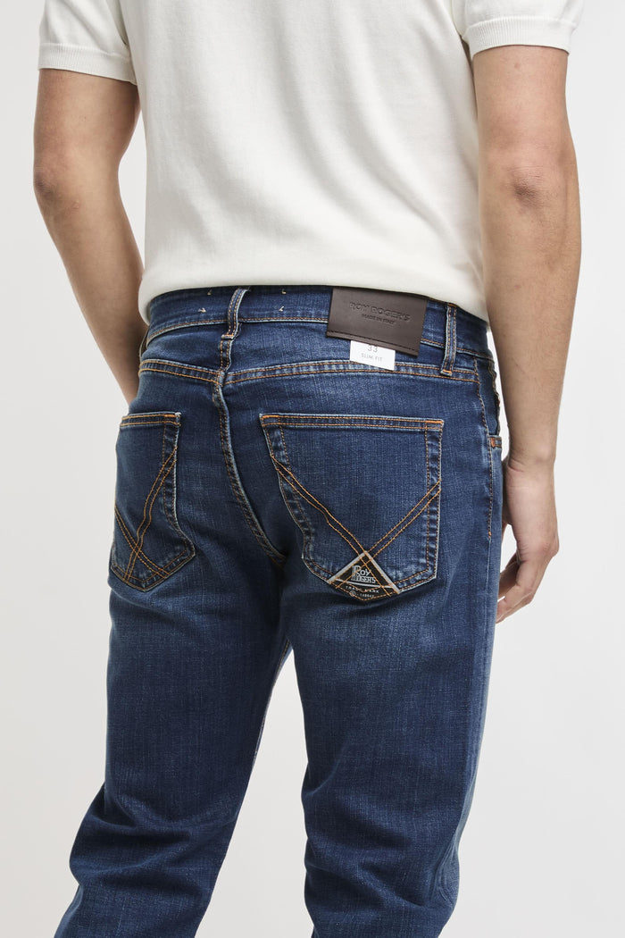 Jeans in denim con lavaggio scuro e impunture in contrasto. Leggere baffature sul fronte. Vita media con passanti e salpa applicata sul retro. Chiusura sul fronte con bottoni logati. Due tasche sul fronte e due tasche sul retro con label Roy Roger's applicato. Slim fit. Il modello è alto 187 cm e indossa la taglia 33. Made in Italy.