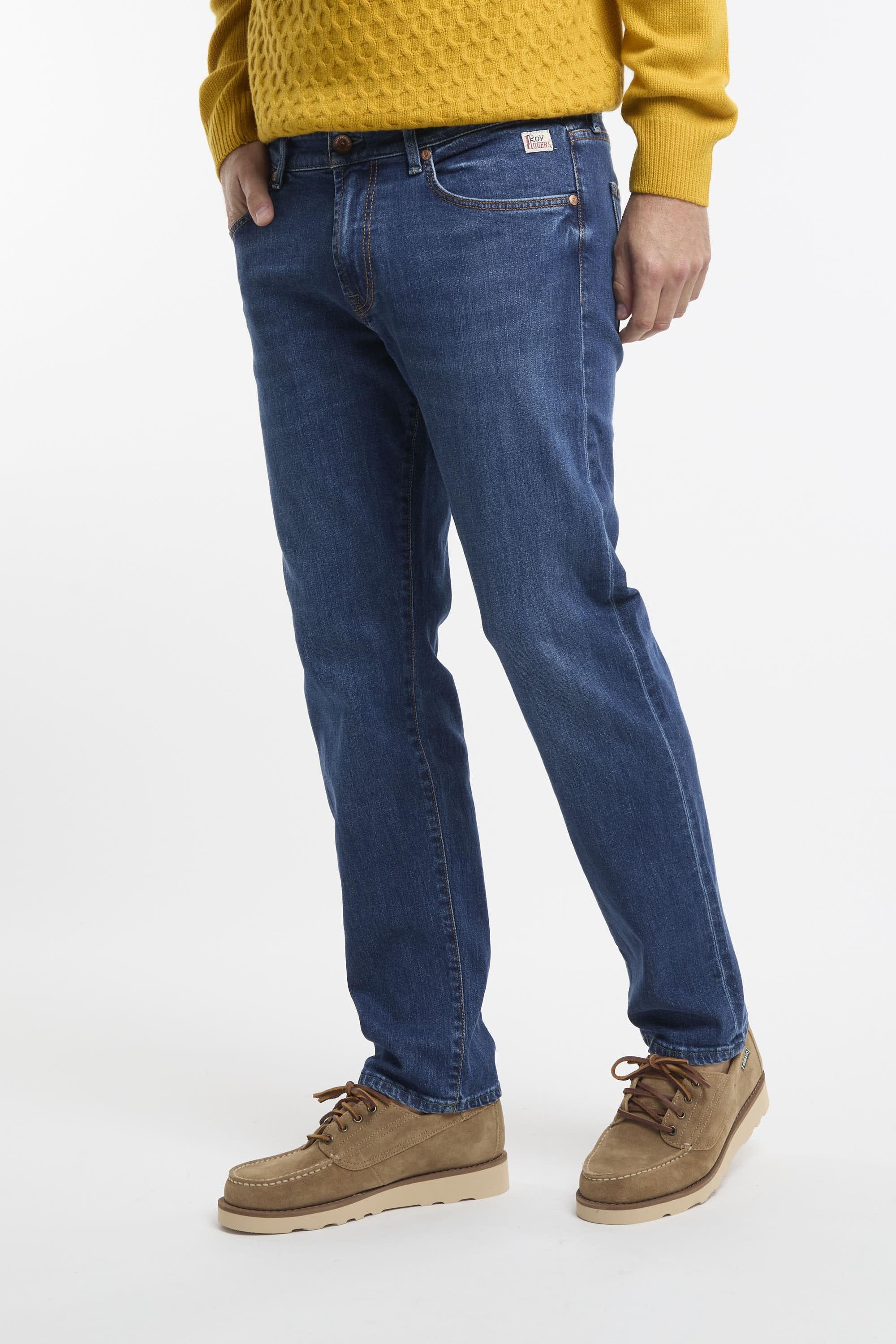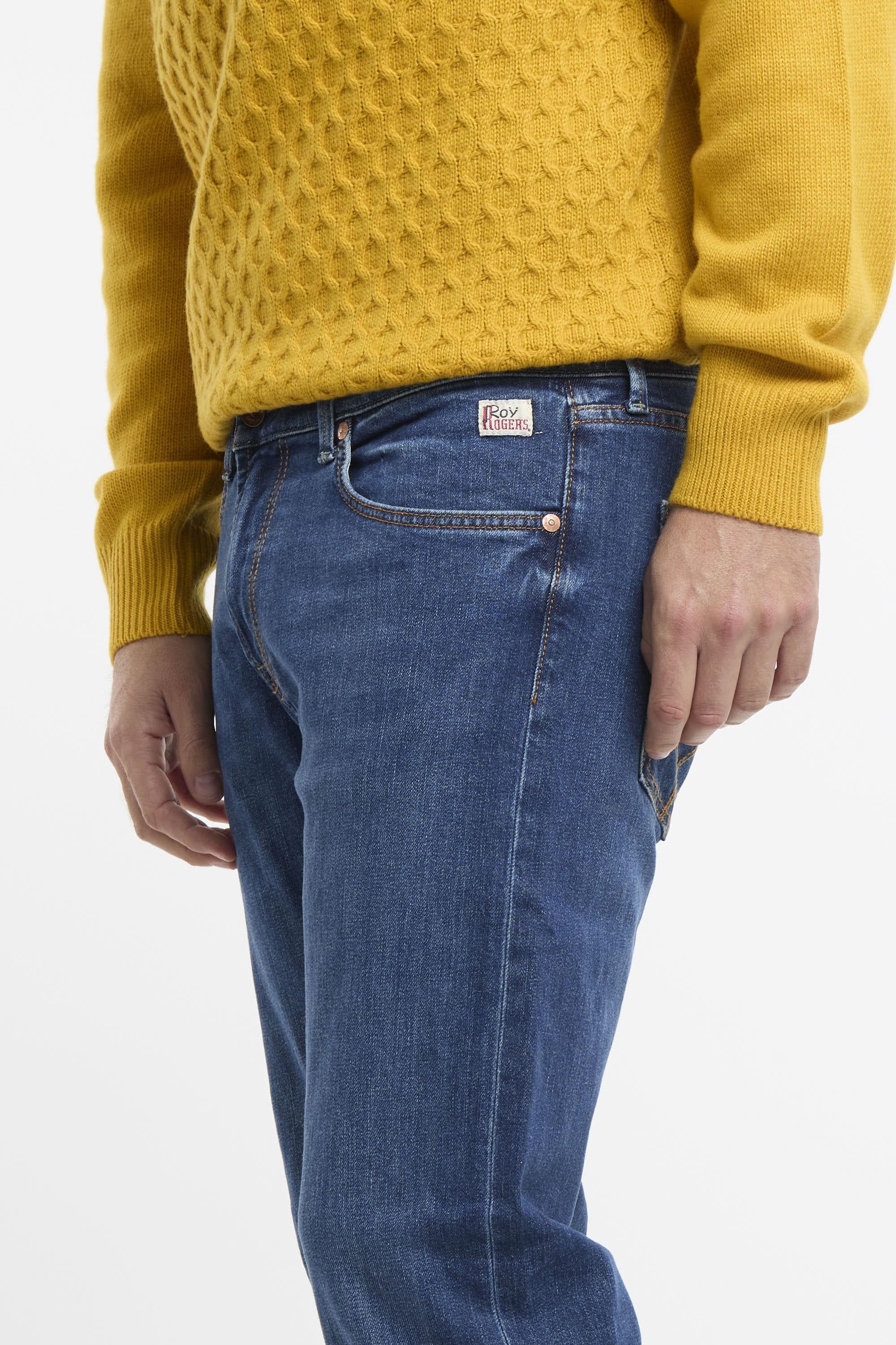 Jeans in denim con lavaggio medio e impunture in contrasto. Vita media con passanti e salpa applicata sul retro. Chiusura sul fronte con bottone logato e zip. Due tasche sul fronte e due tasche sul retro con label Roy Roger's applicato. Slim fit. Il modello è alto 187 cm e indossa la taglia 33. Made in Italy.