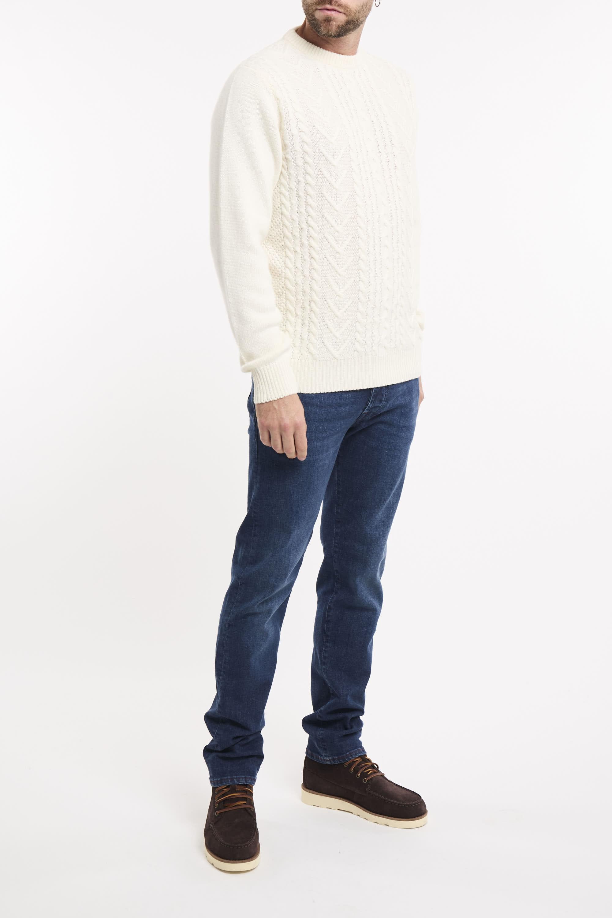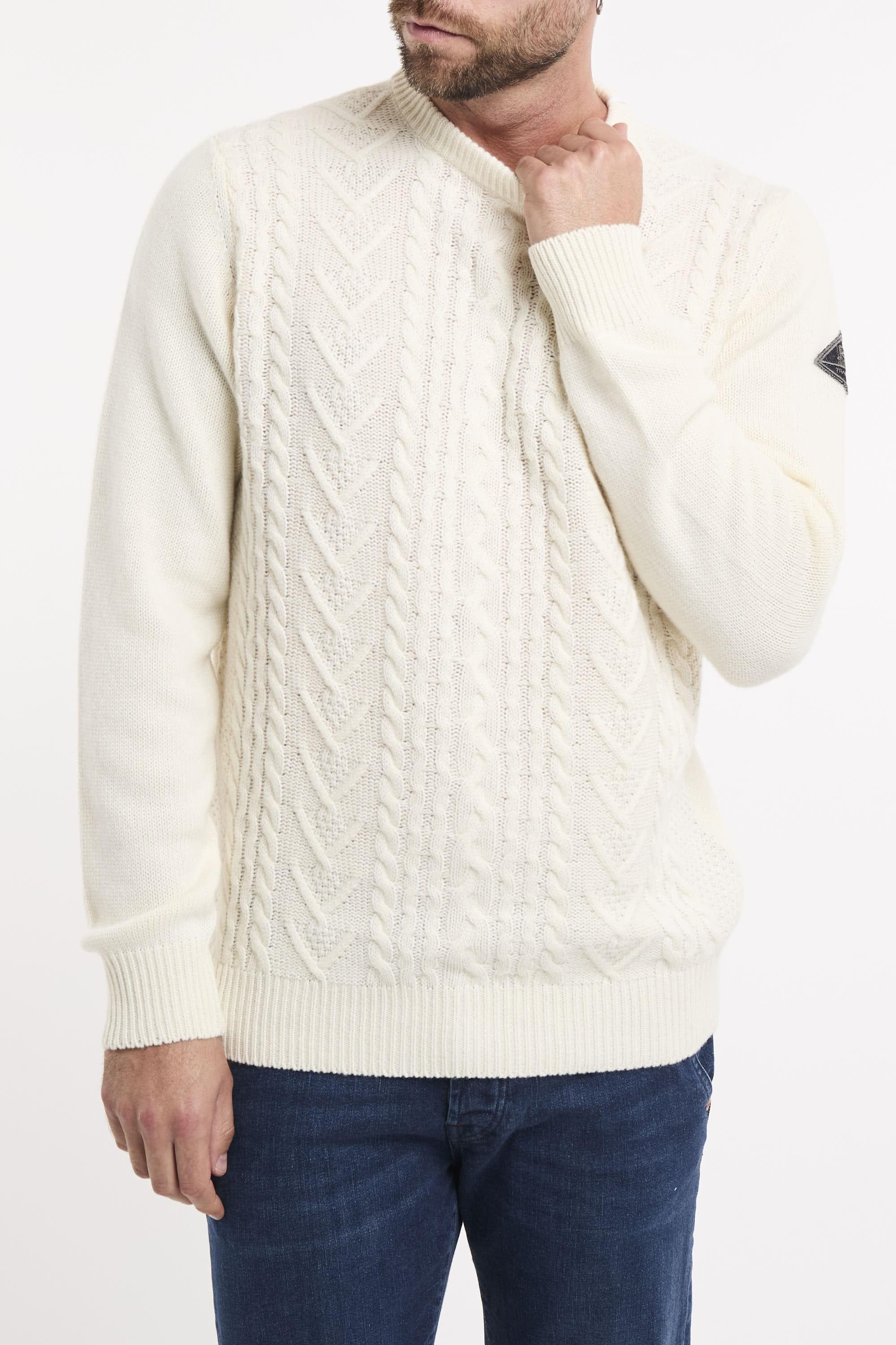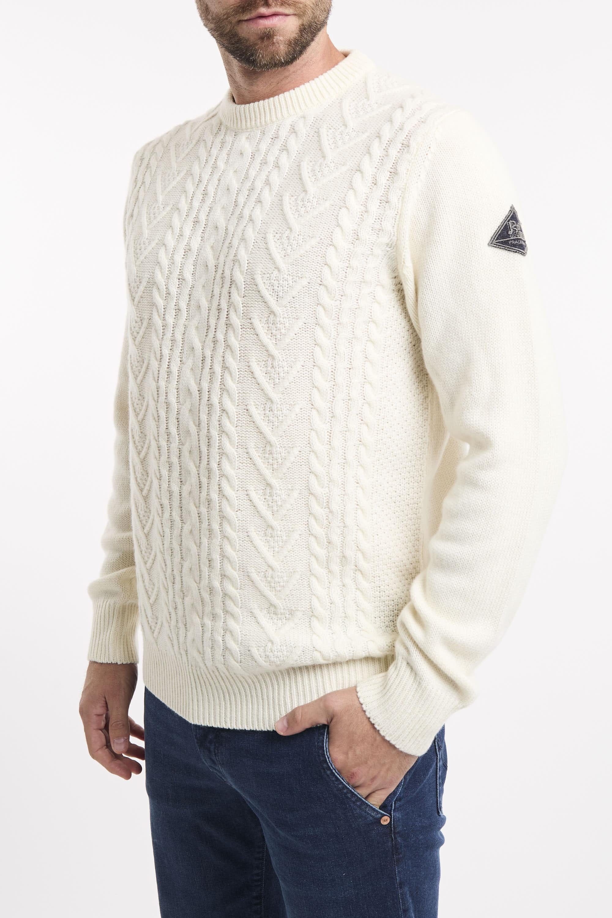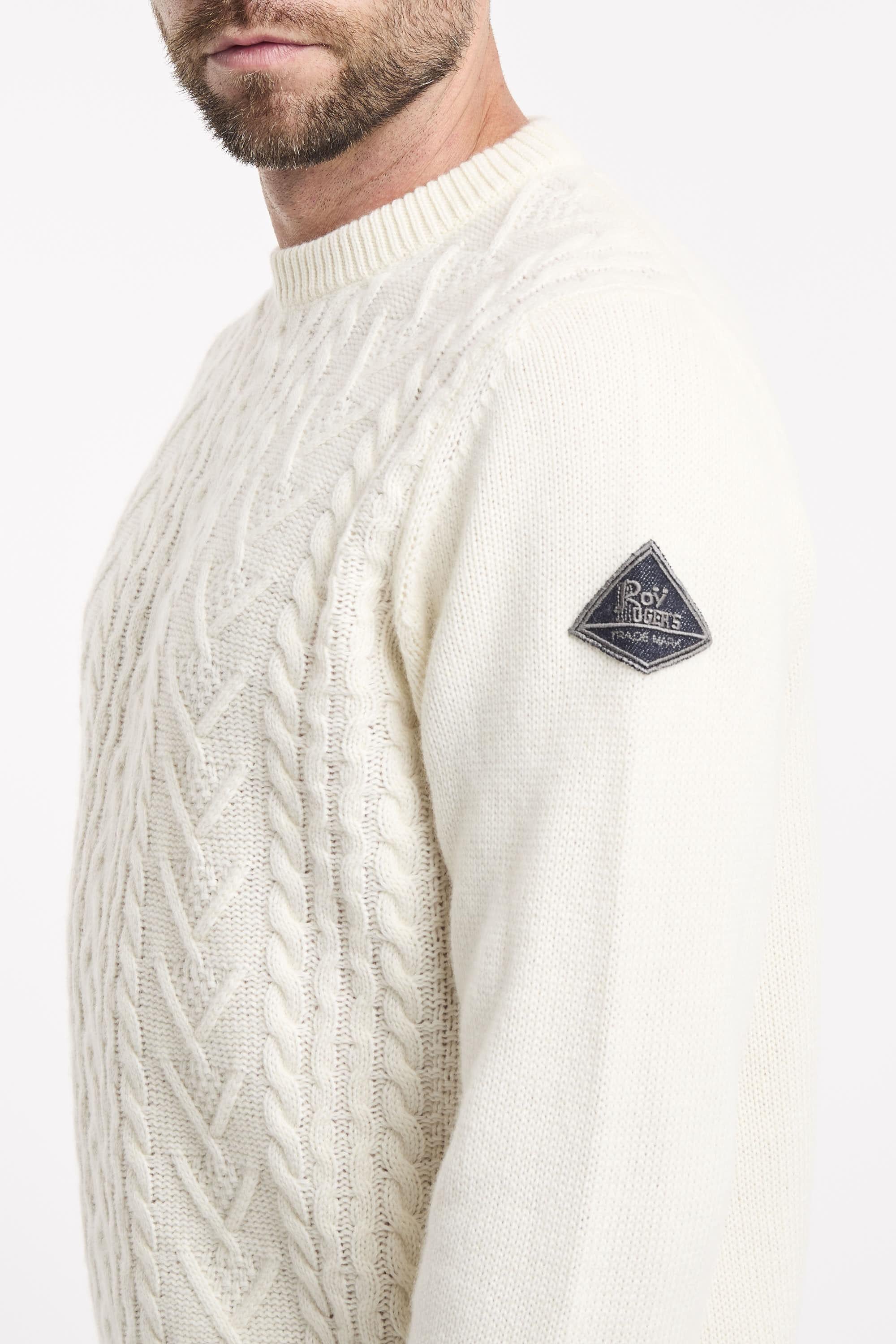 Maglia girocollo in lana e cashmere Fisherman tinta unita. Motivo treccia sul fronte. Maniche lunghe con patch Roy Roger's in denim applicata su una manica. Collo, polsini e fondo a costine. Regular fit. Made in Italy. Il modello è alto 187cm e indossa la taglia L.