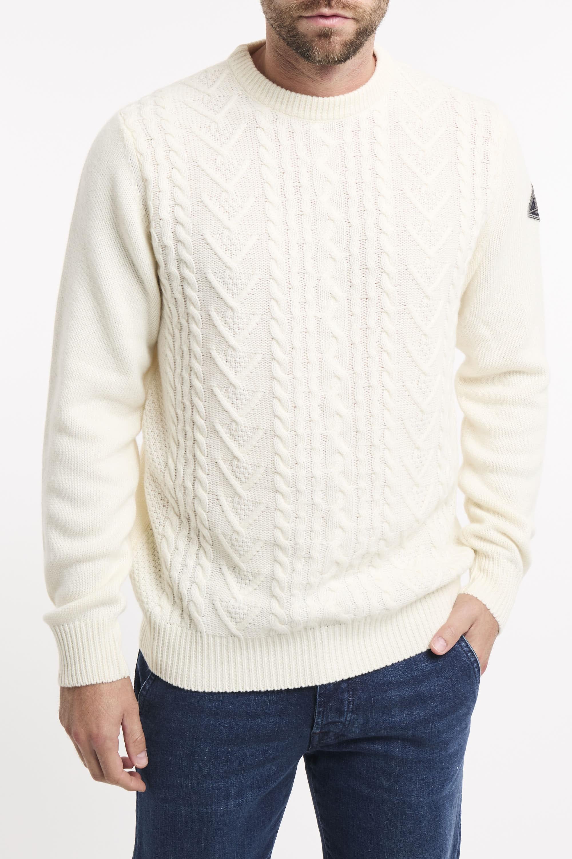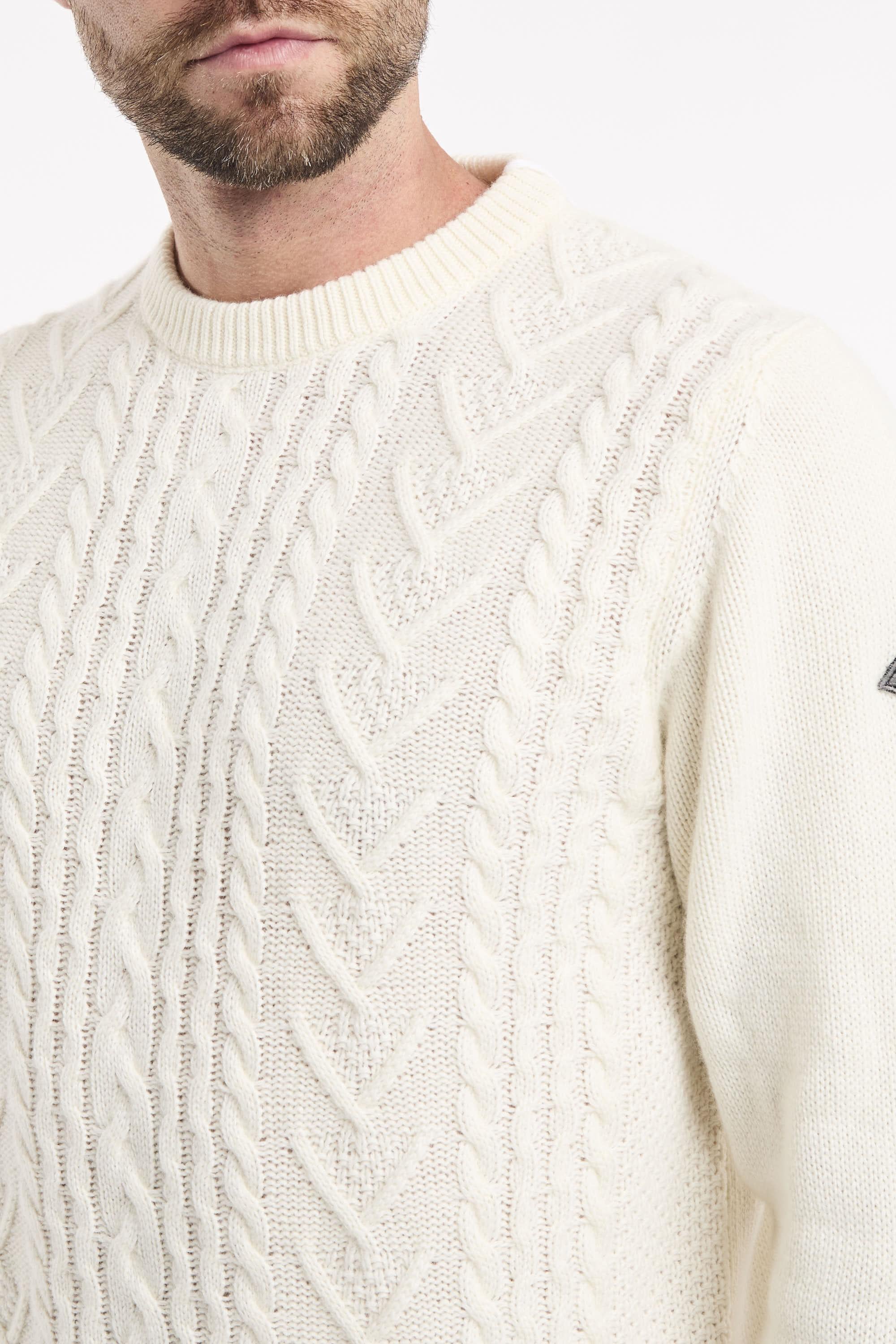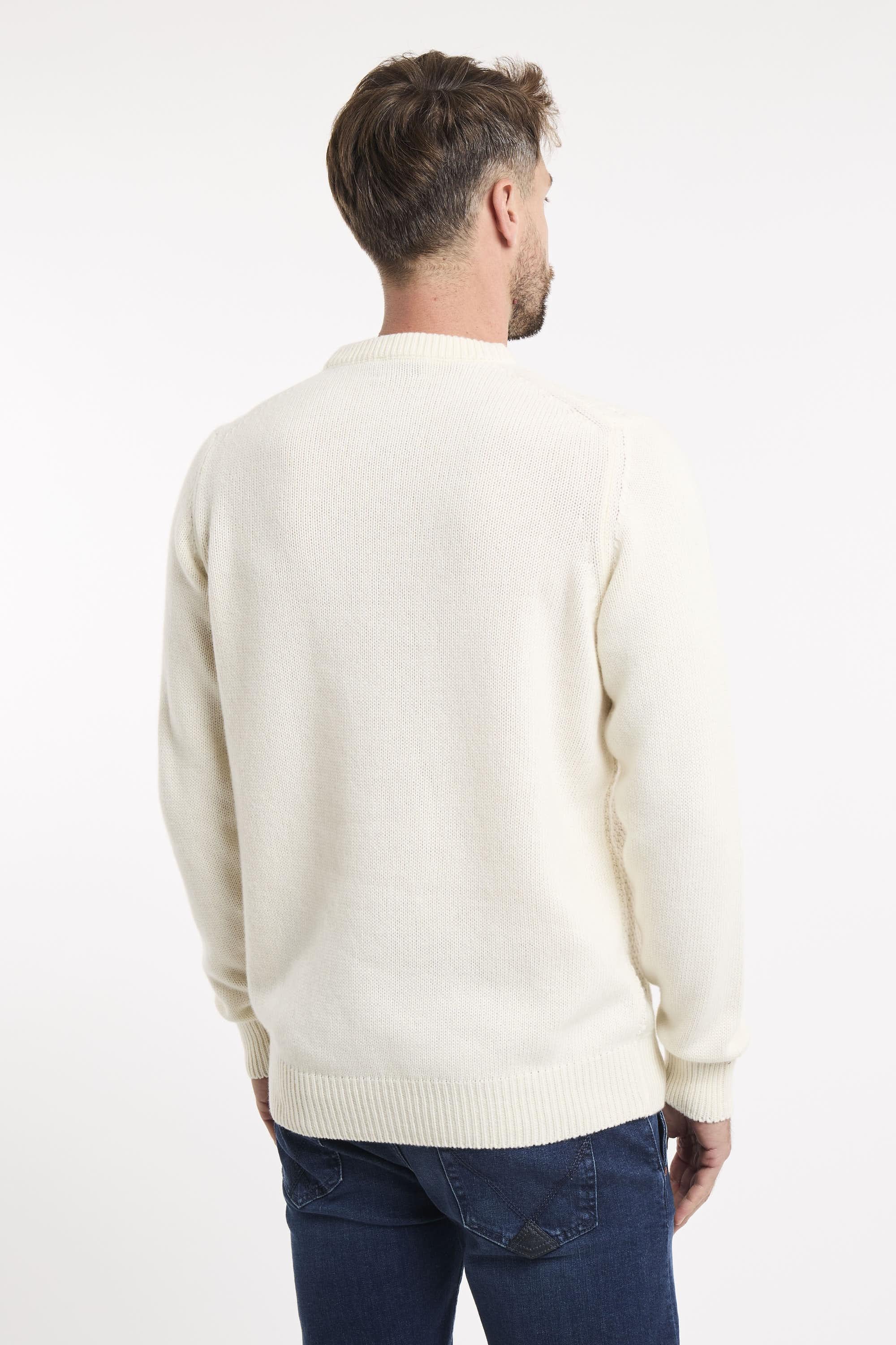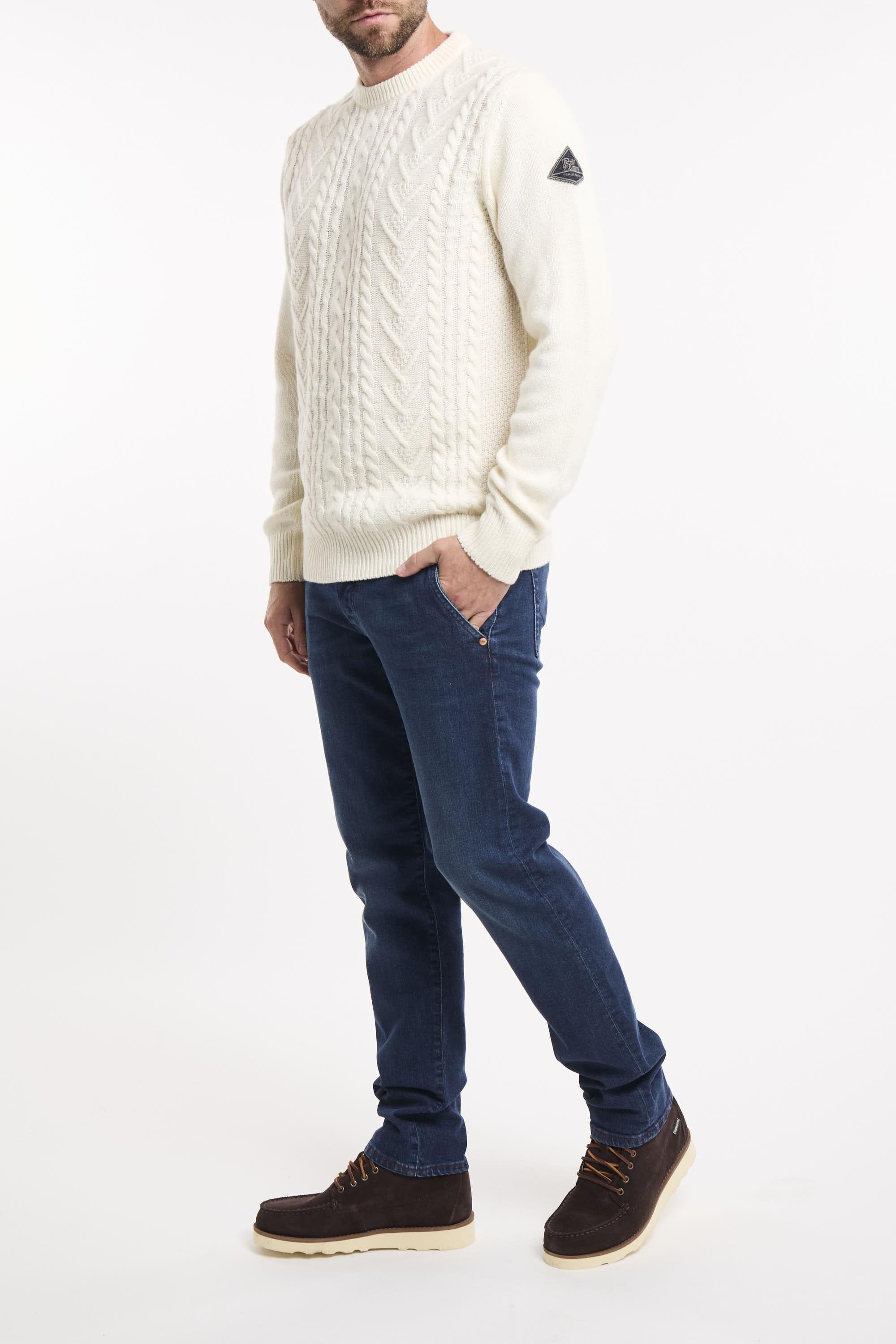Maglia girocollo in lana e cashmere Fisherman tinta unita. Motivo treccia sul fronte. Maniche lunghe con patch Roy Roger's in denim applicata su una manica. Collo, polsini e fondo a costine. Regular fit. Made in Italy. Il modello è alto 187cm e indossa la taglia L.
