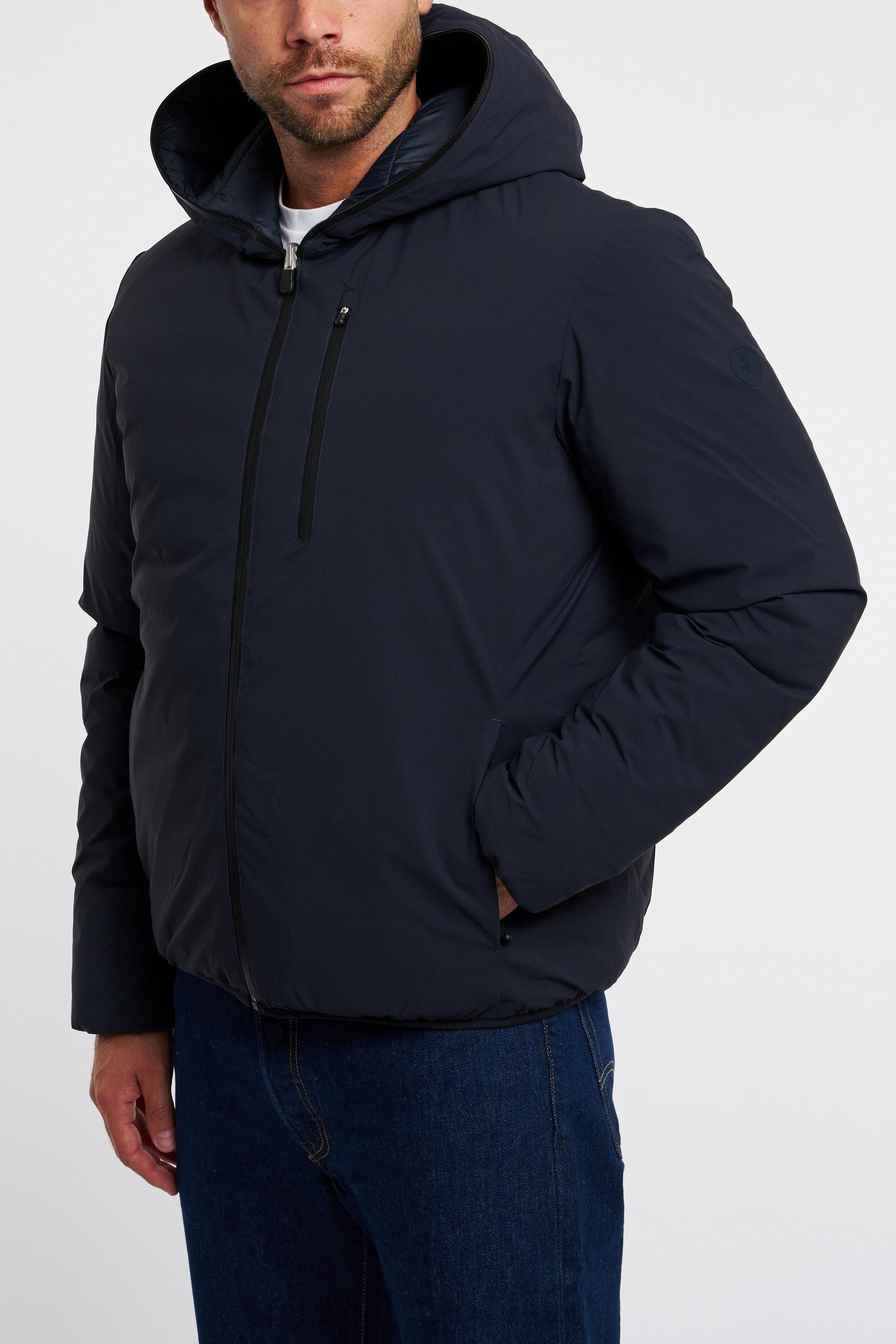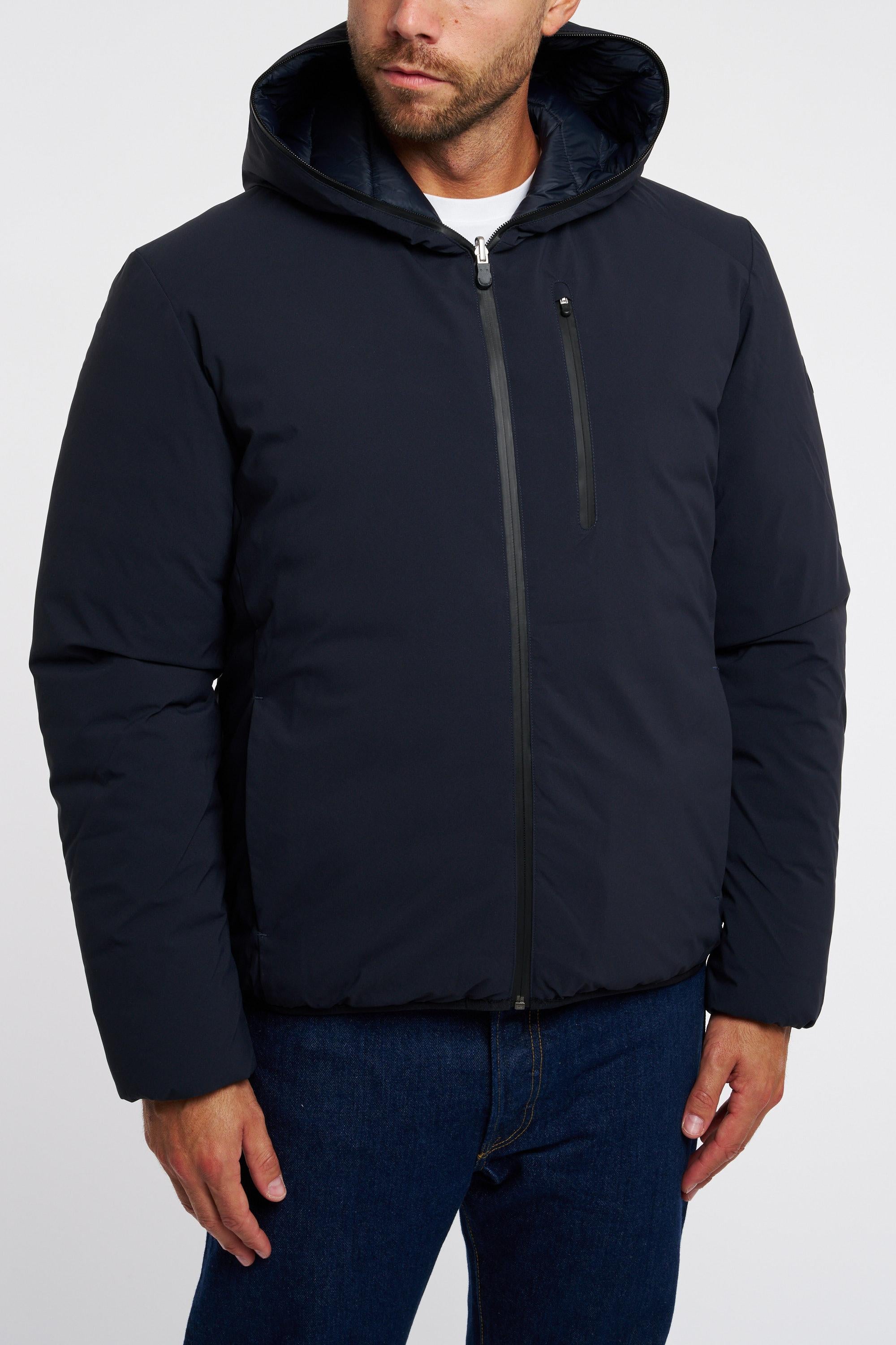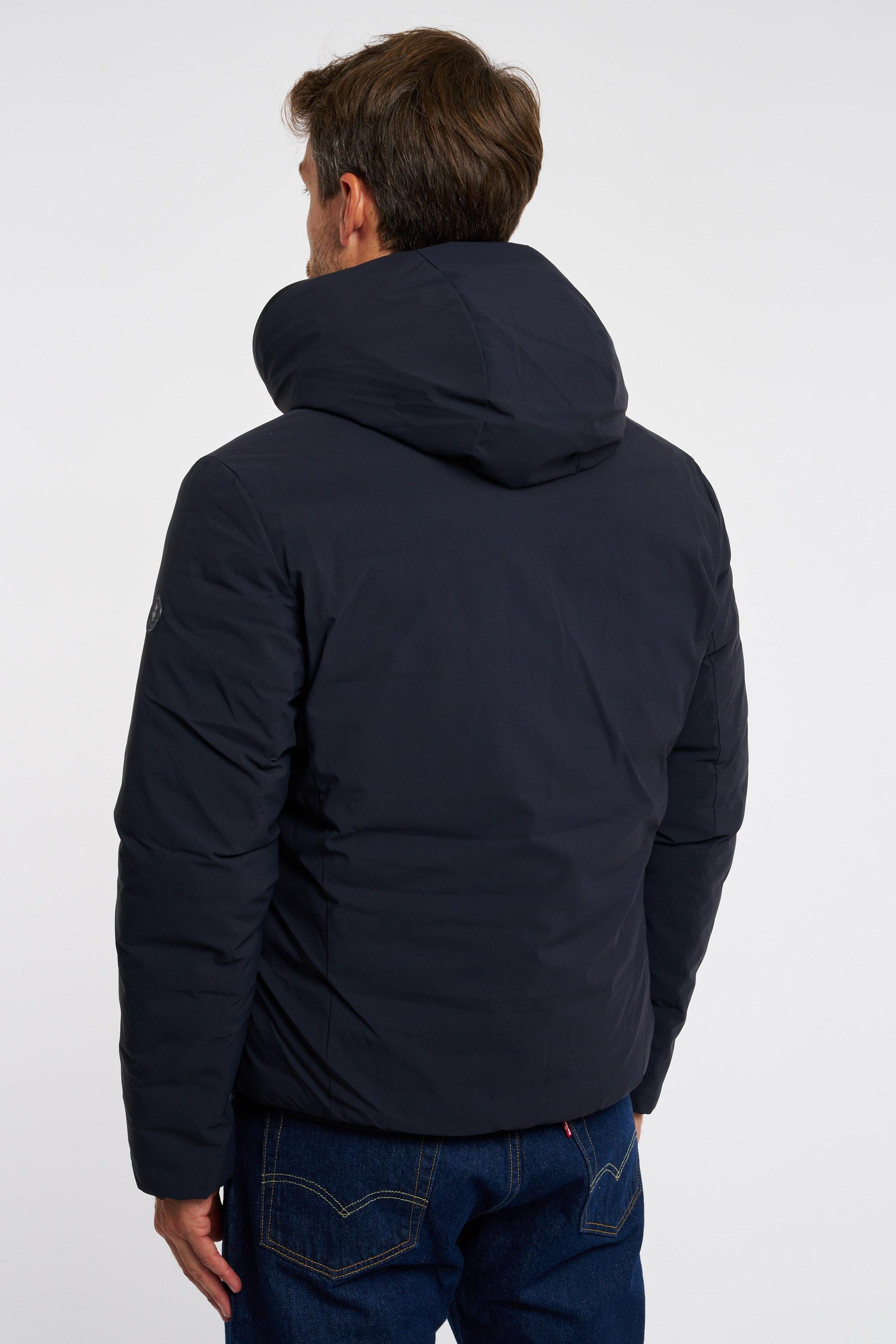 Piumino reversibile Ezra sfida la pioggia con materiali animal-free riciclati da bottiglie di plastica. Caratterizzato da un lato liscio e uno trapuntato, il modello ha chiusura centrale con zip water-resistant, tasche basse zippate e comode finiture in lycra al fondo e ai polsi. Tiretto personalizzato e il discreto logo tono su tono incollato a caldo sulla manica. Il modello è alto 187cm e indossa la taglia L.