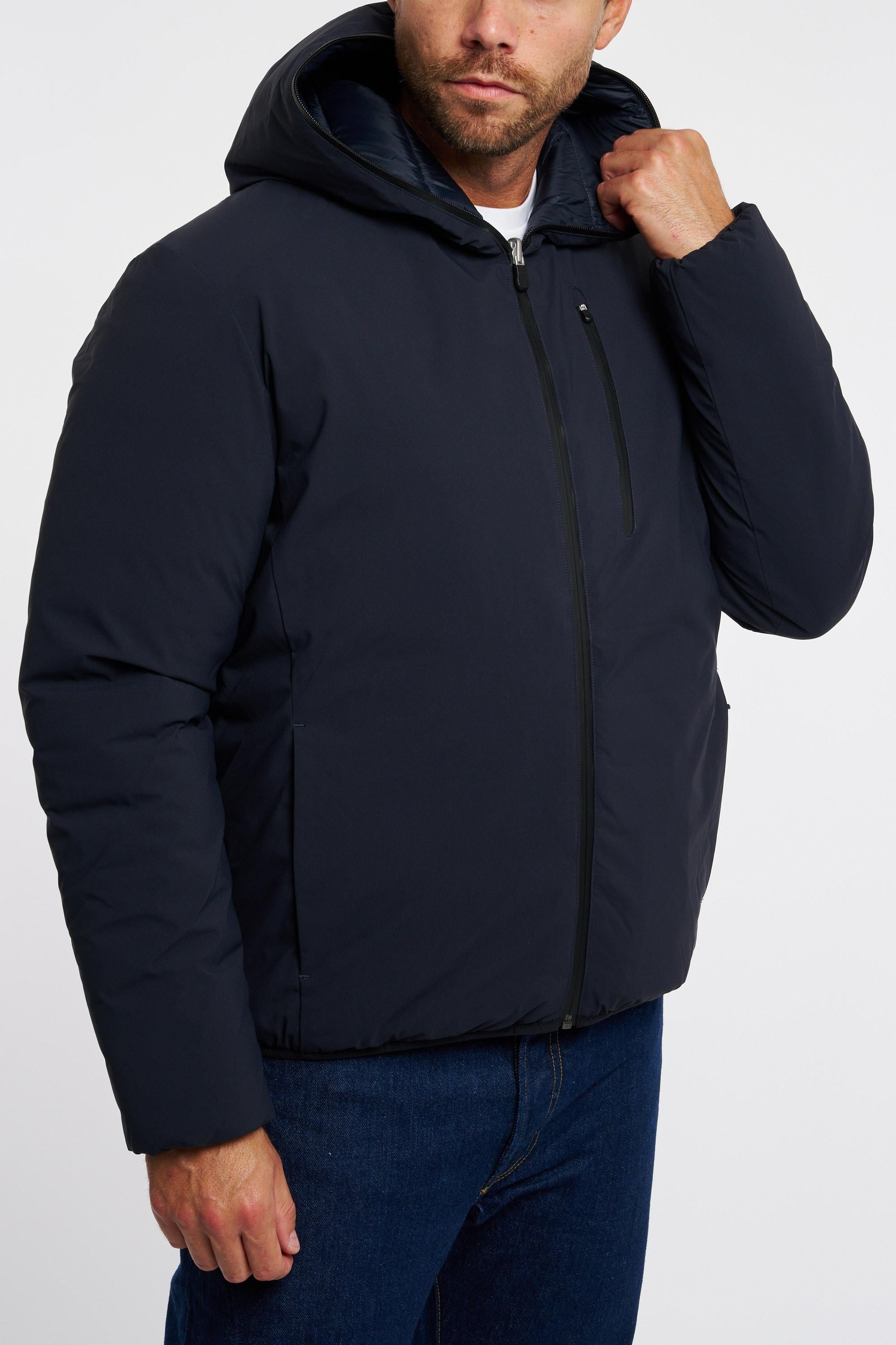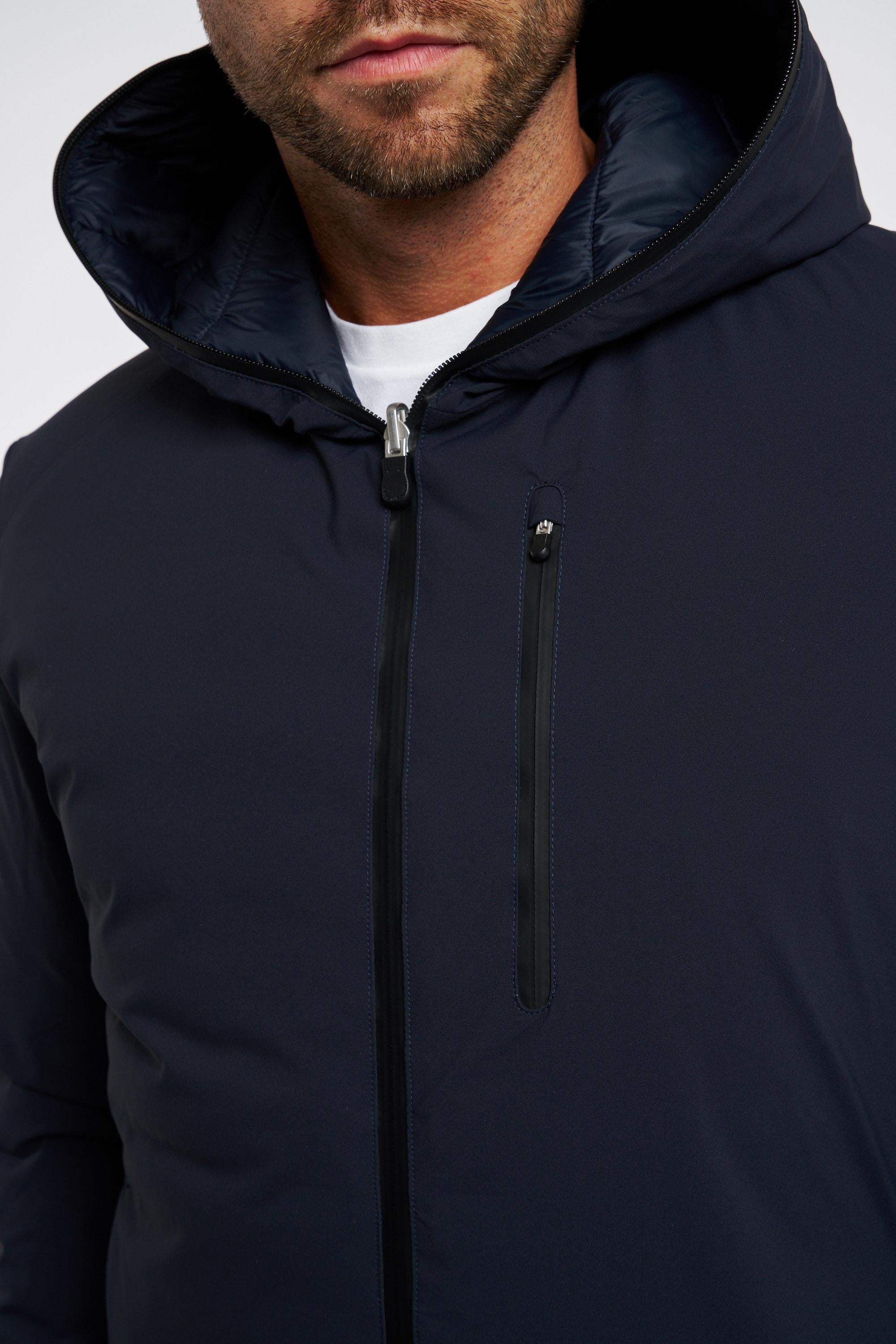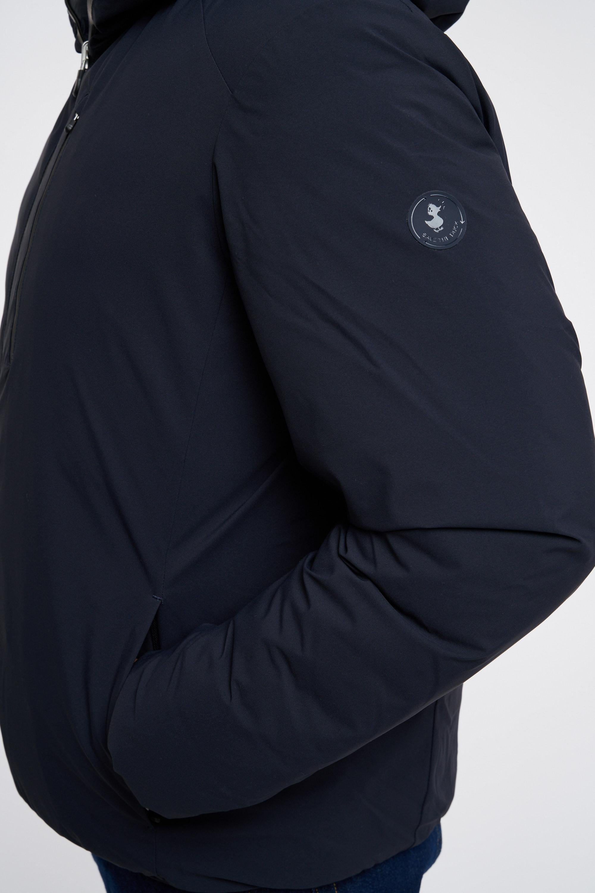 Piumino reversibile Ezra sfida la pioggia con materiali animal-free riciclati da bottiglie di plastica. Caratterizzato da un lato liscio e uno trapuntato, il modello ha chiusura centrale con zip water-resistant, tasche basse zippate e comode finiture in lycra al fondo e ai polsi. Tiretto personalizzato e il discreto logo tono su tono incollato a caldo sulla manica. Il modello è alto 187cm e indossa la taglia L.