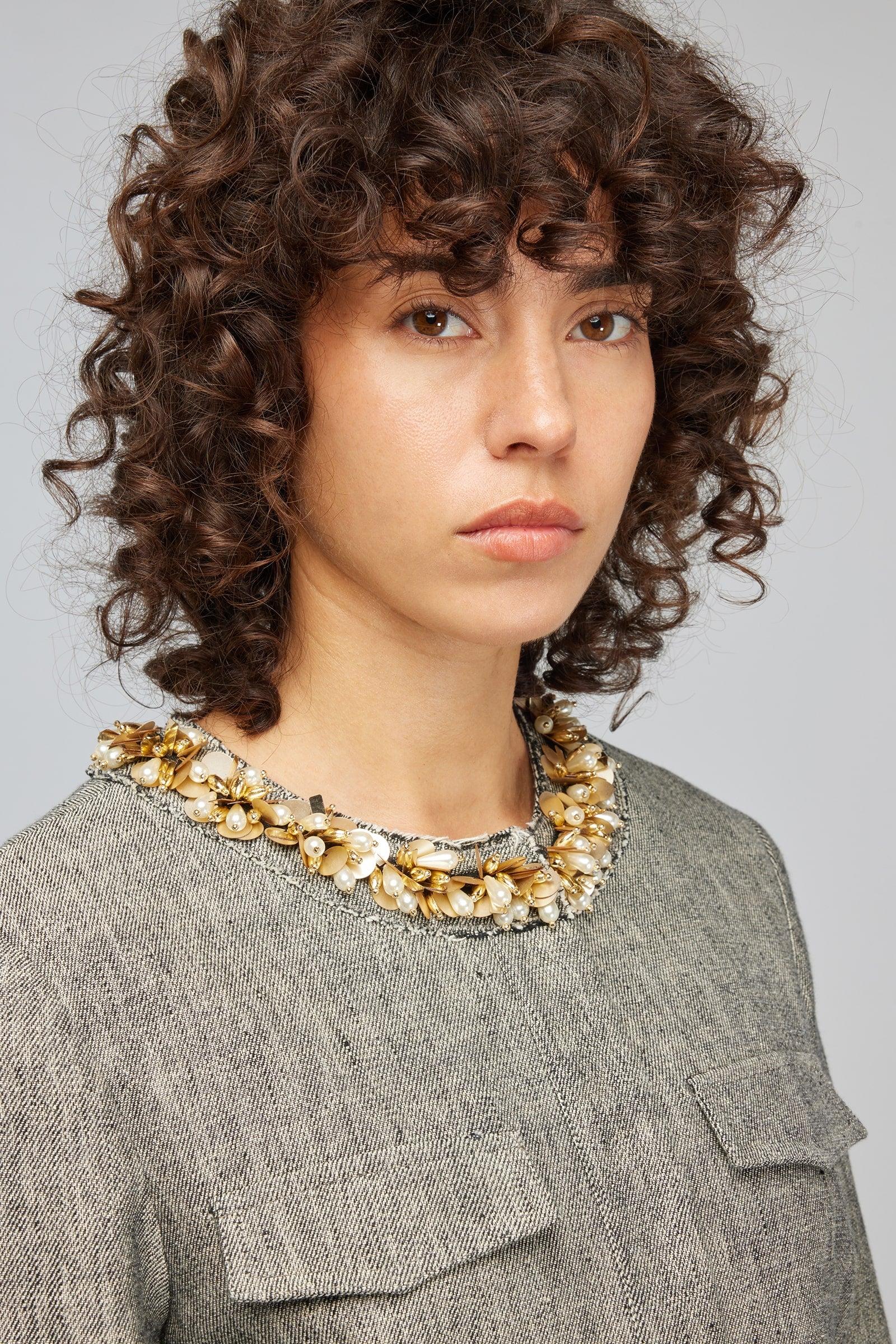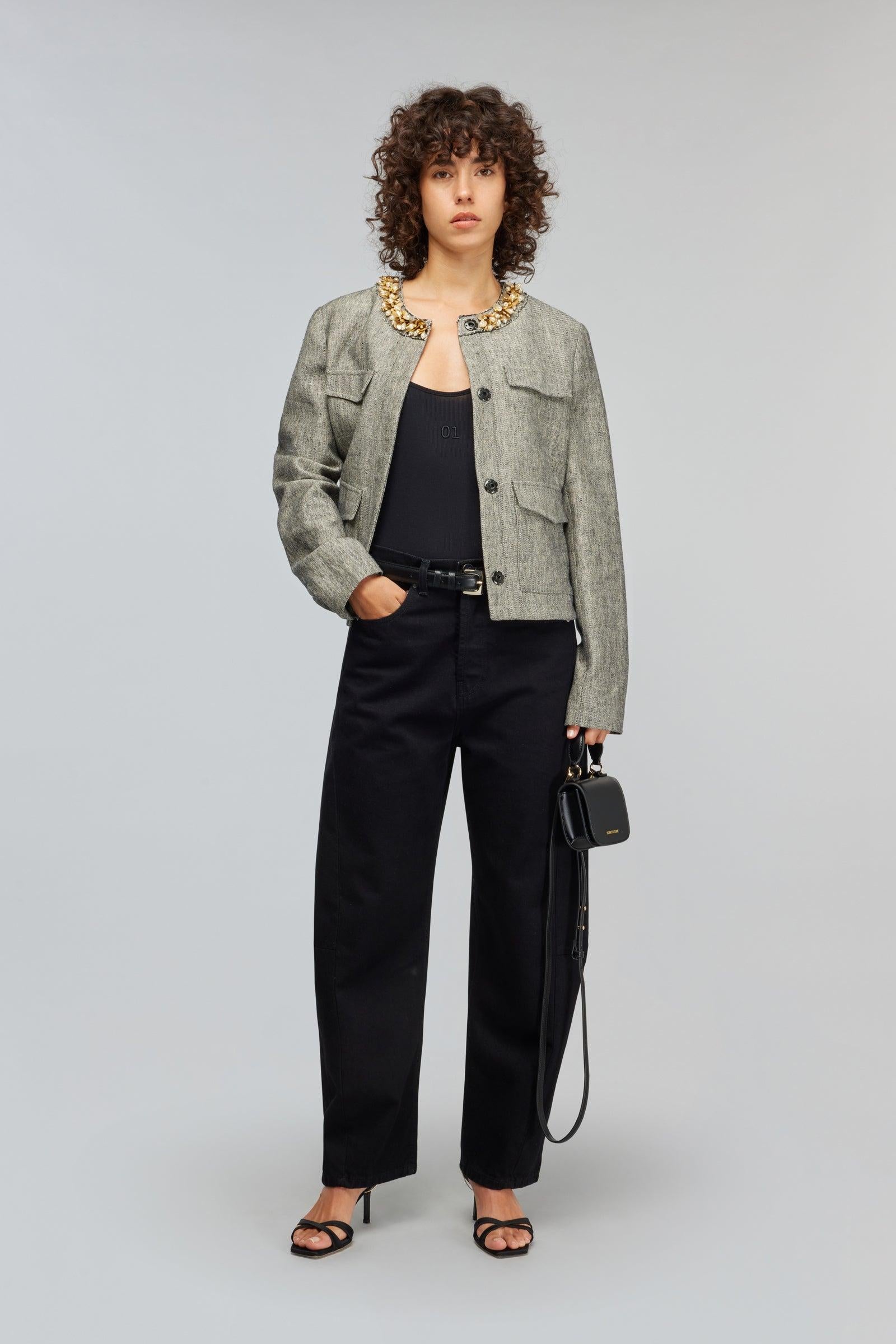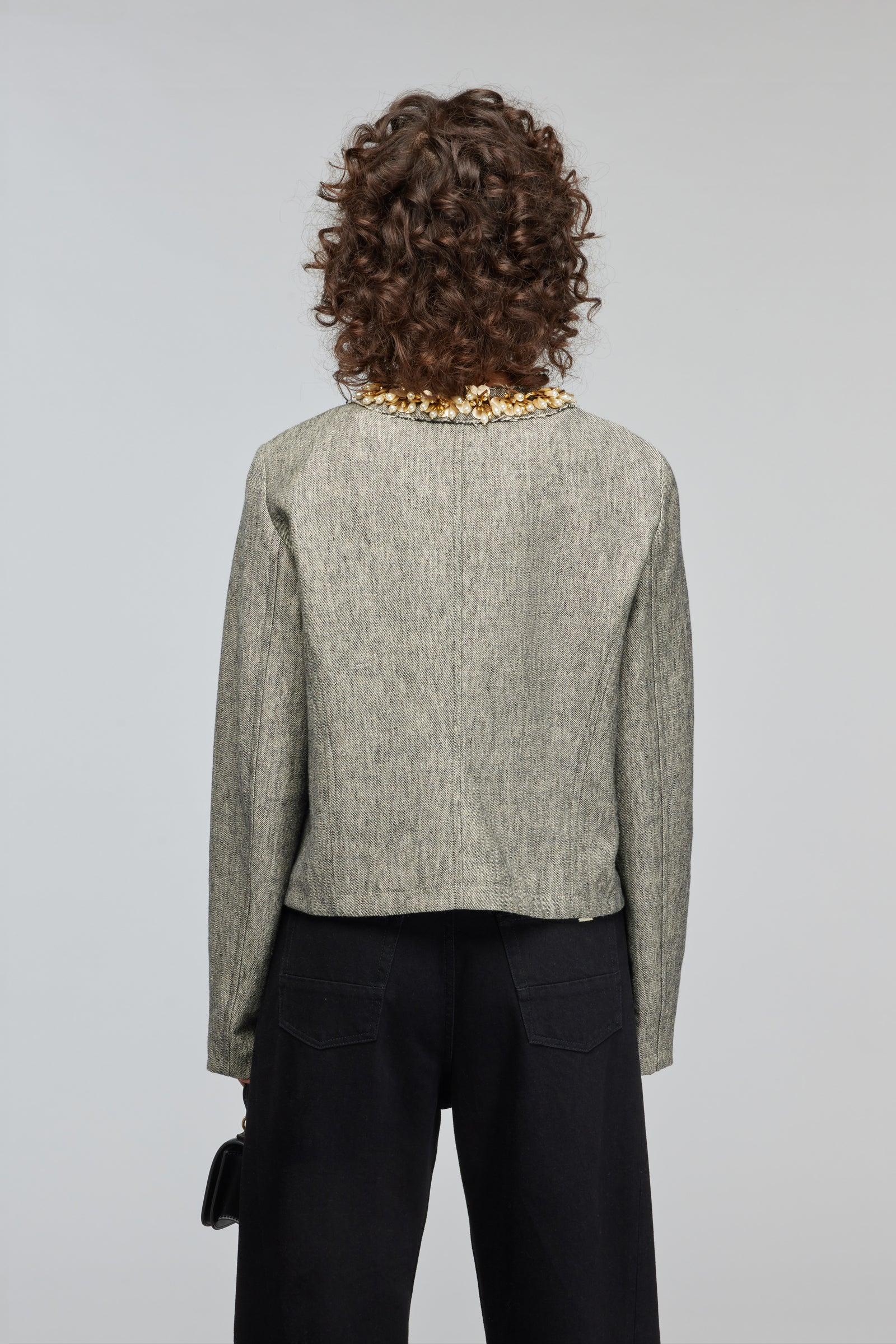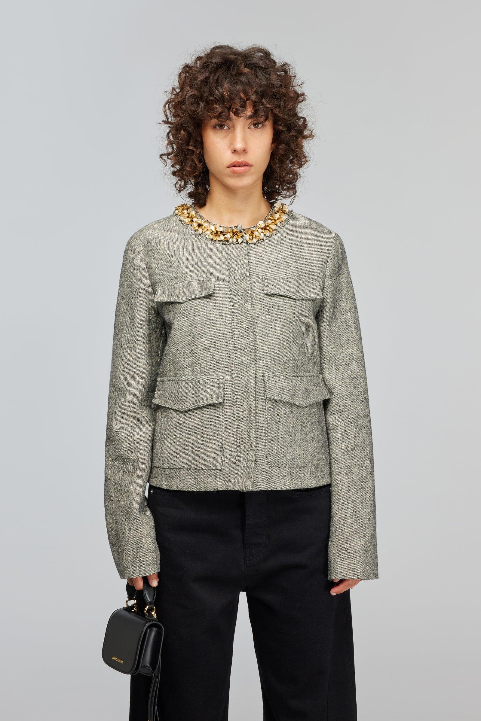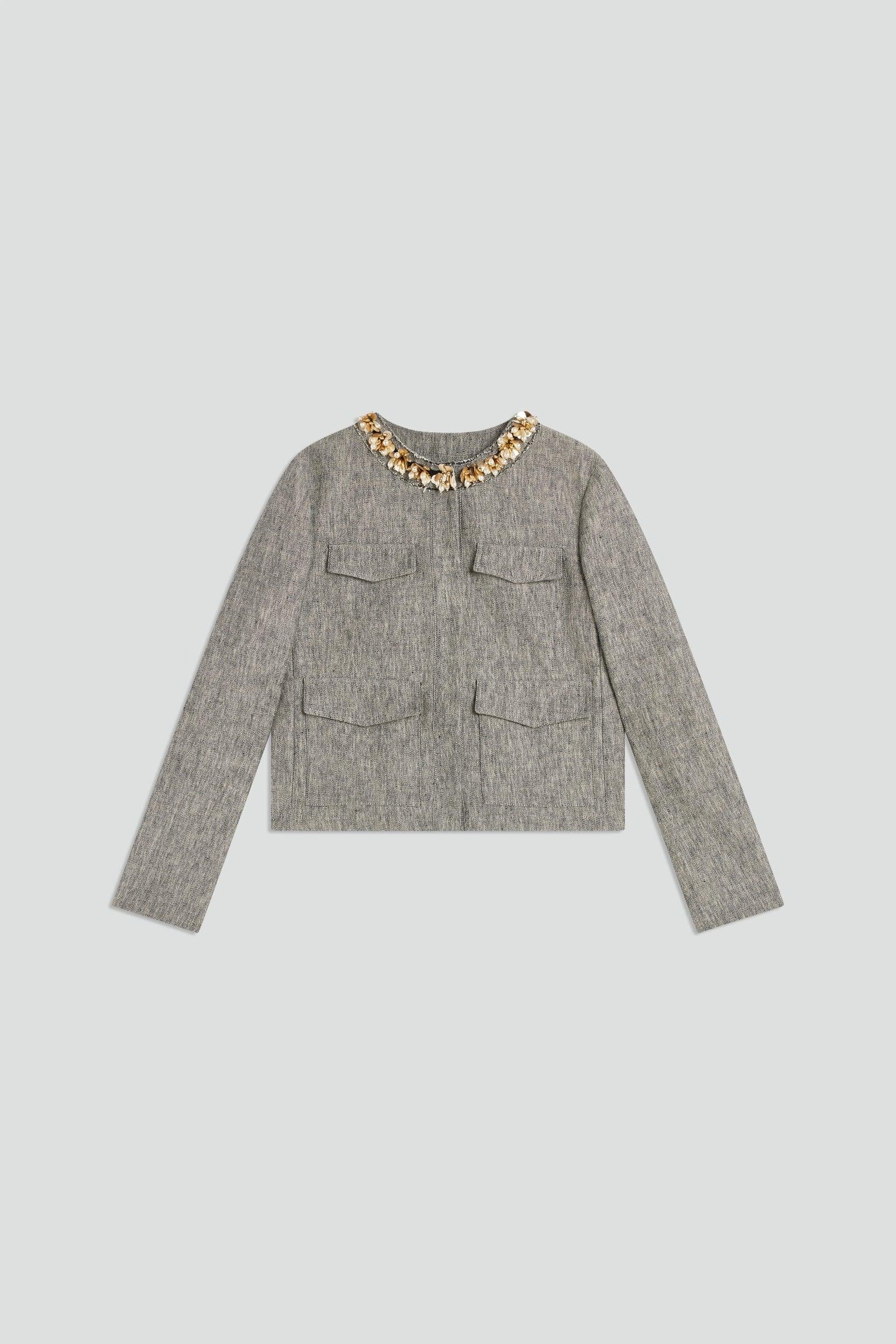 Giacca in cotone lino fiammato. Modello girocollo, quattro tasche con patta. Dettaglio ricamo di paillette e perline su collo. Lunghezza bacino, vestibilità regulare. La modella è alta 178 cm e indossa la taglia 40. Made in Italy.