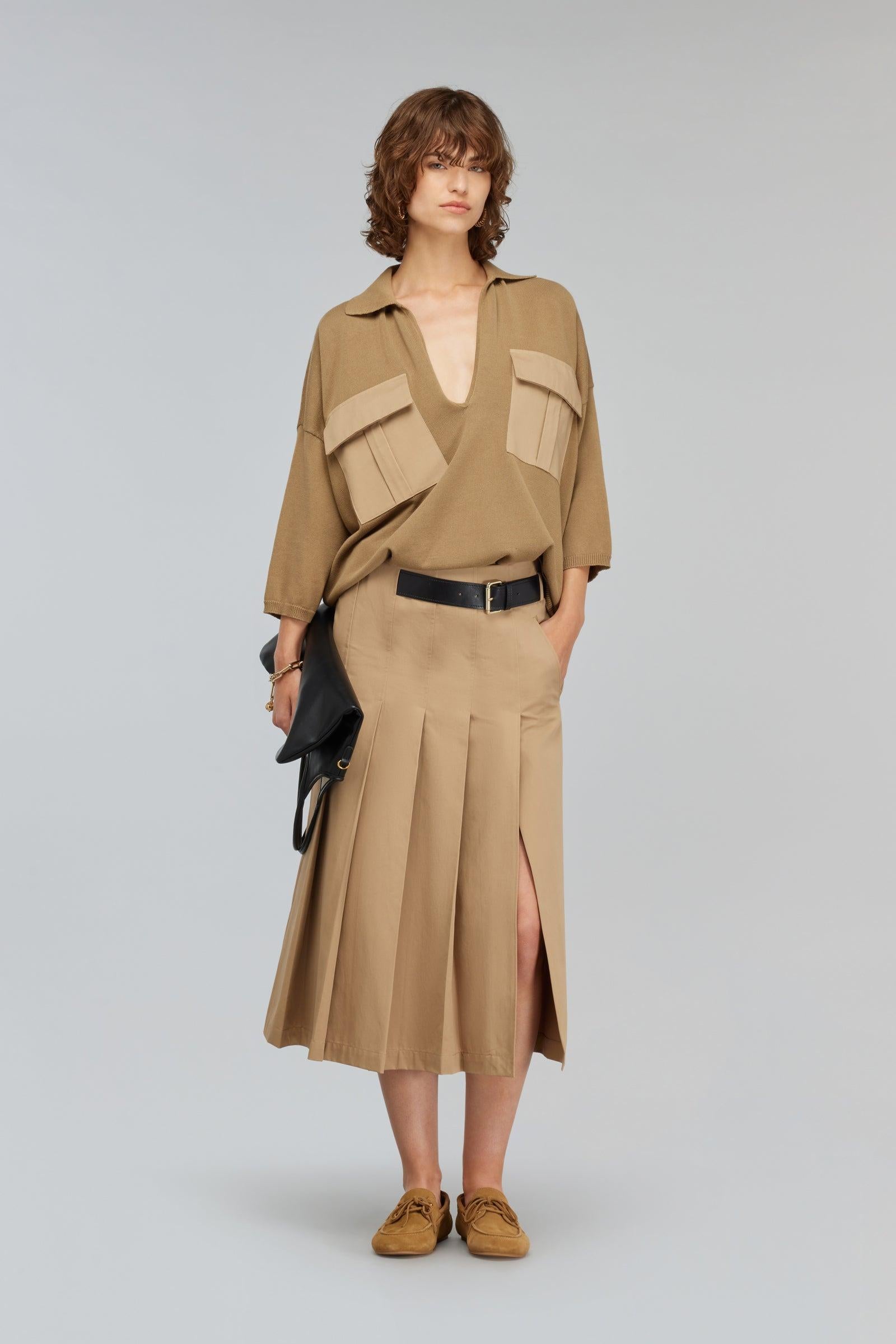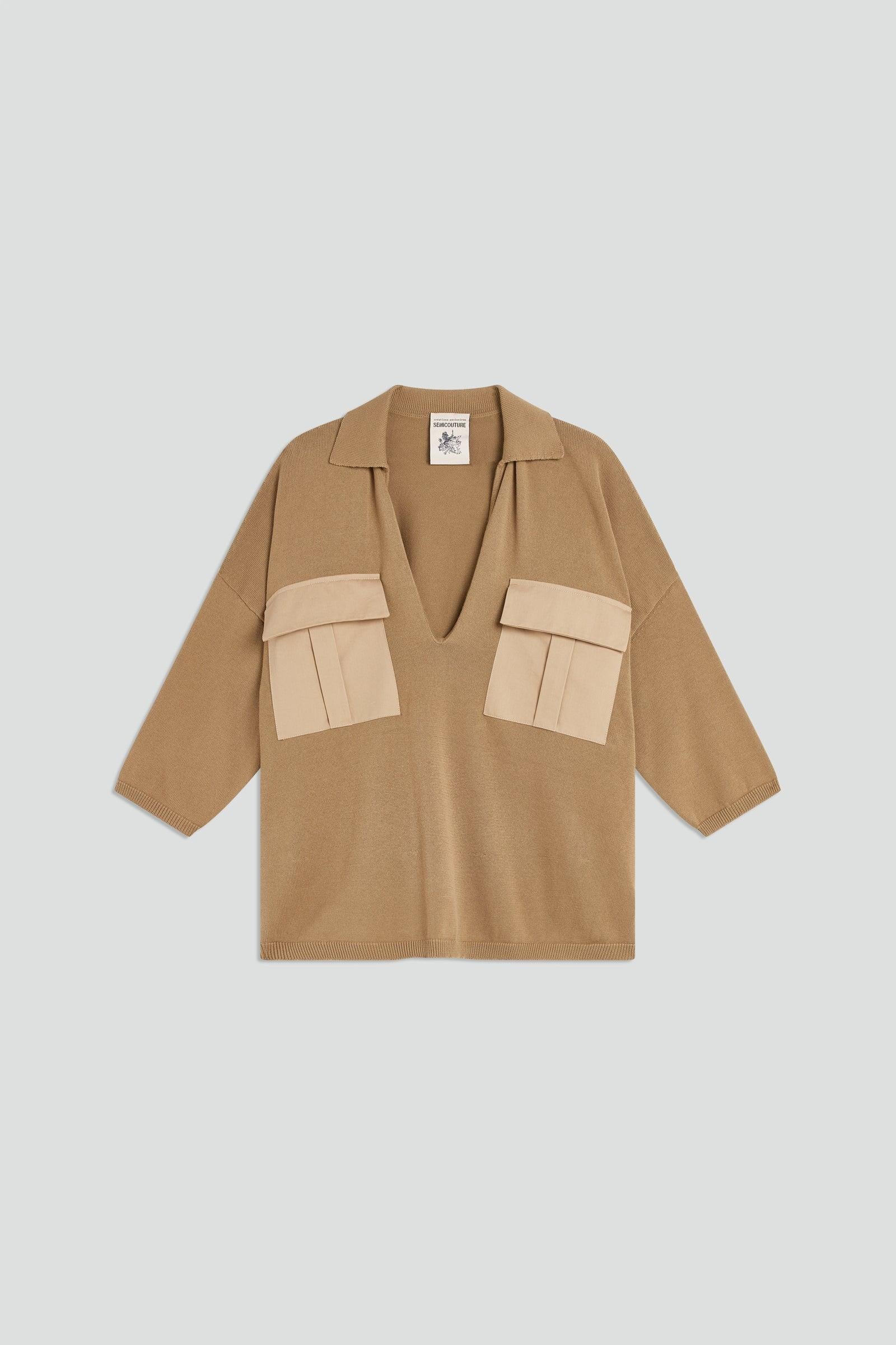 Polo in cotone, ampio scollo a V. Manica lunga, fondo e polsi con costine. Due tasche in gabardina, applicate. Vestibilità over, lunghezza bacino. La modella è alta 178 cm e indossa la taglia S. Made in Italy.