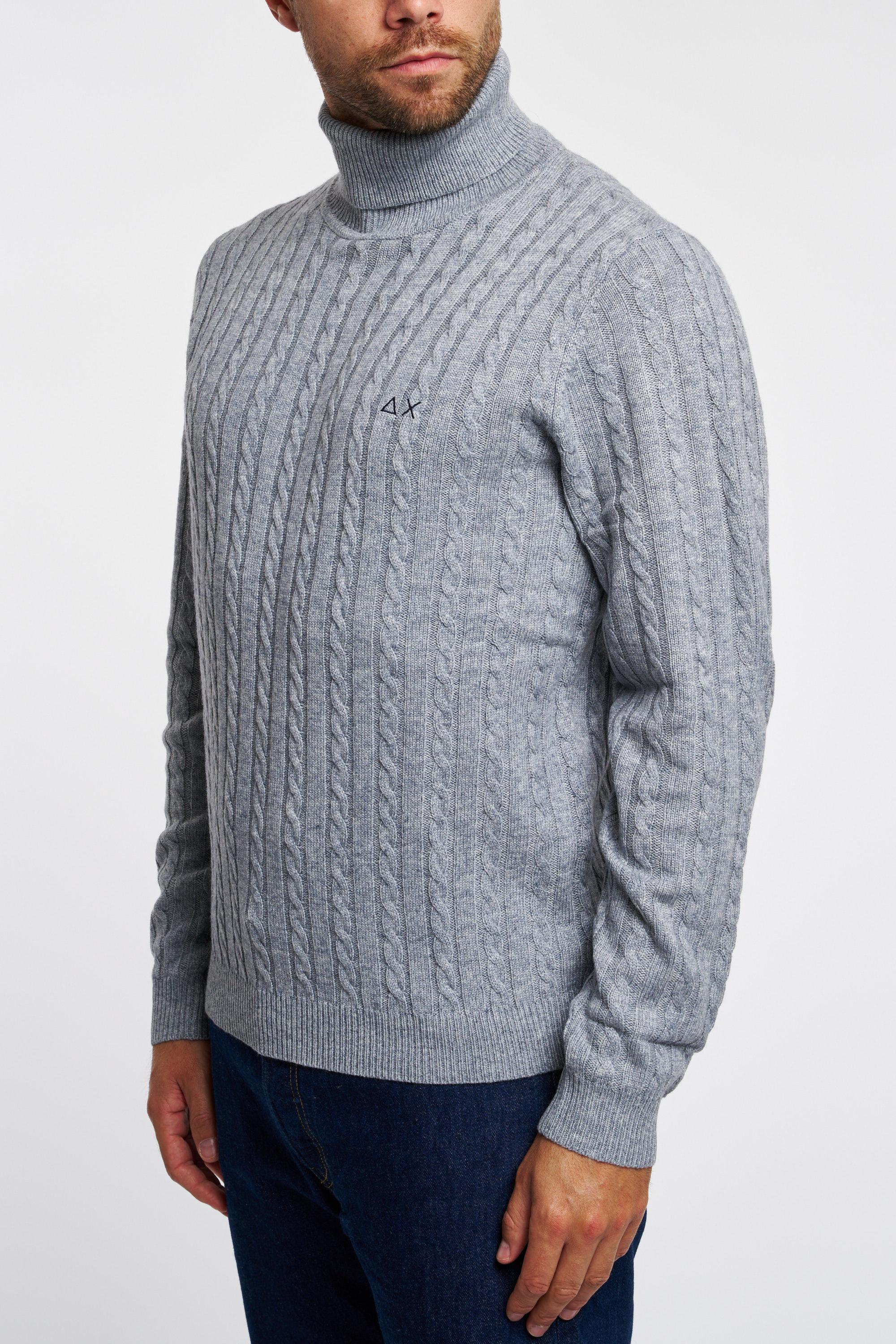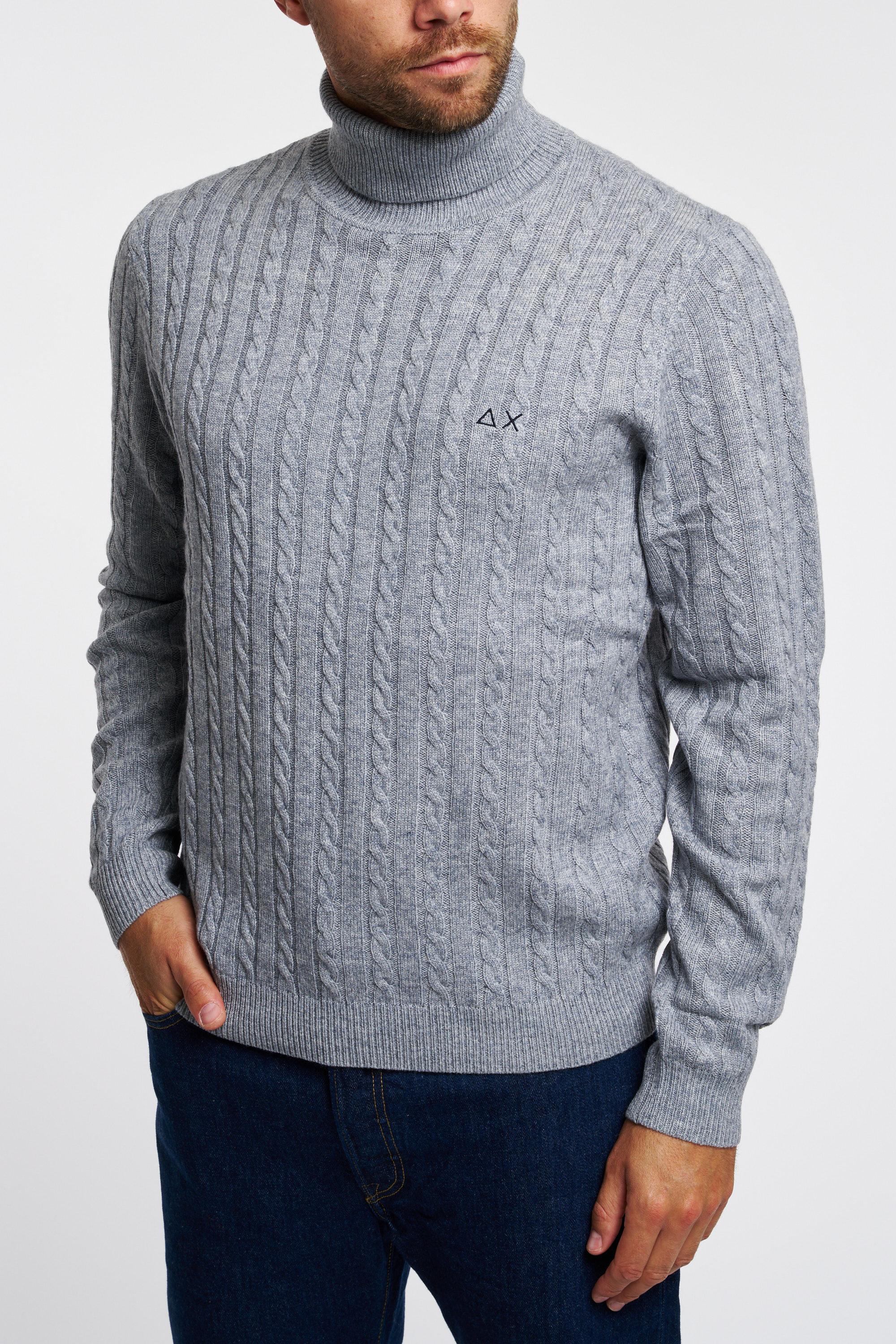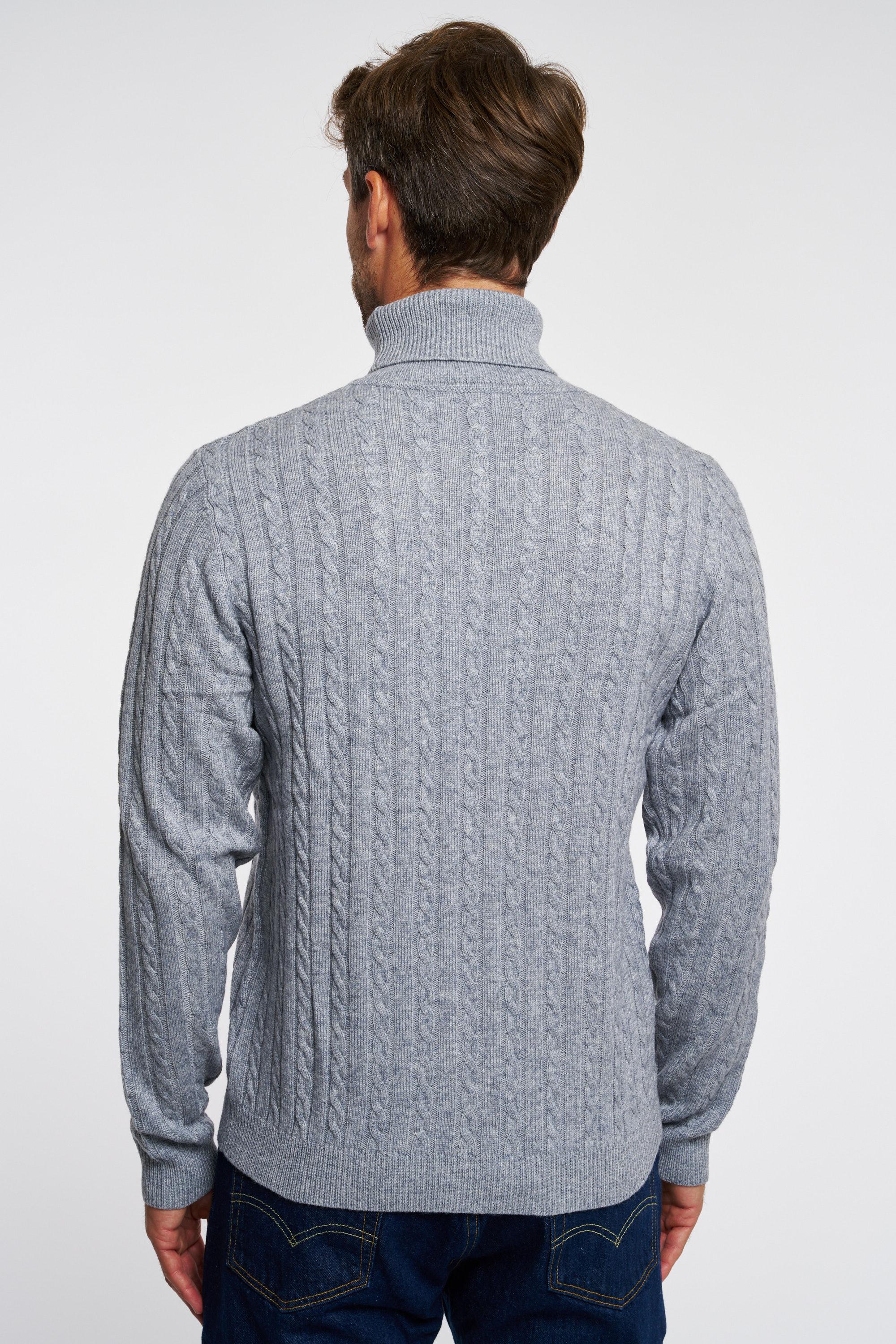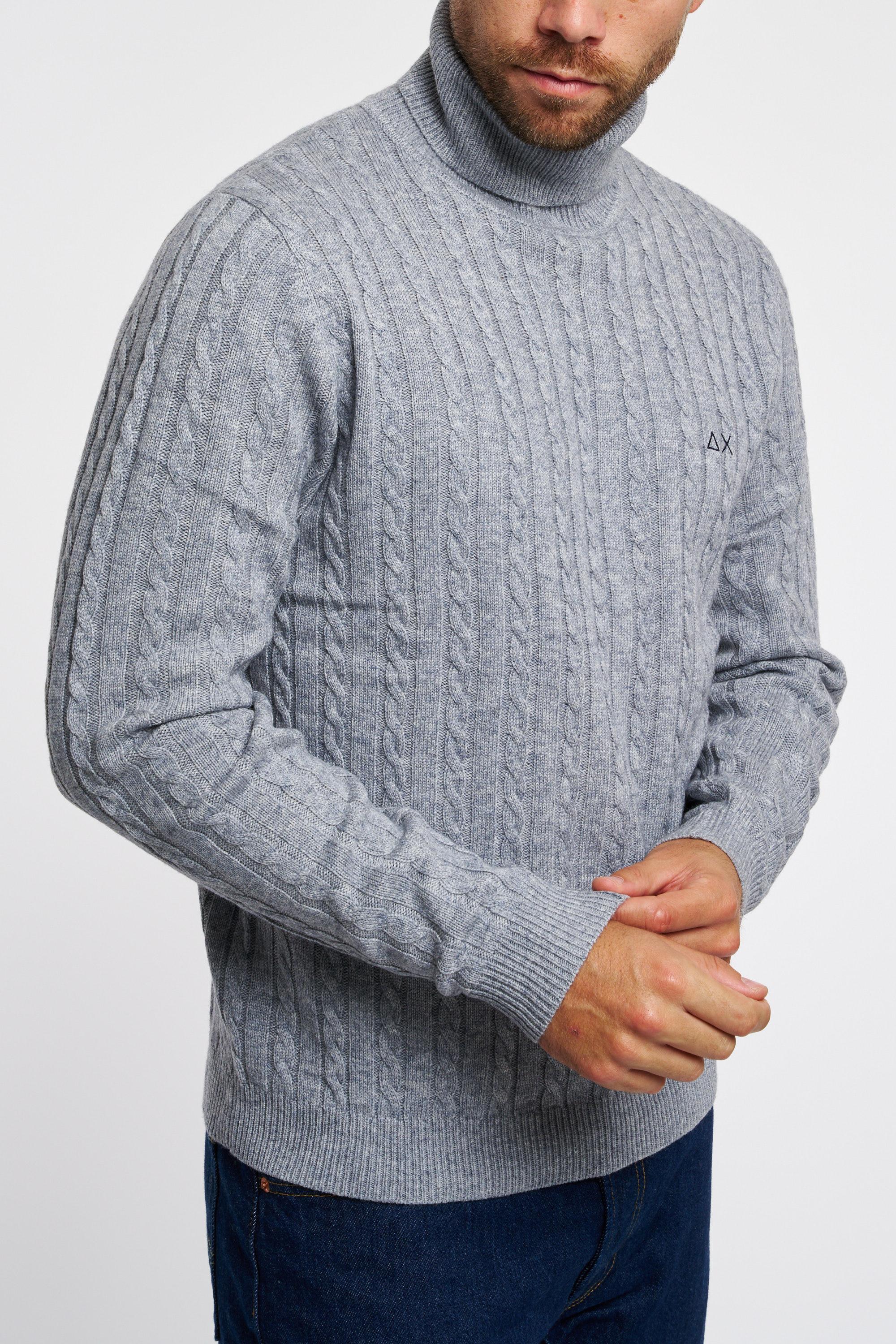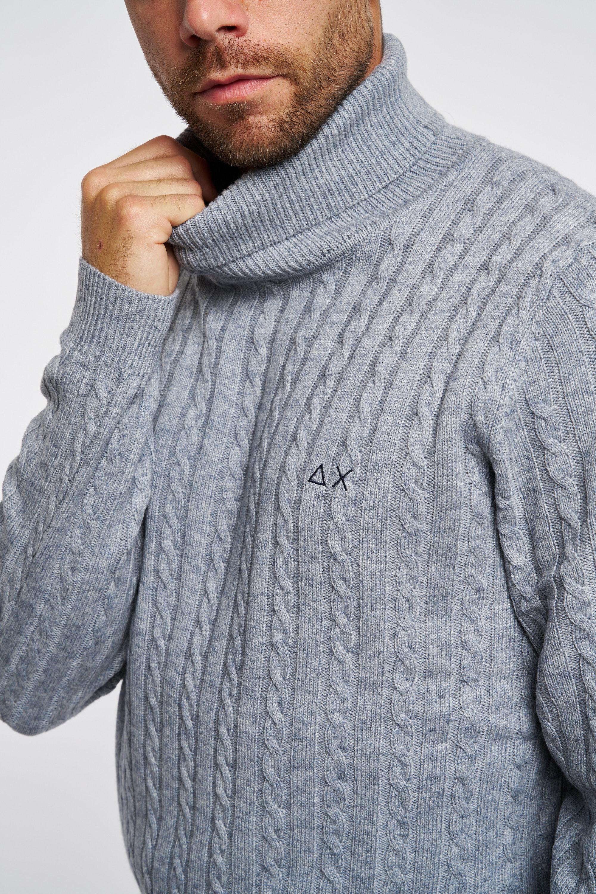 Maglia collo alto maniche lunghe a treccia con piccolo logo ricamato sul petto a sinistra. Il modello è alto 187cm e indossa la taglia L.