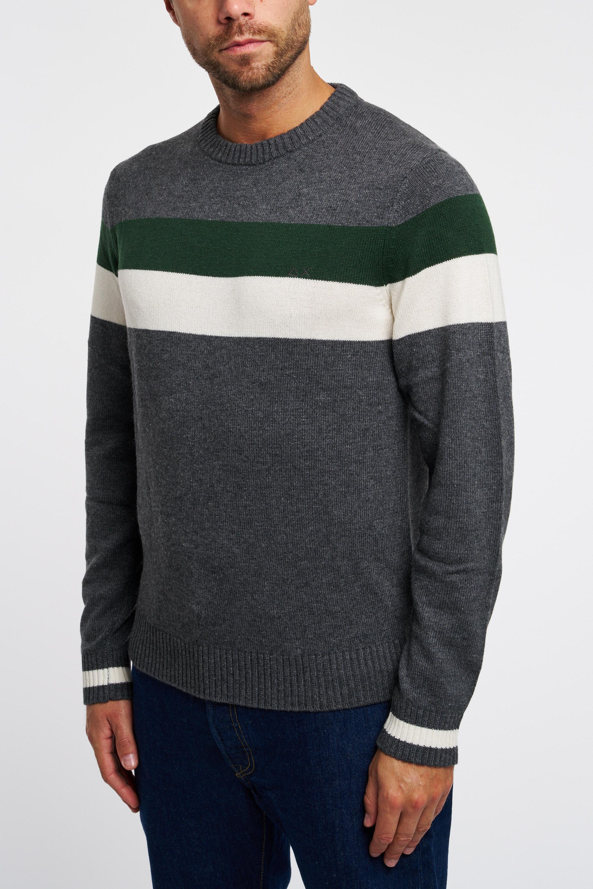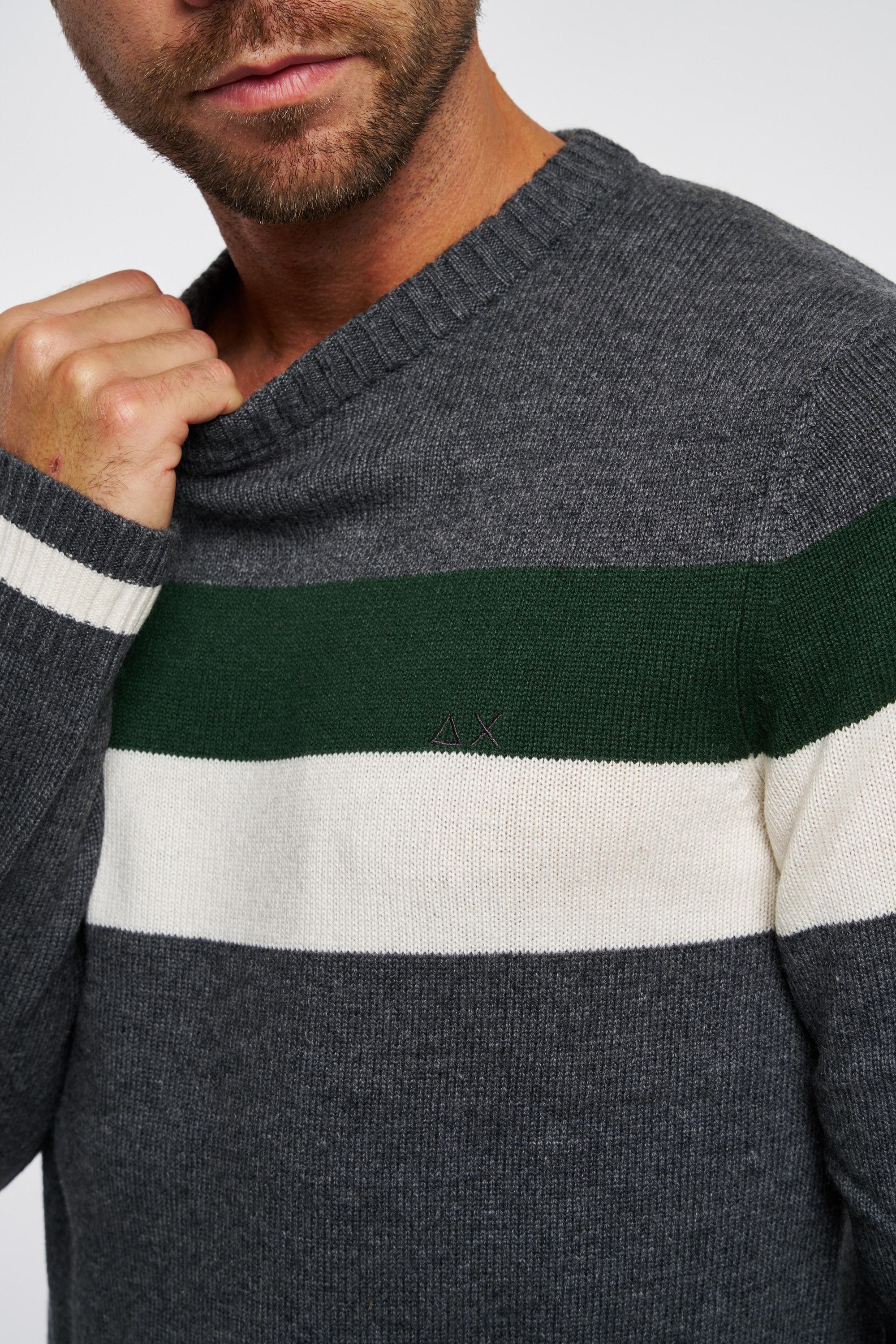 Maglia girocollo maniche lunghe a righe con piccolo logo ricamato sul petto a sinistra. Il modello è alto 187cm e indossa la taglia L.