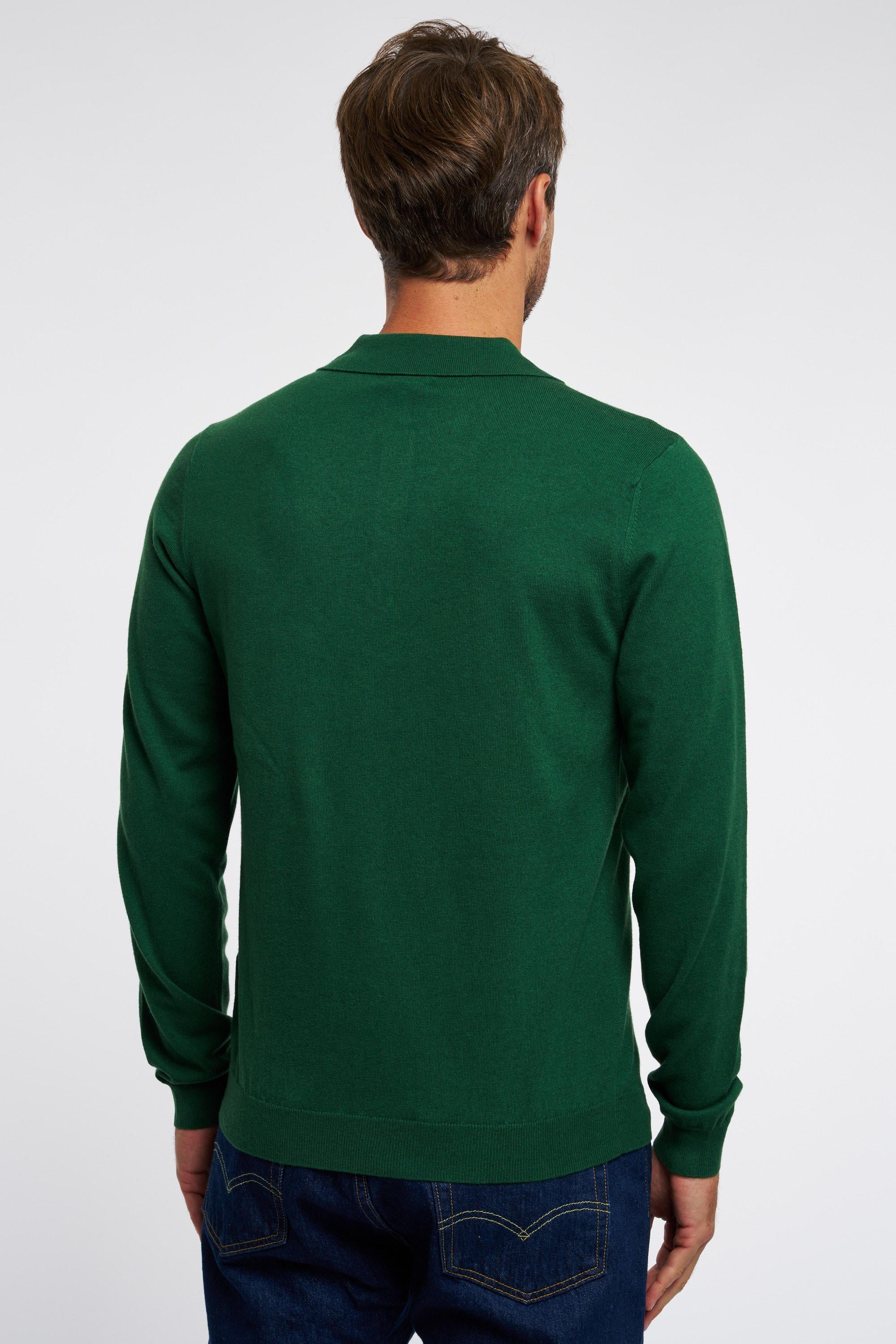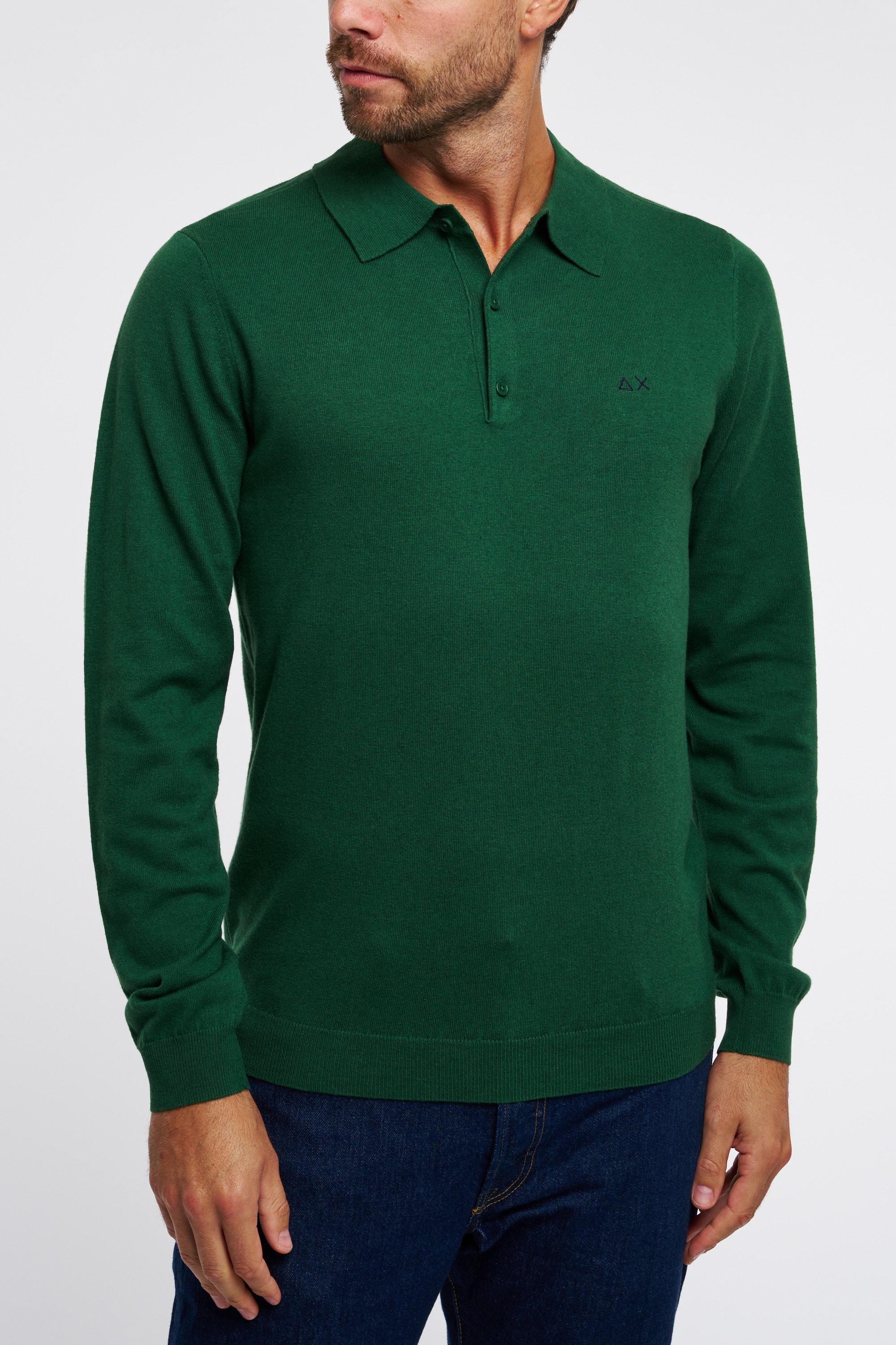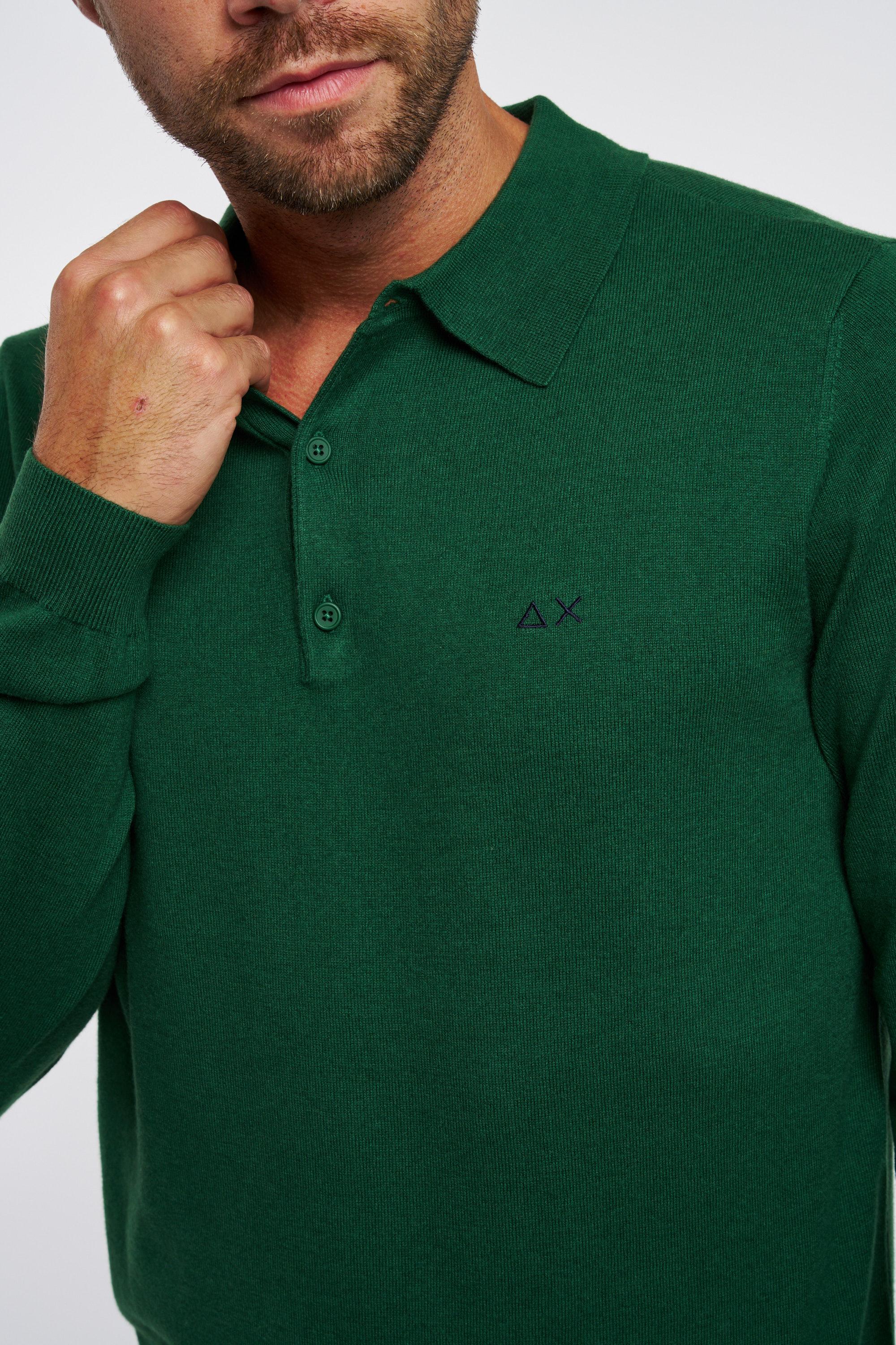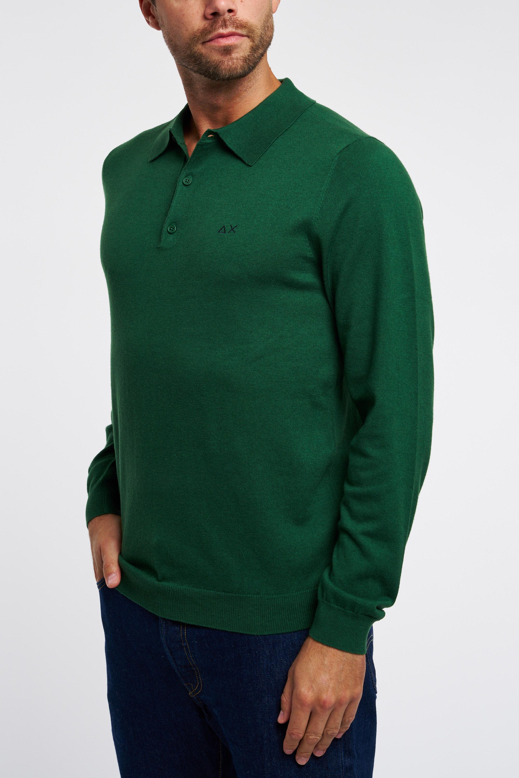 Polo in maglia maniche lunghe con colletto e chiusura tre bottoni sulla parte frontale. Il modello è alto 187cm e indossa la taglia L.