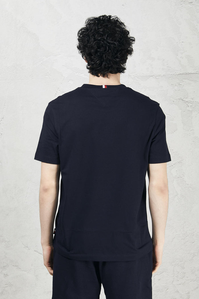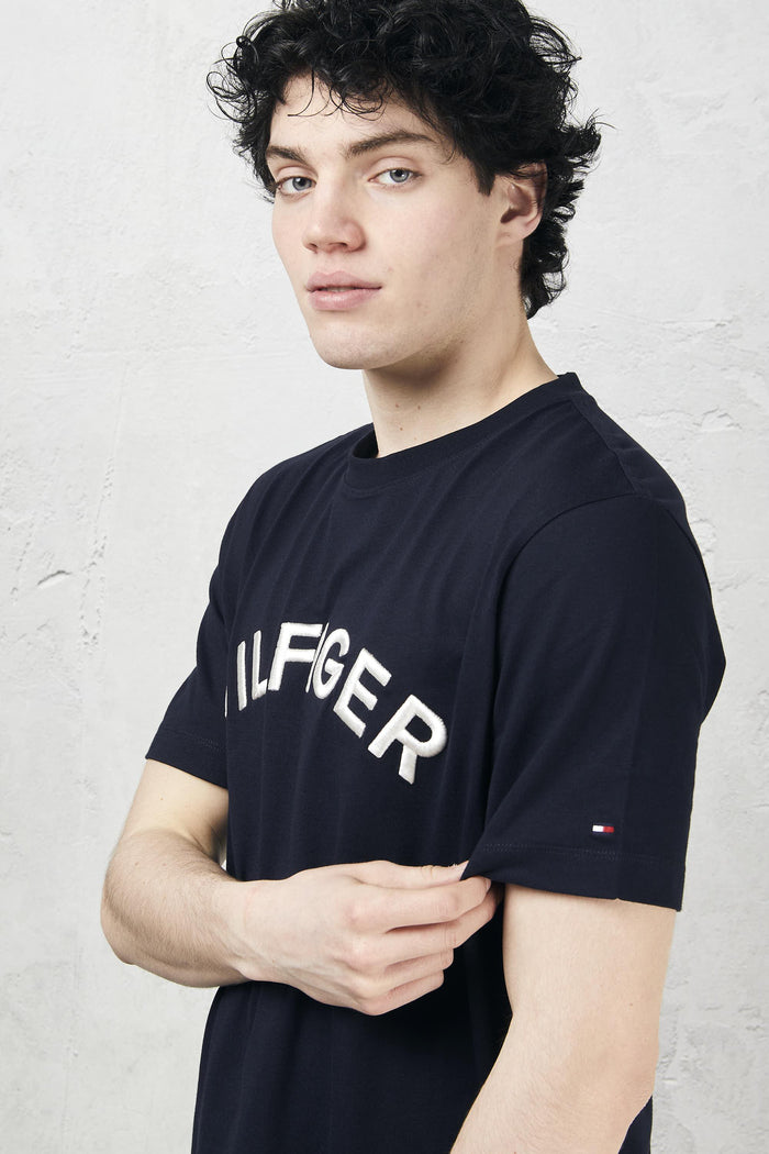 T-shirt maniche corte con logo Tommy Hilfiger Arched ricamato sul petto. Bandierina Tommy Hilfiger ricamata sul fondo della manica. Il modello è alto 187 cm e indossa la taglia L.