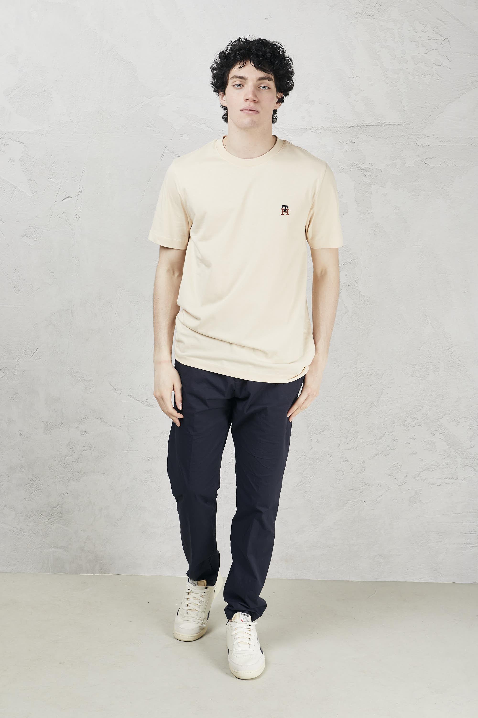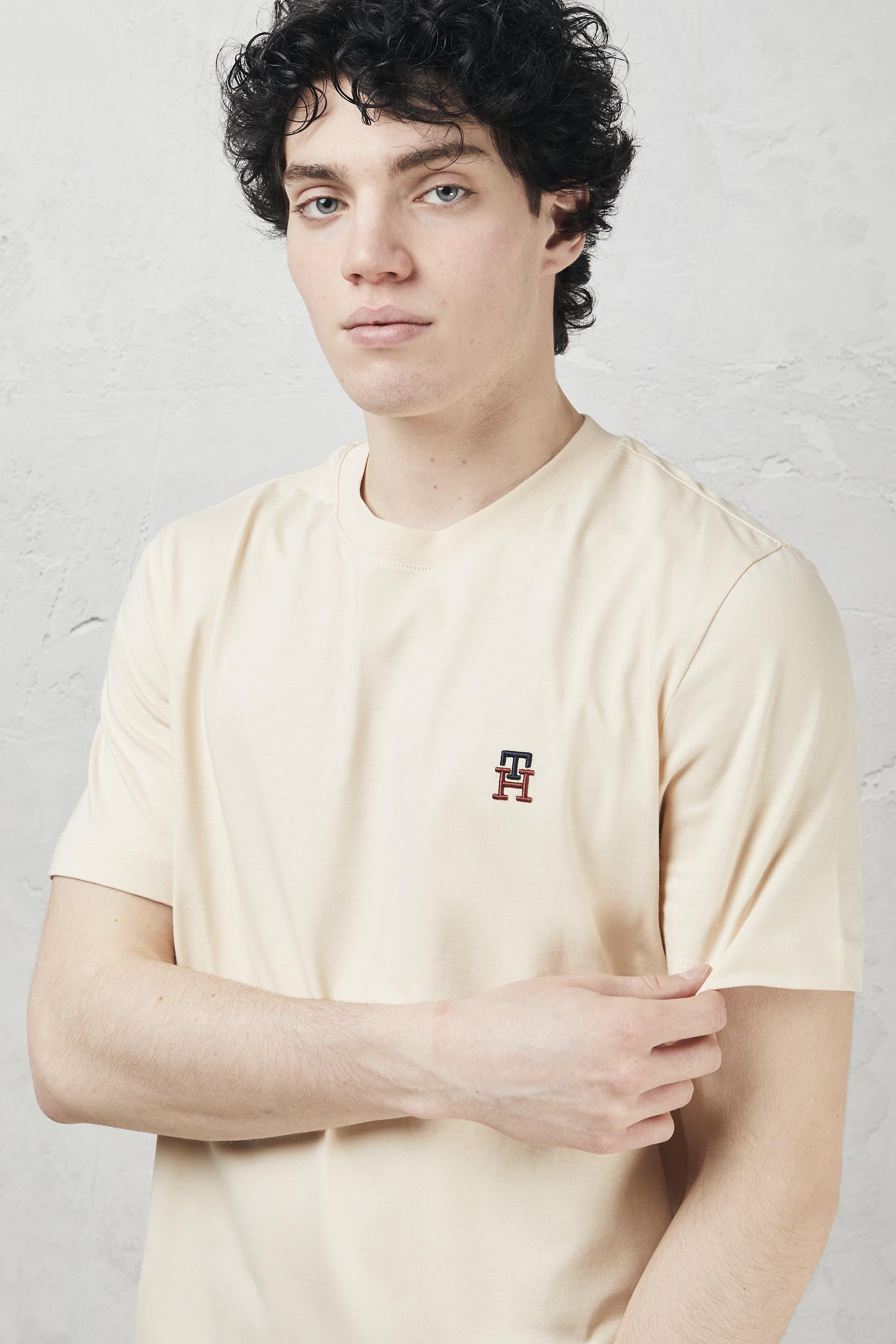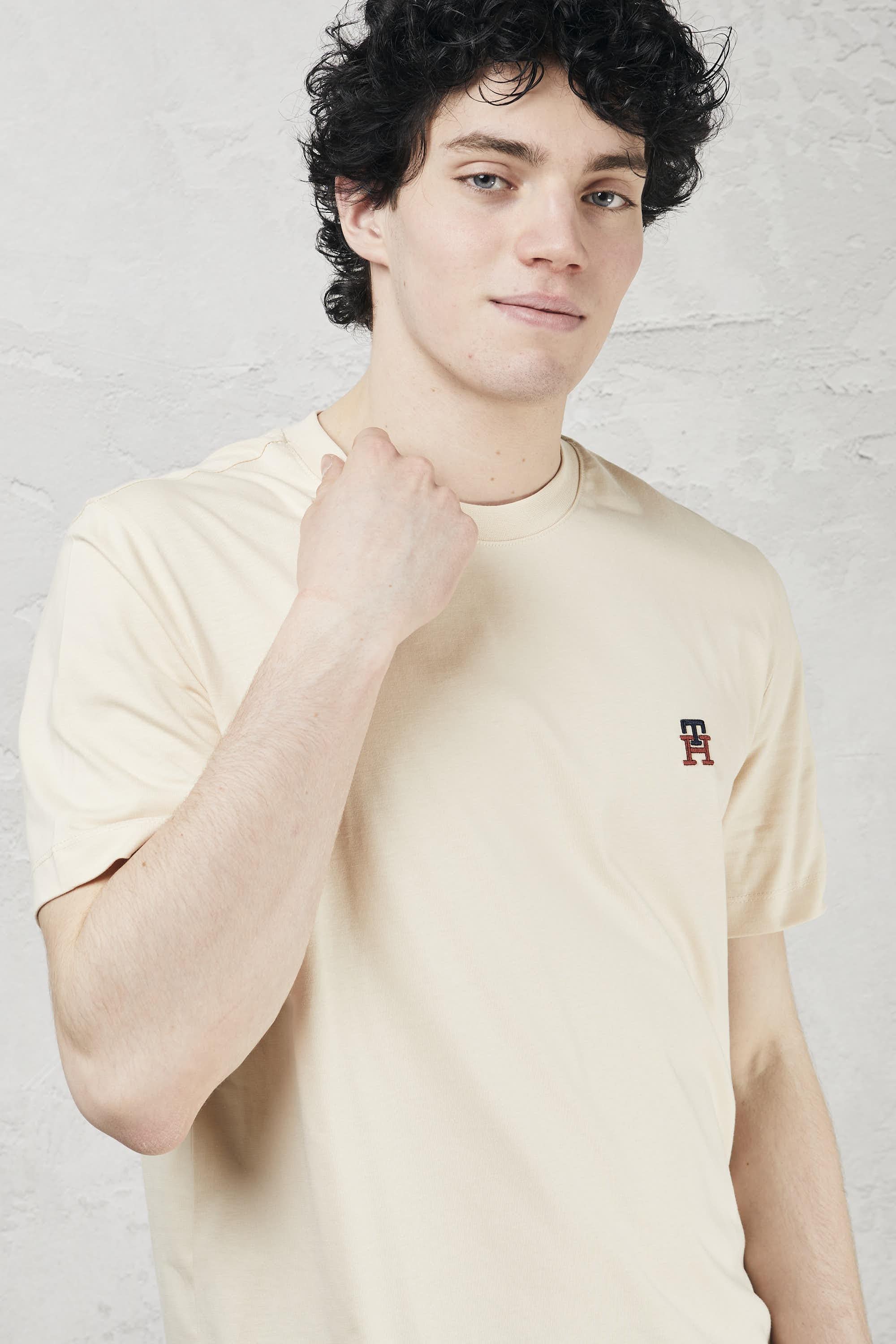 T-shirt maniche corte con monogramma TH ricamato sul petto. Bandierina Tommy Hilfiger ricamata sul fondo della manica. Il modello è alto 187 cm e indossa la taglia L.