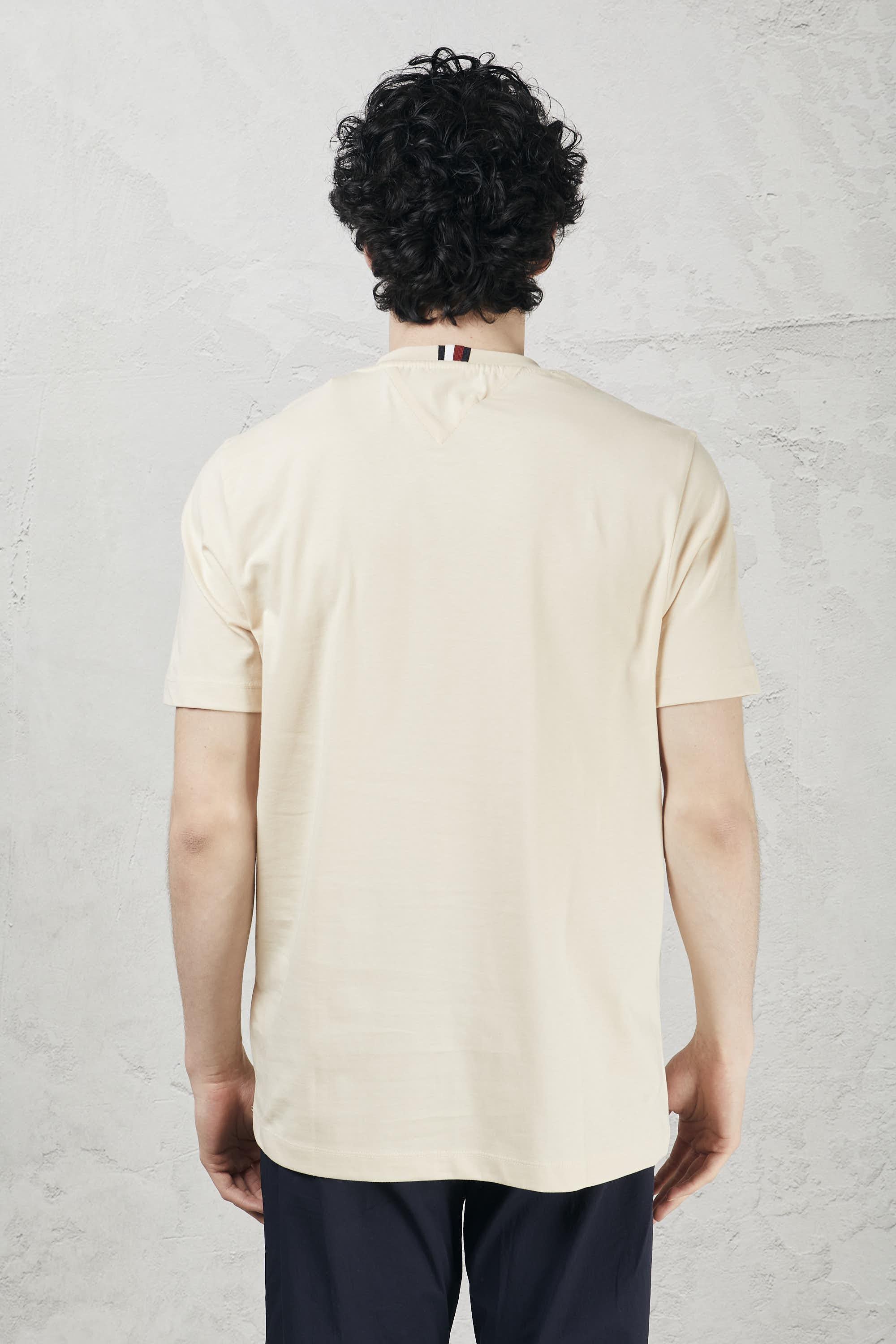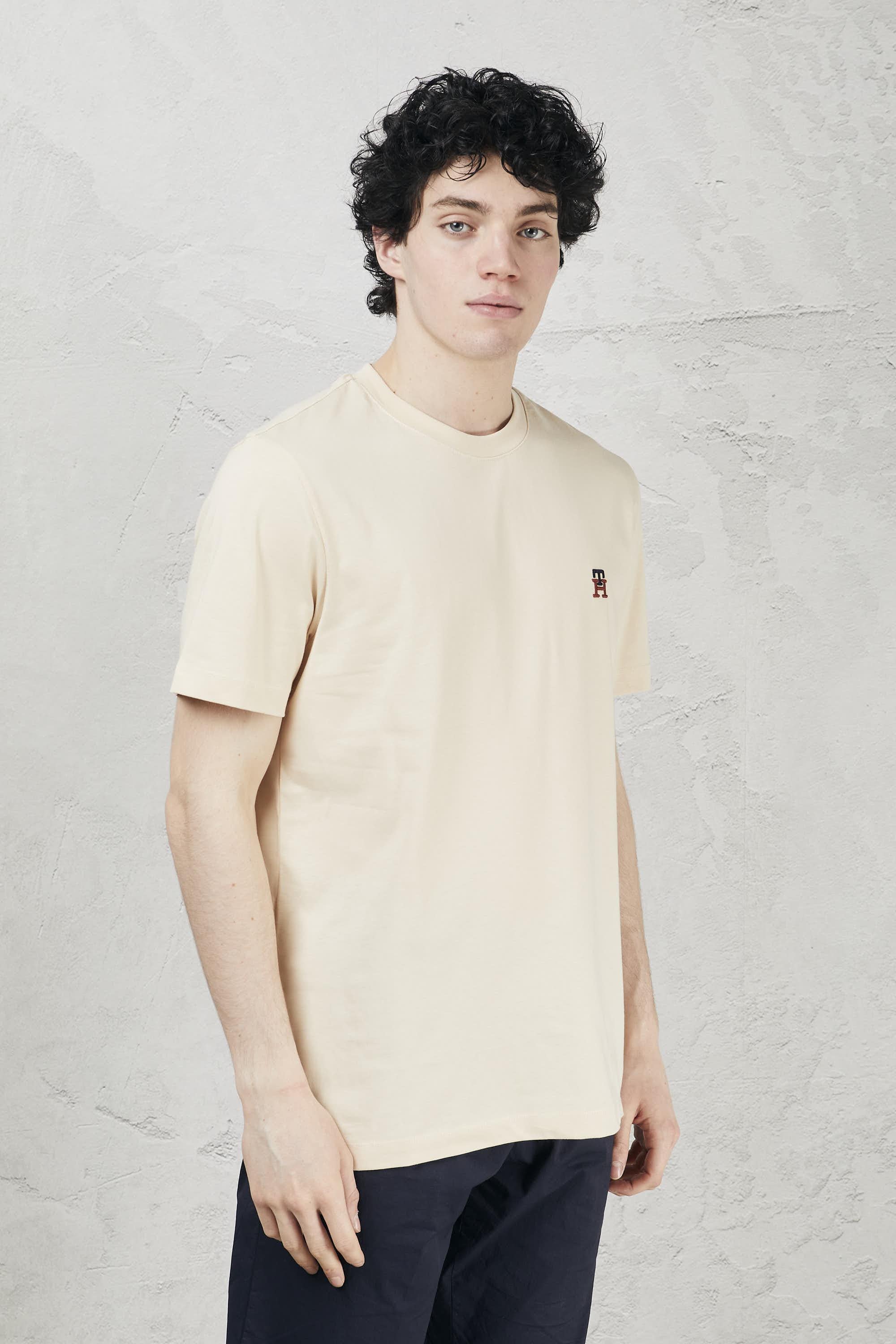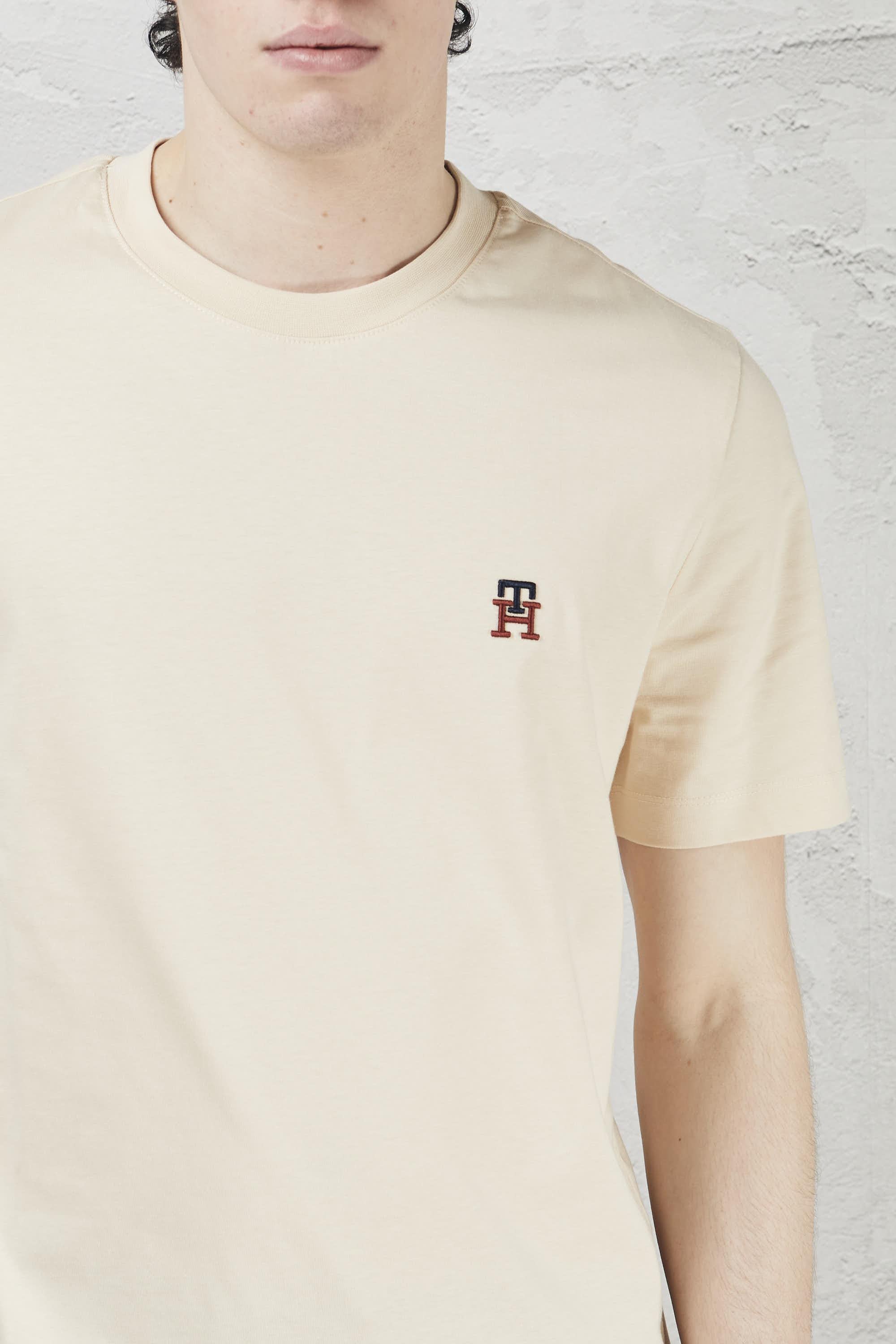 T-shirt maniche corte con monogramma TH ricamato sul petto. Bandierina Tommy Hilfiger ricamata sul fondo della manica. Il modello è alto 187 cm e indossa la taglia L.
