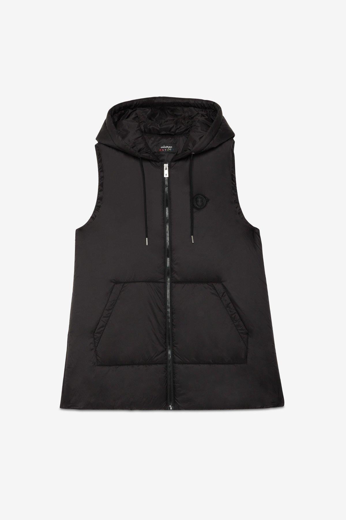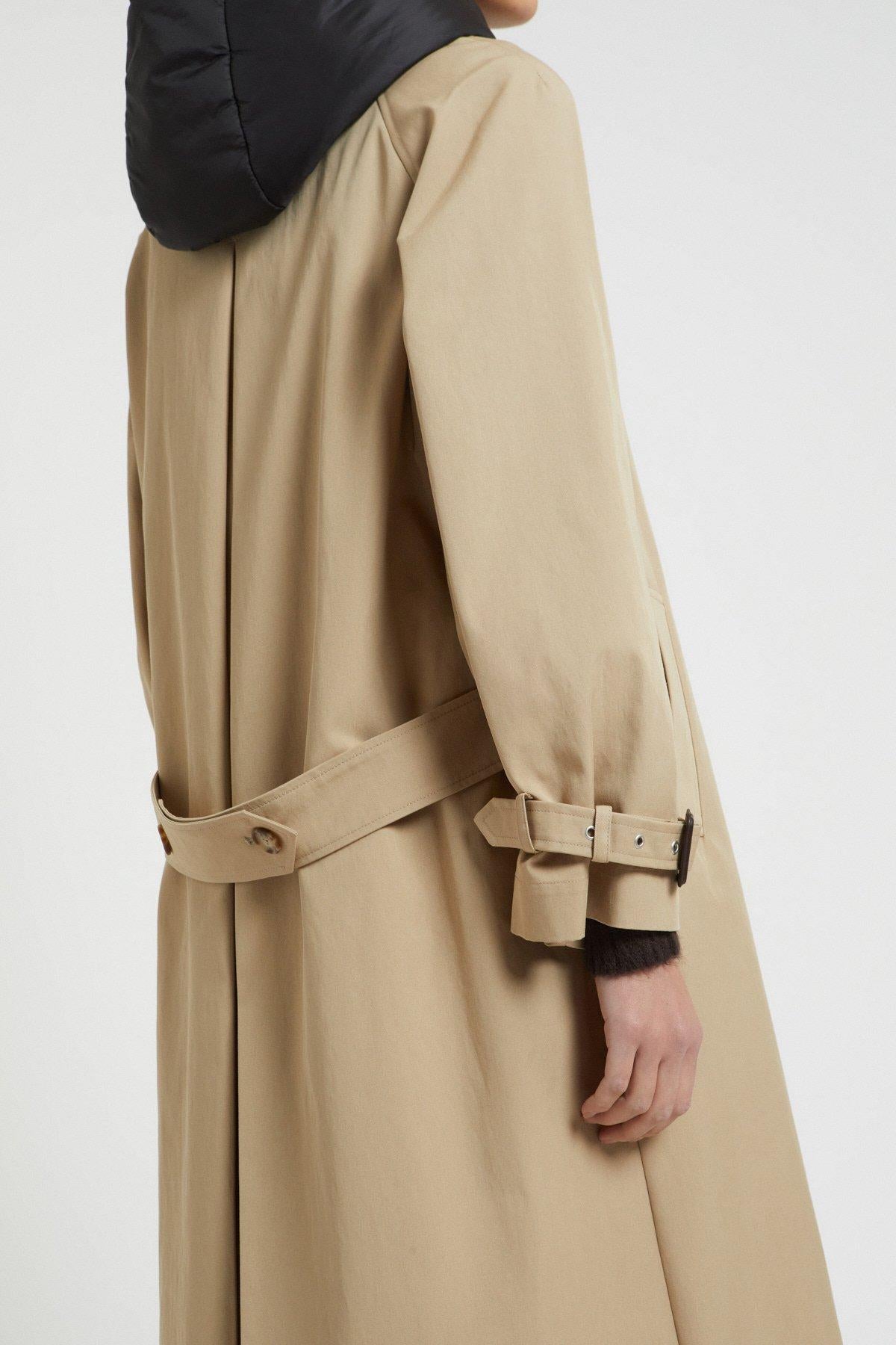 Capospalla composto da due pezzi staccabili. Trench lungo e gilet con cappuccio con imbottitura ultralight. La modella è alta 178 cm e indossa la taglia S.