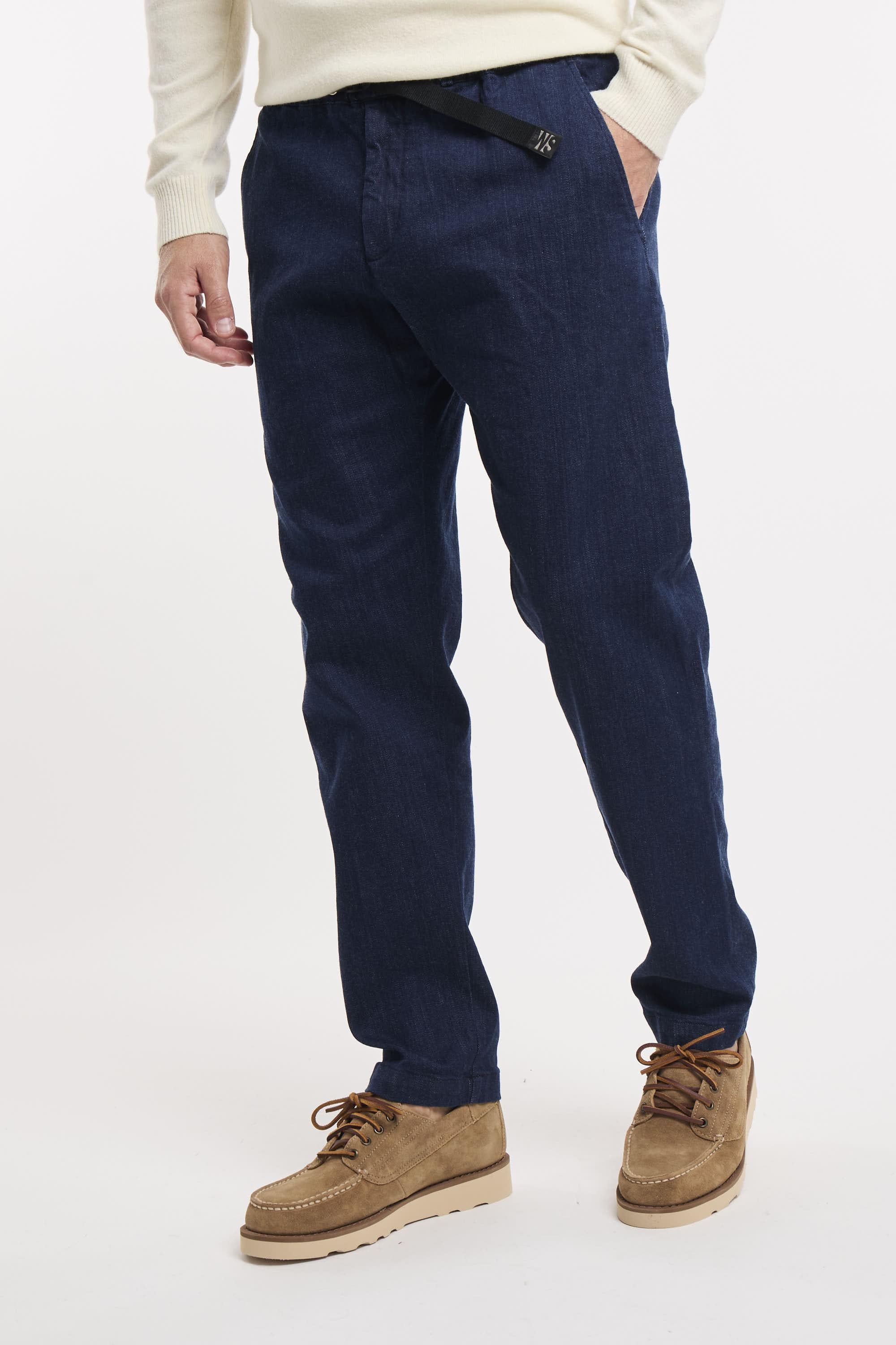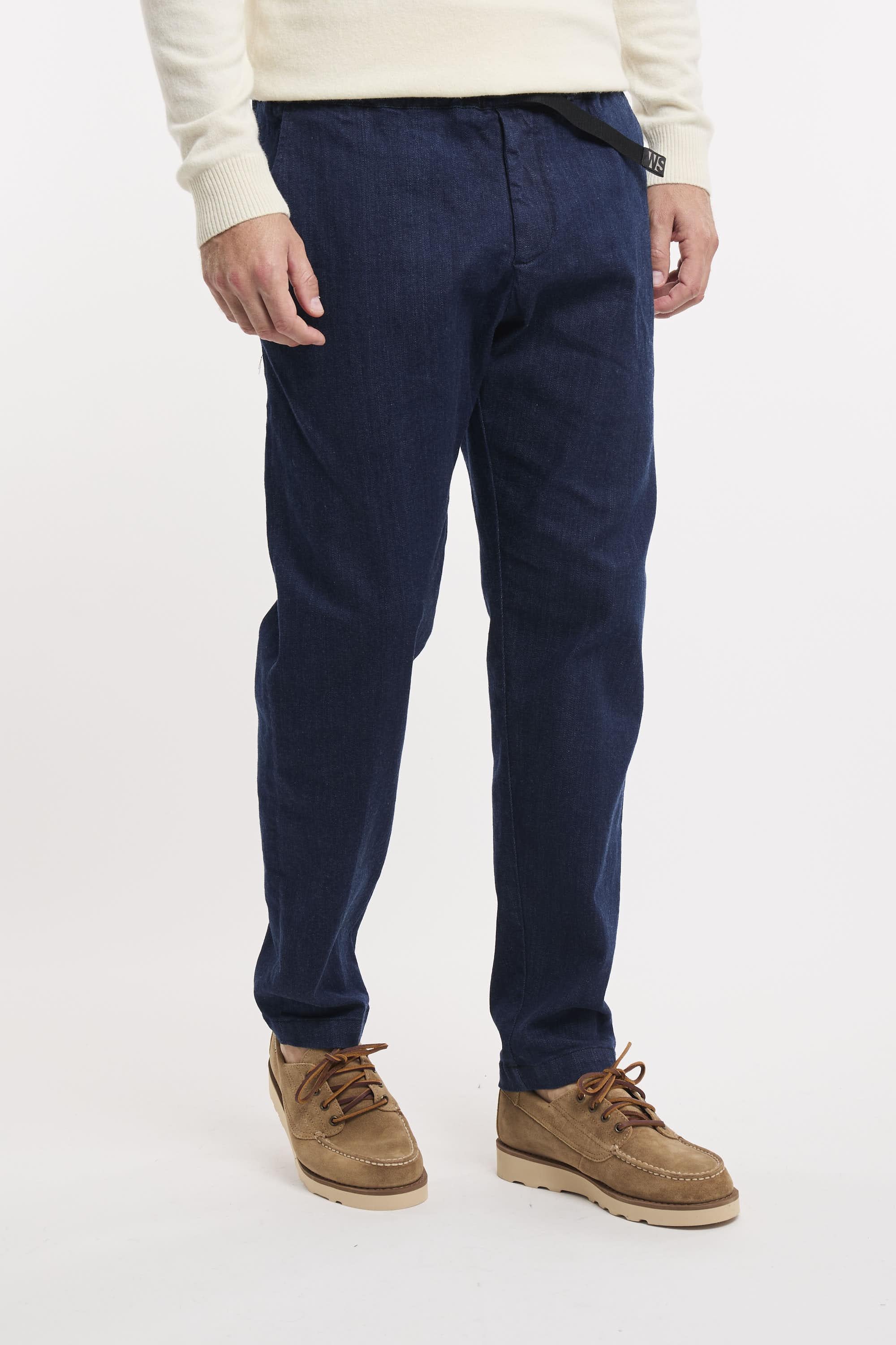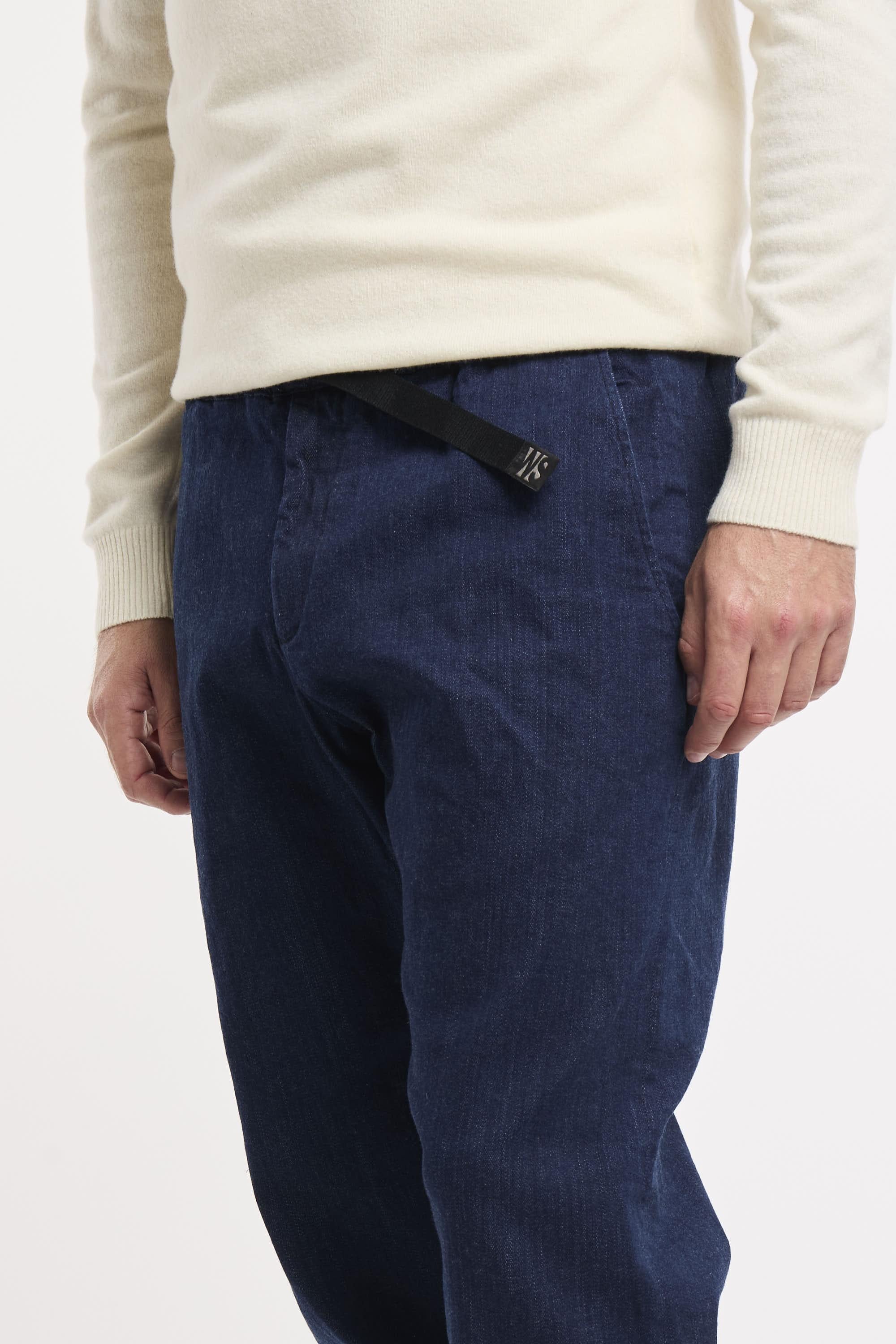 Pantalone in denim cimosato con cinturino regolabile in vita. Tasche laterali e due tasche posteriori a filo. Chiusura frontale con zip nascosta.