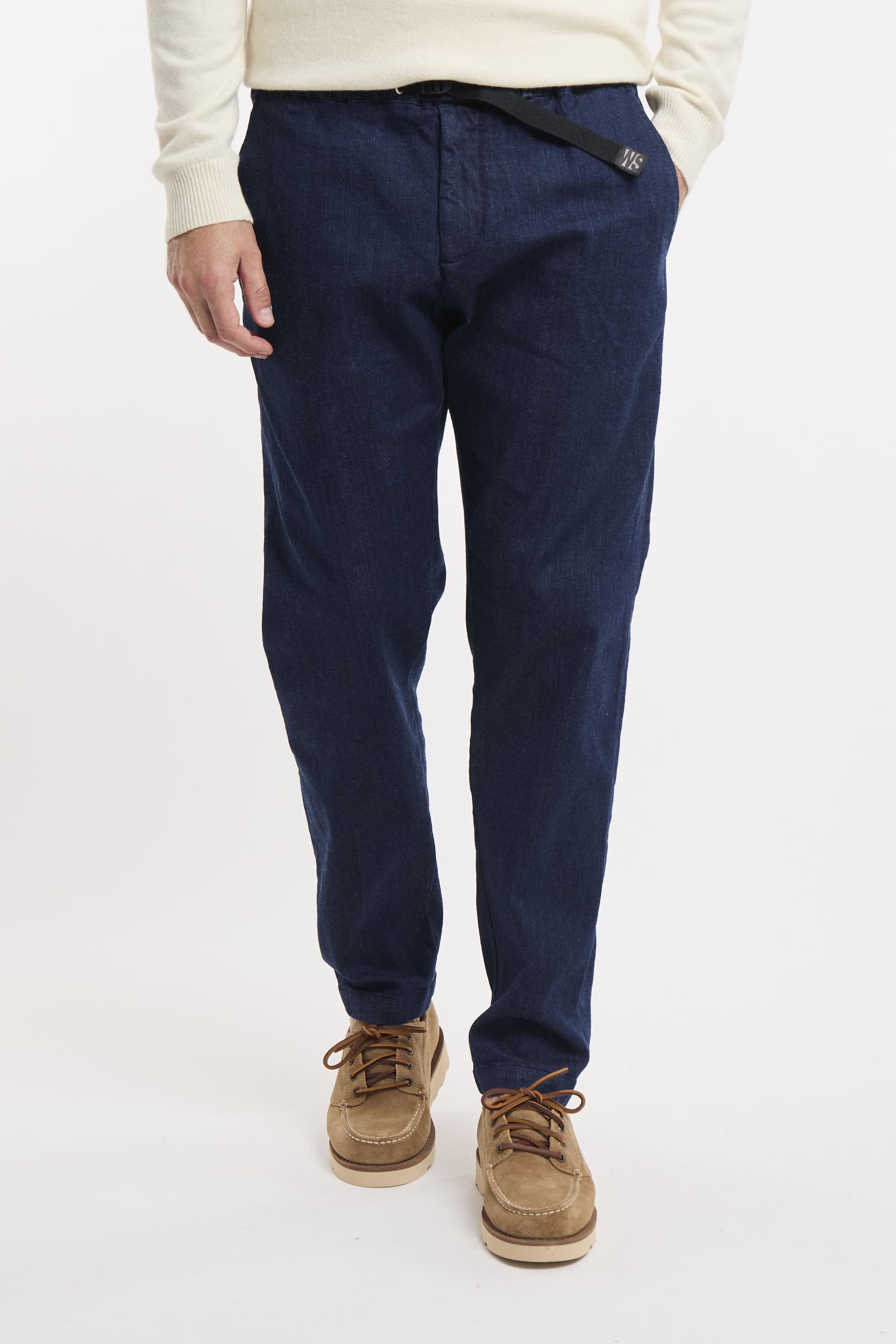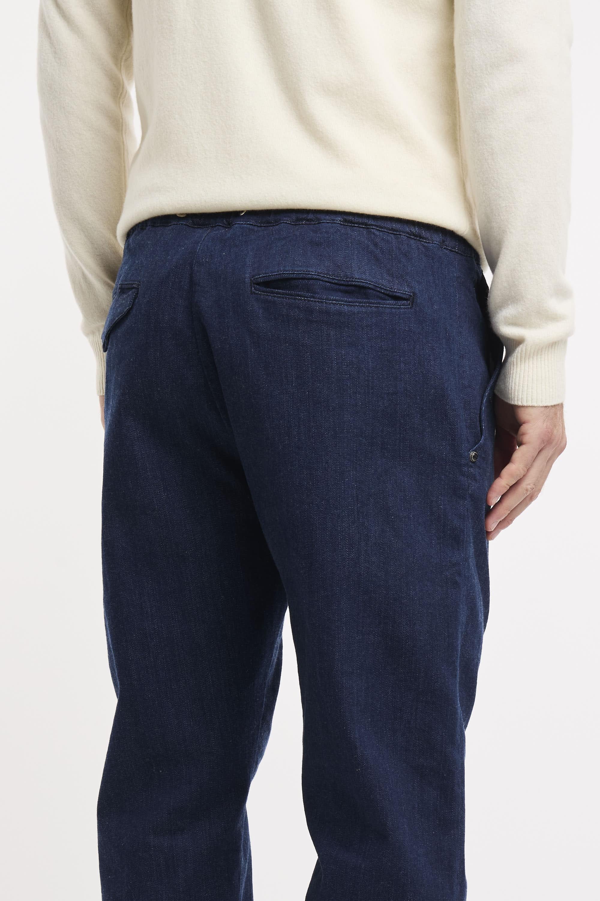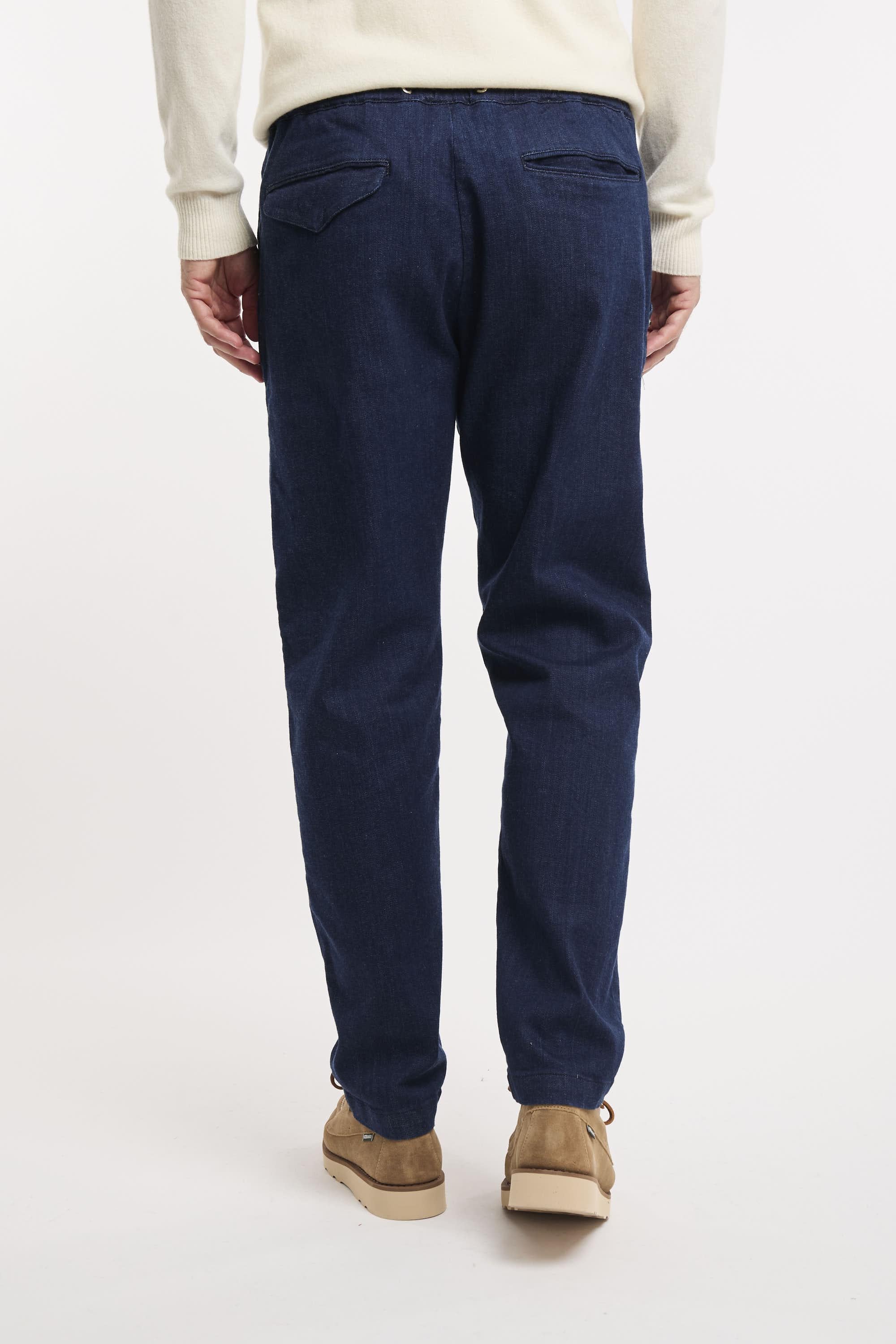 Pantalone in denim cimosato con cinturino regolabile in vita. Tasche laterali e due tasche posteriori a filo. Chiusura frontale con zip nascosta.