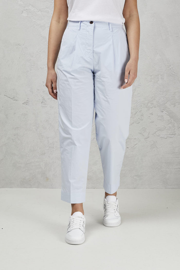 Pantalone in cotone con pences. Due tasche laterali e due tasche posteriori a filetto. Chiusura con bottone e zip. La modella è alto 178 cm e indossa la taglia 40.