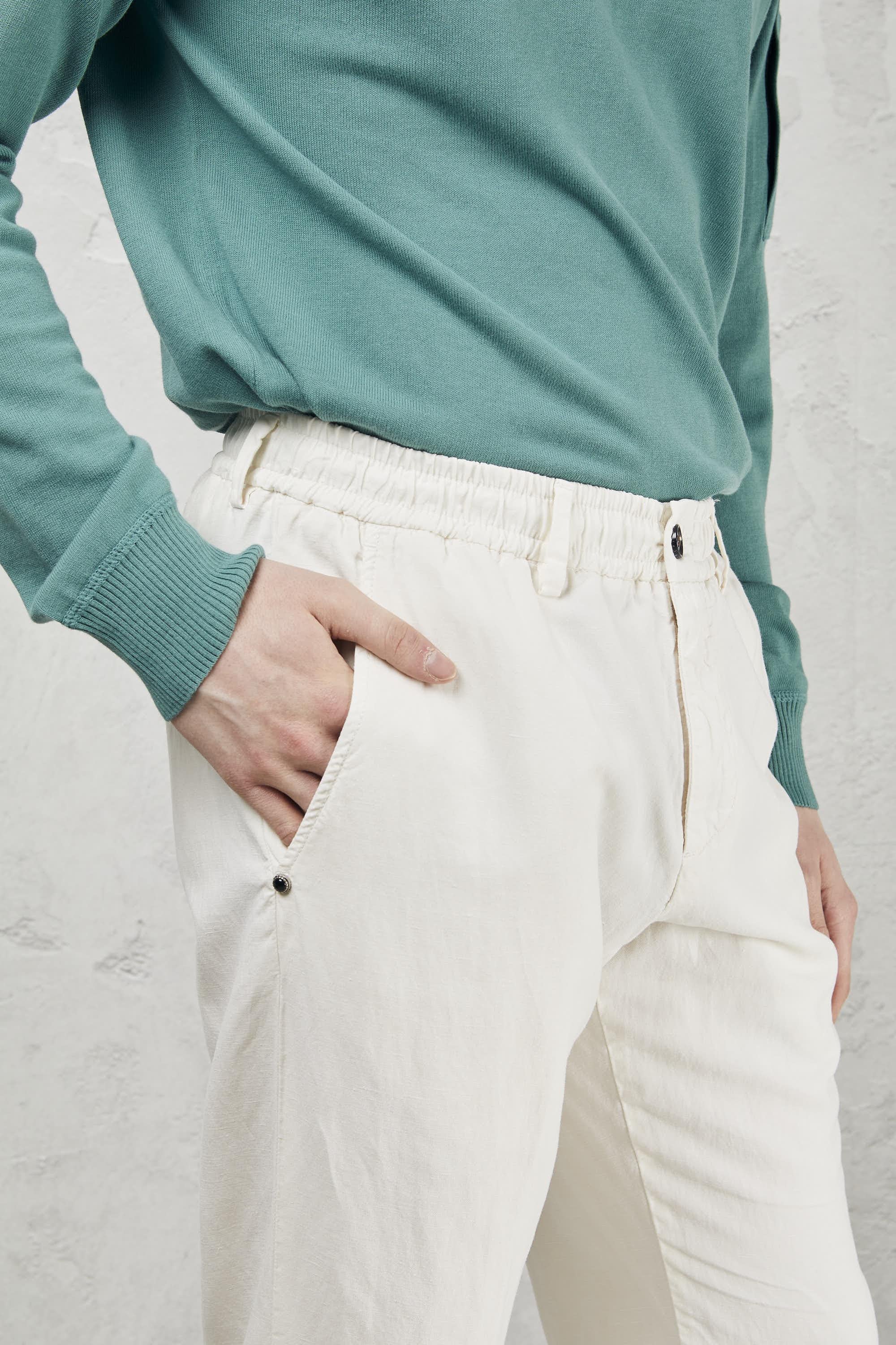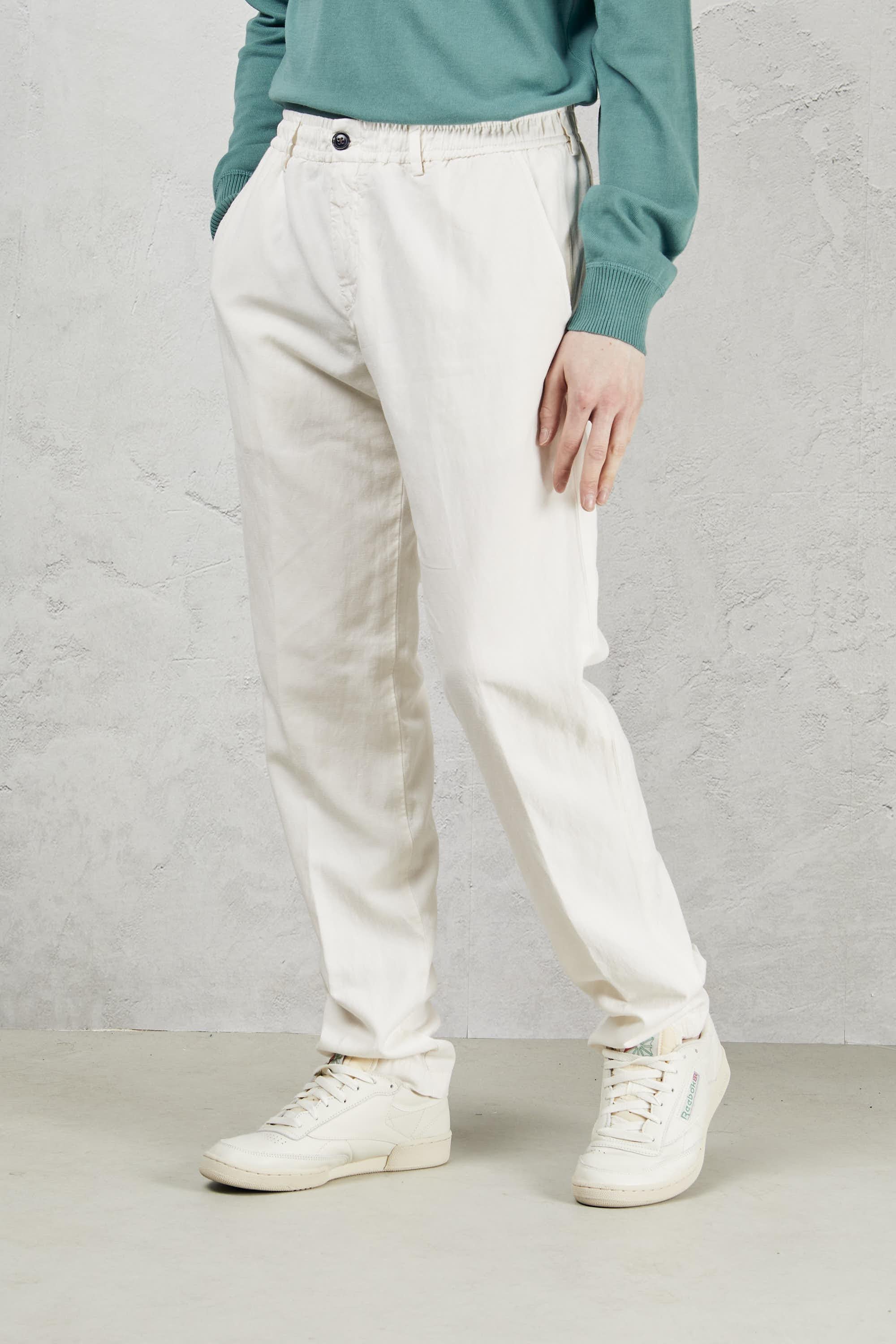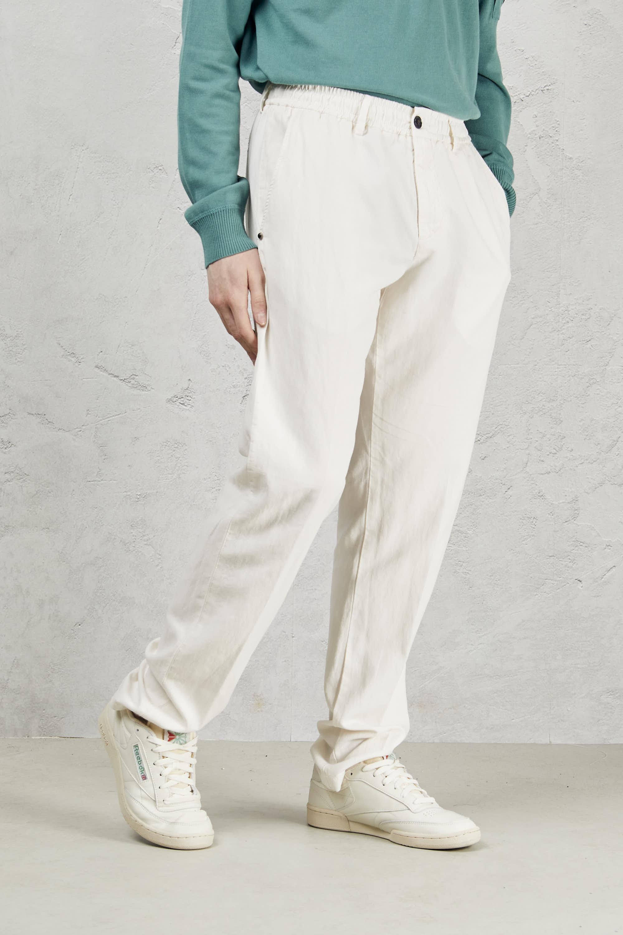 Pantalone in misto lino con vita elasticata, regular fit. Due tasche laterali e due posteriori. Chiusura frontale con bottone e zip nascosta. Il modello è alto 187cm e indossa la taglia 48.