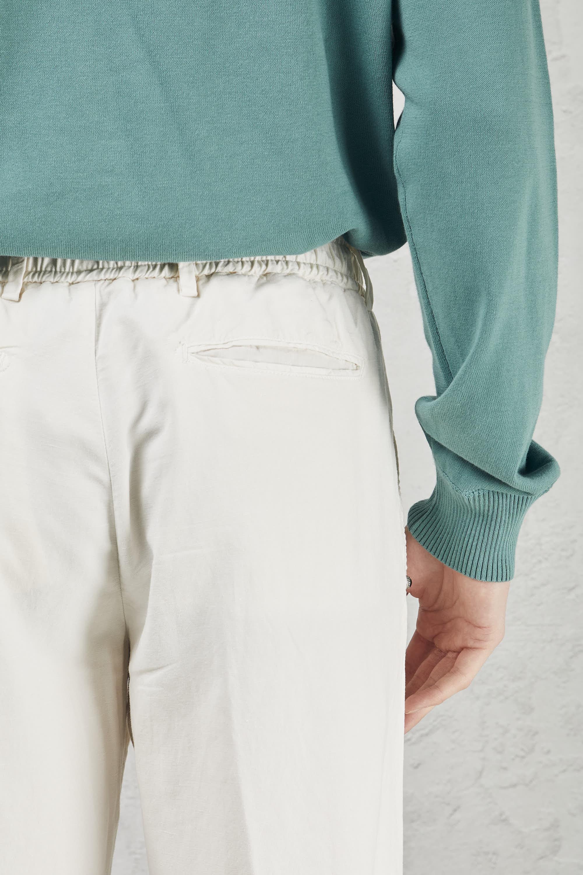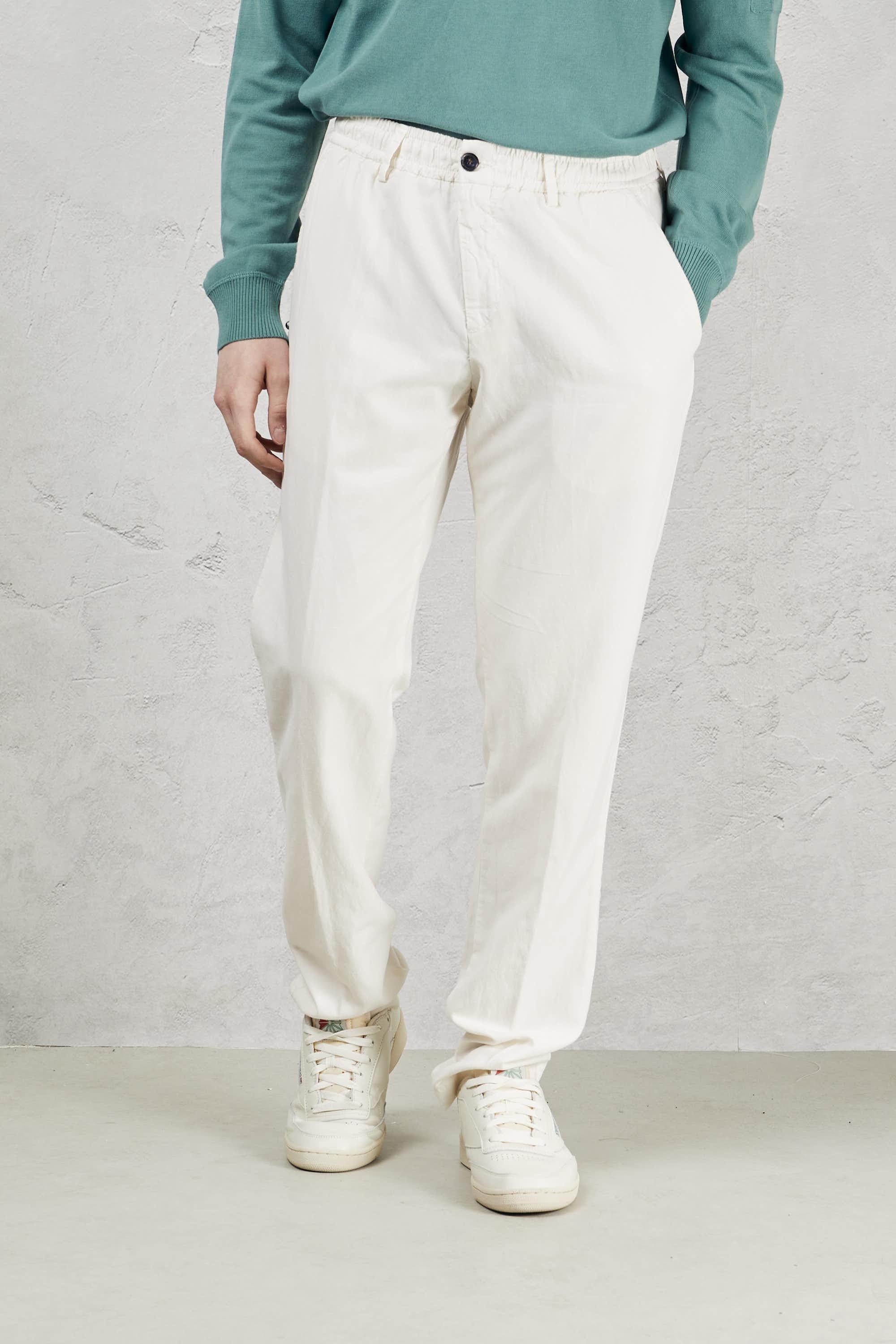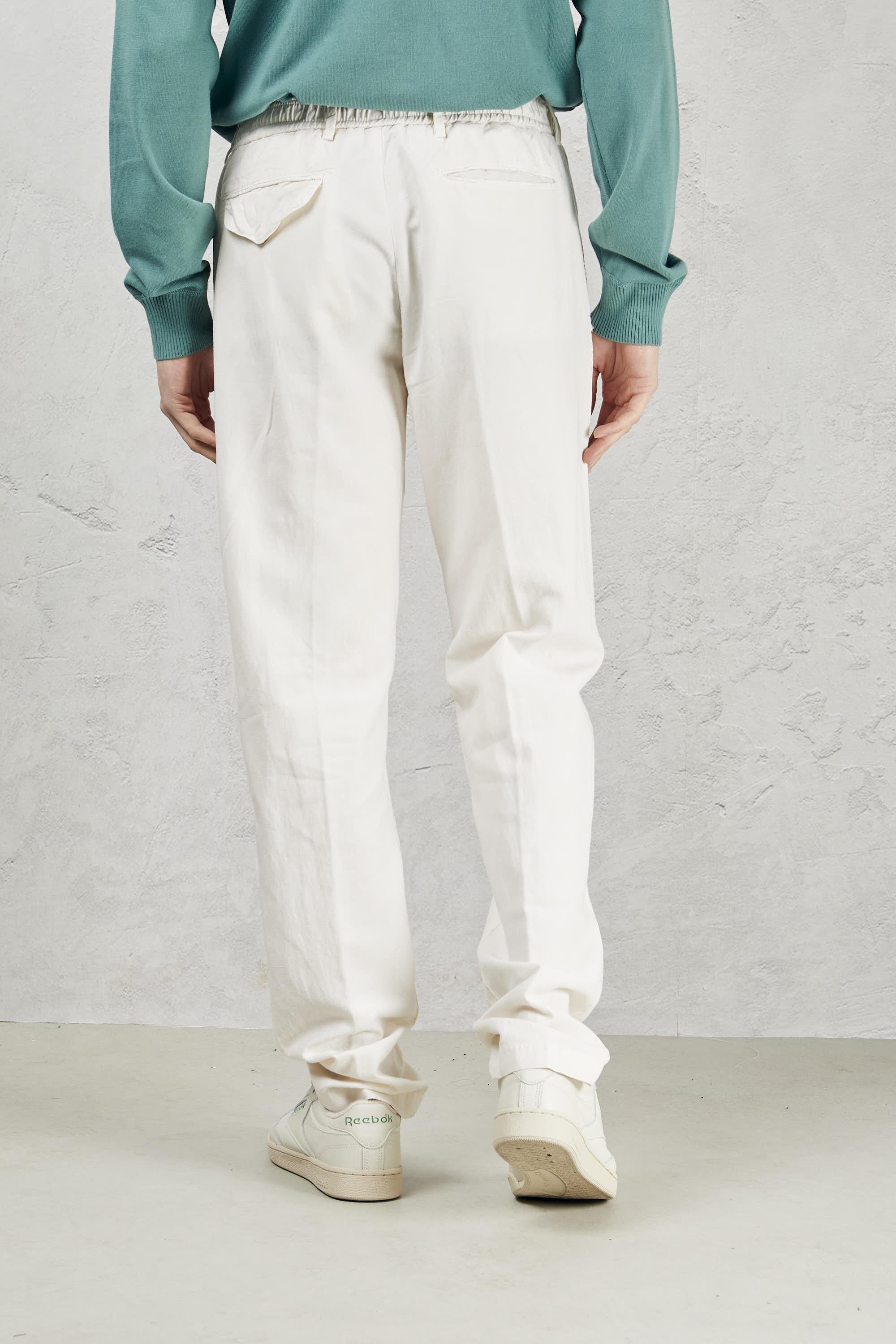 Pantalone in misto lino con vita elasticata, regular fit. Due tasche laterali e due posteriori. Chiusura frontale con bottone e zip nascosta. Il modello è alto 187cm e indossa la taglia 48.