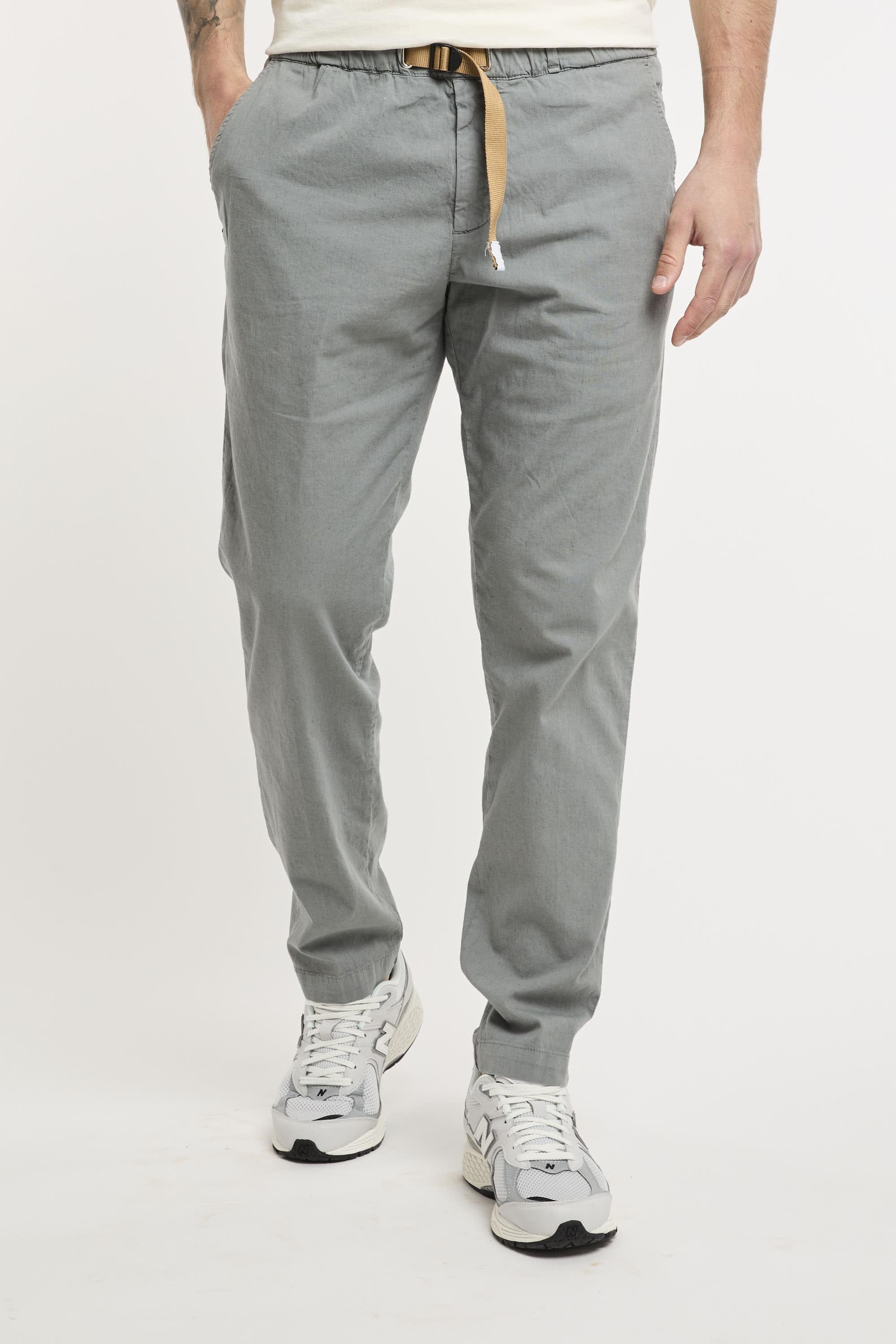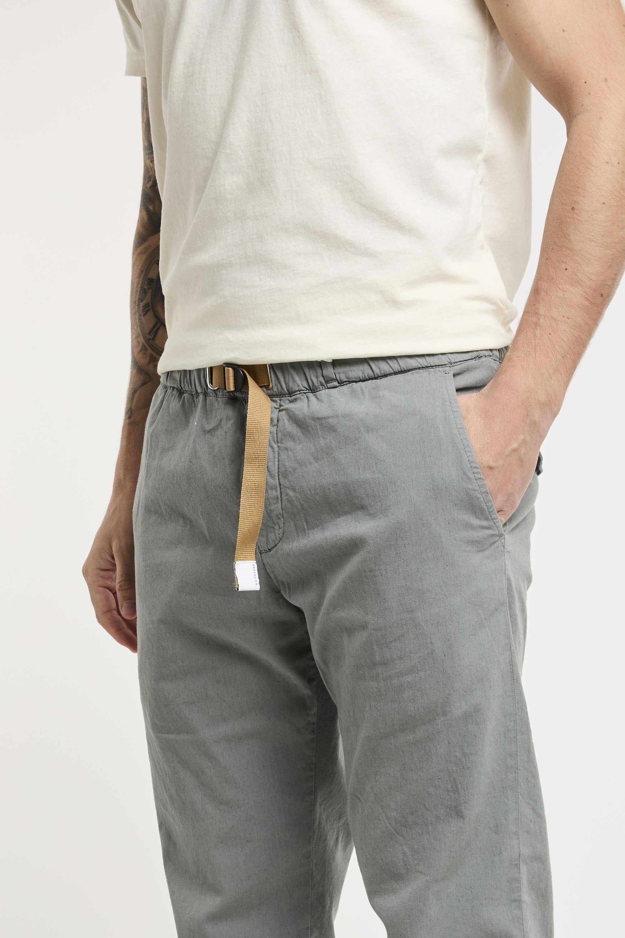 Pantalone in misto cotone e linoe con vita elasticizzata, cintura in grosgrain regolabile con fibbia sul davanti. Due tasche laterali e due posteriori. Chiusura frontale con zip nascosta. Il modello è alto 187cm e indossa la taglia 48.