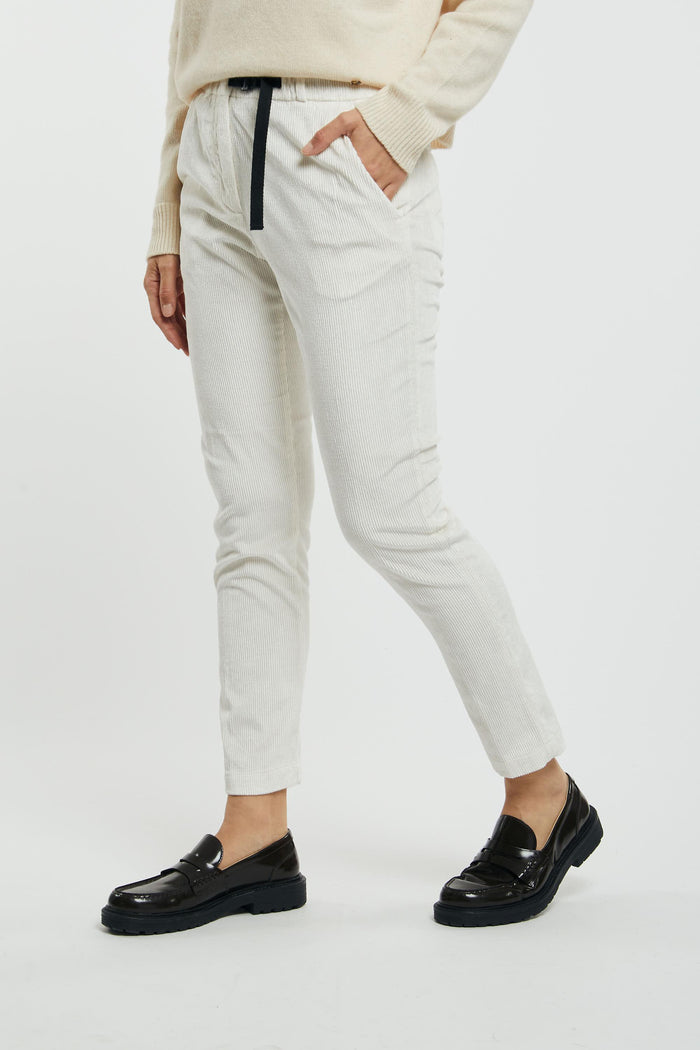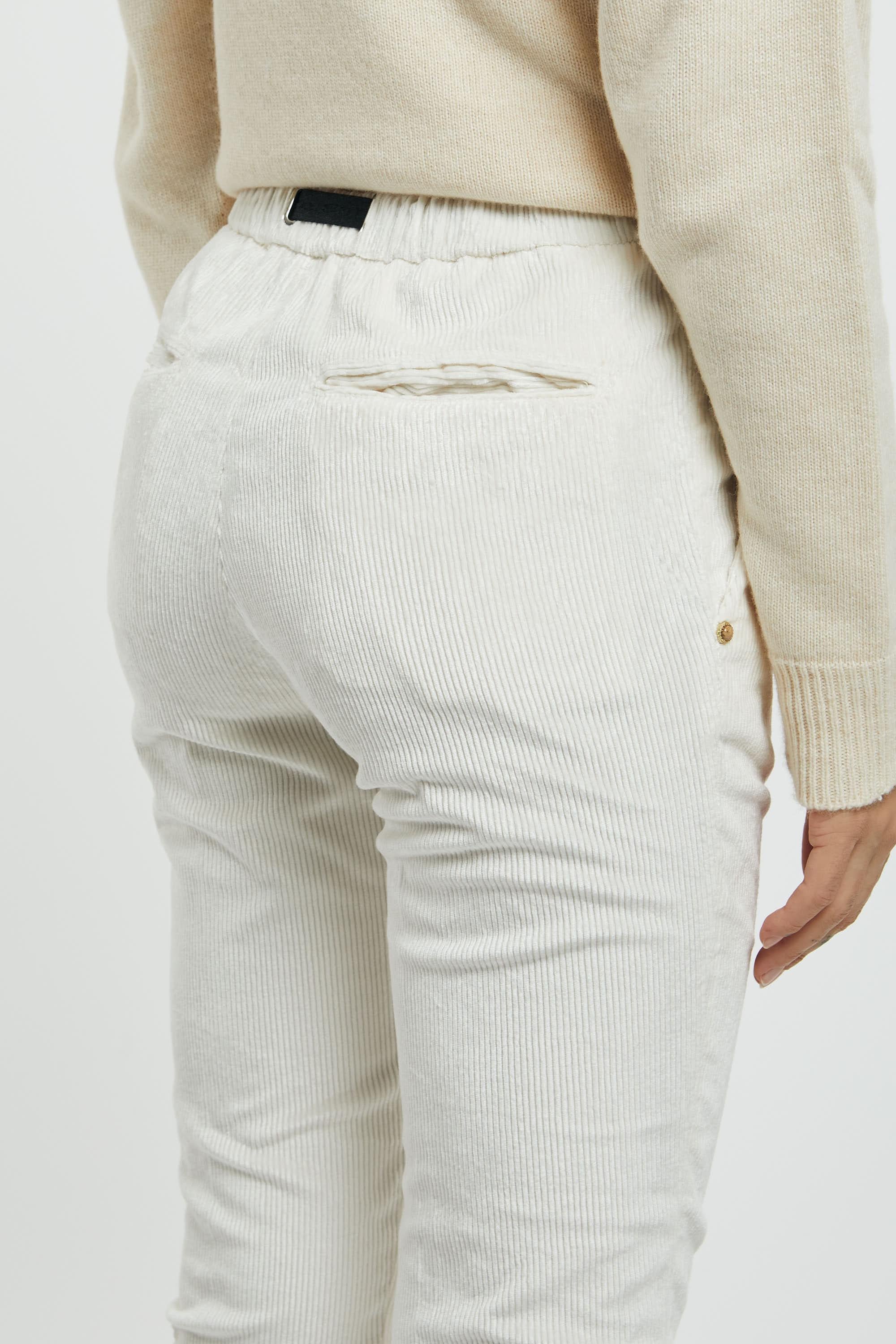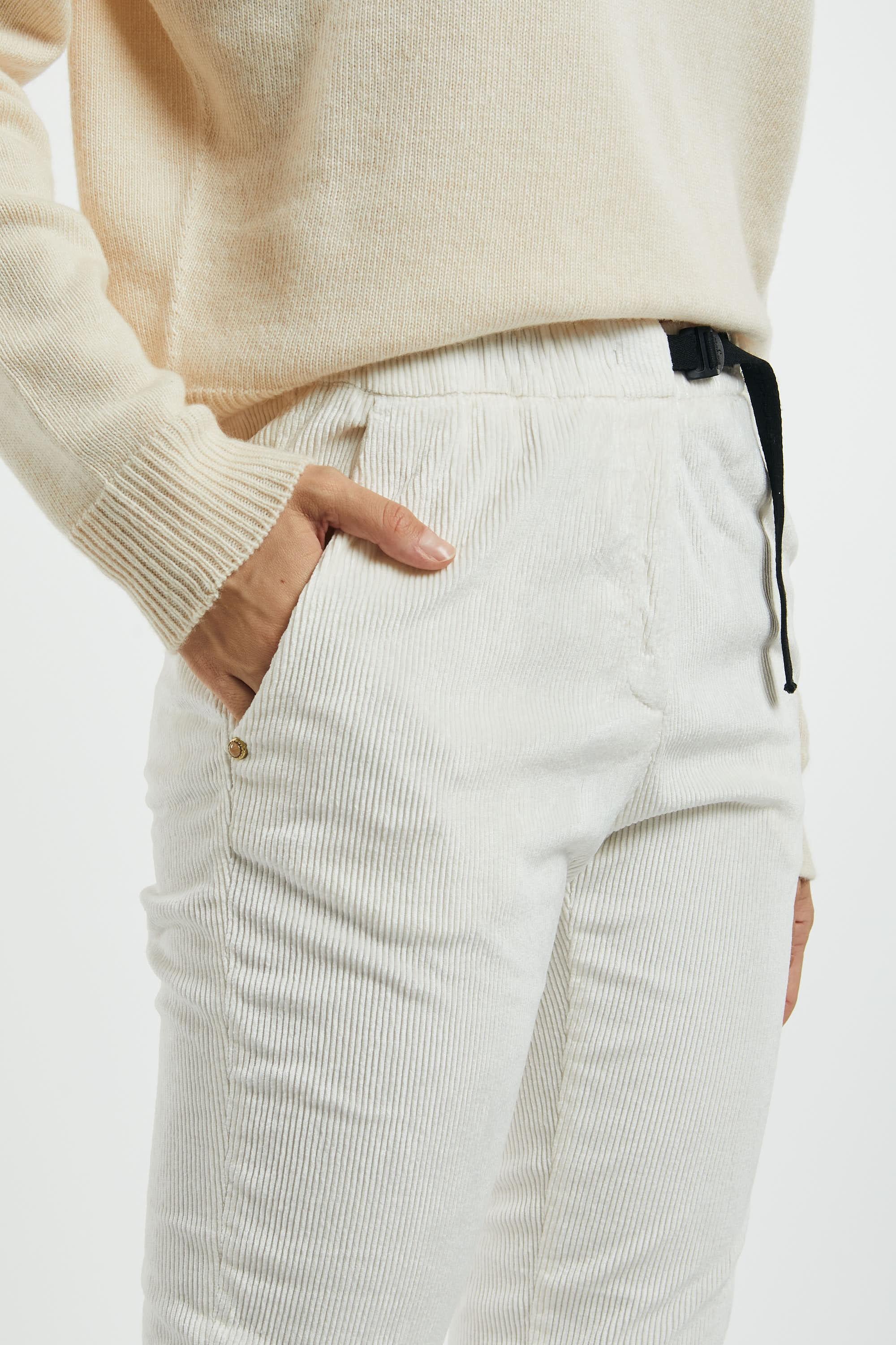 Pantalone in misto cotone di velluto millerighe con cinturino regolabile in vita. Tasche laterali e due tasche posteriori a filo. Chiusura frontale con zip nascosta.