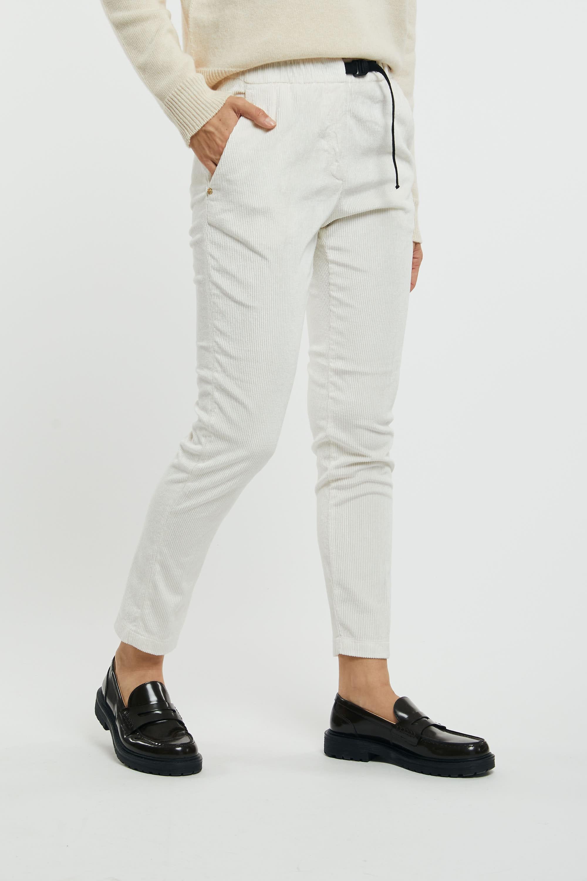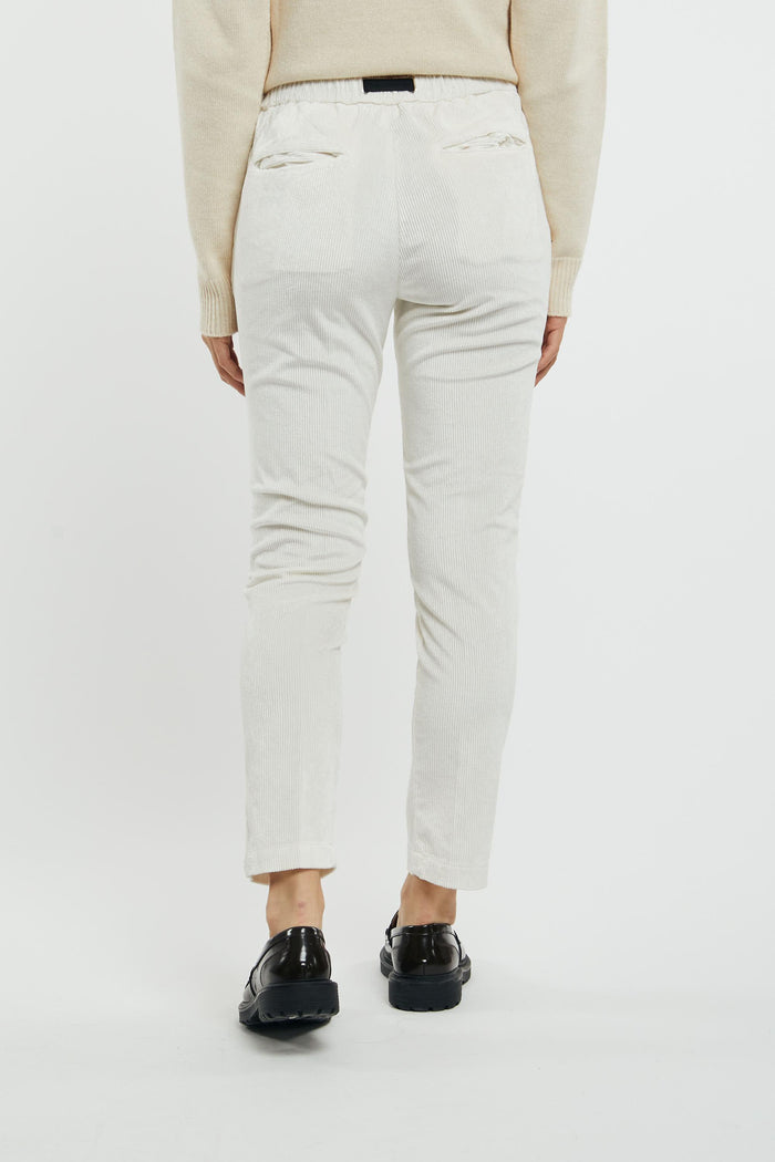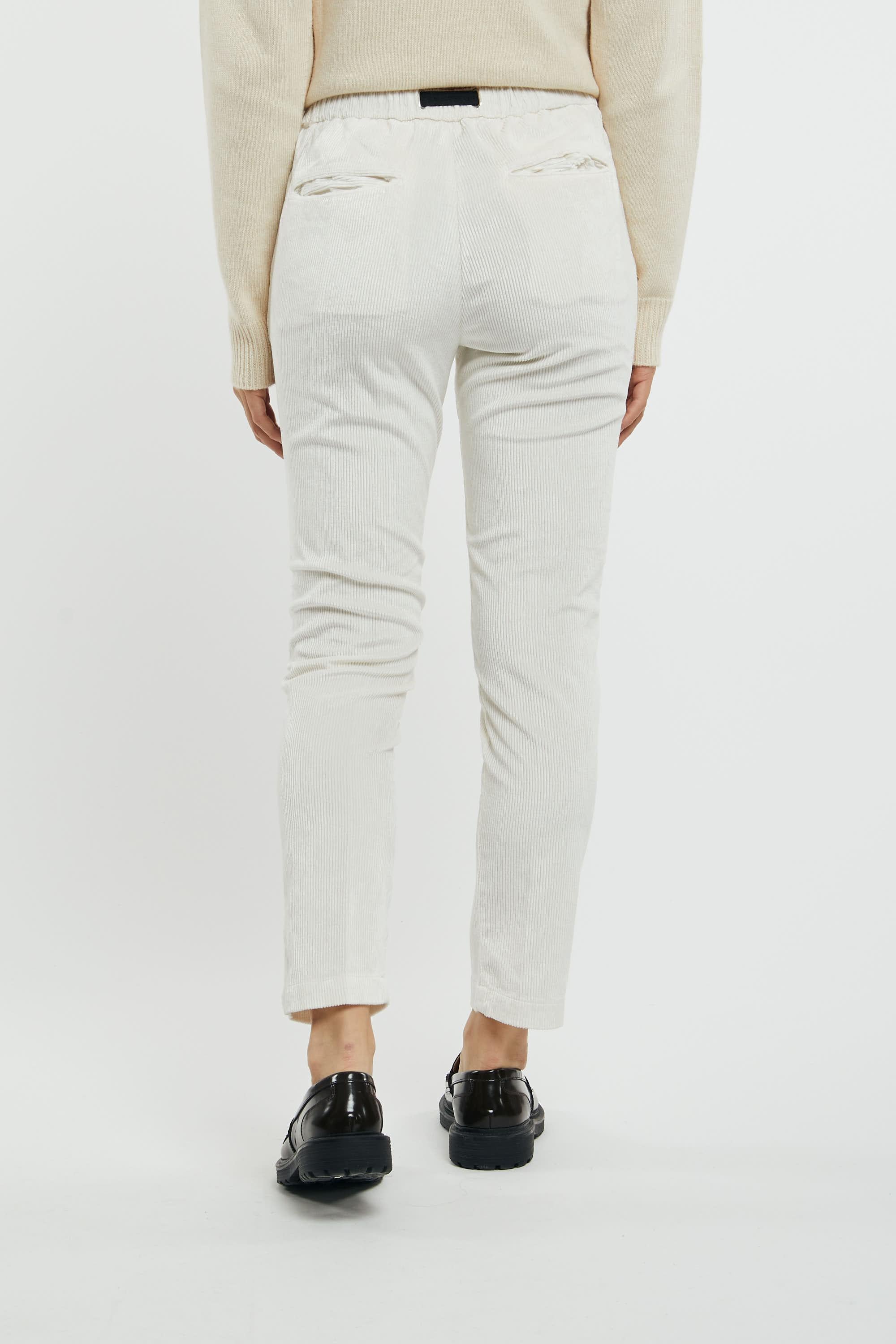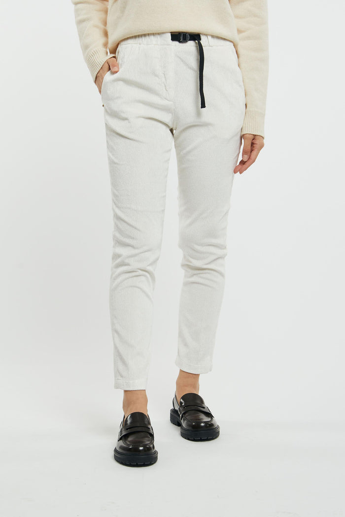 Pantalone in misto cotone di velluto millerighe con cinturino regolabile in vita. Tasche laterali e due tasche posteriori a filo. Chiusura frontale con zip nascosta.